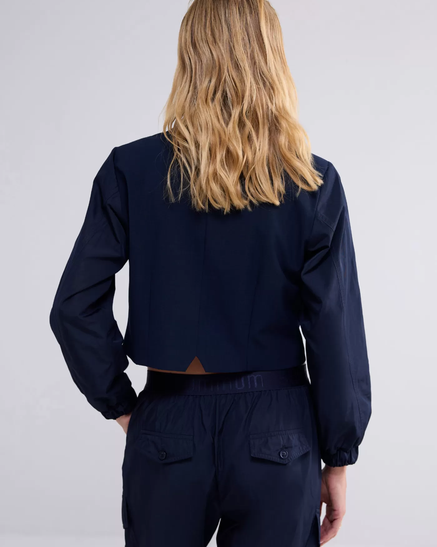 Korte blazer met reverskraag en mouwen van taft stof met elastische boorden als manchet. De blazer heeft een enkele rij knopen en een borstzakje. reverskraag taft mouwen getailleerde fit enkele knopenrij