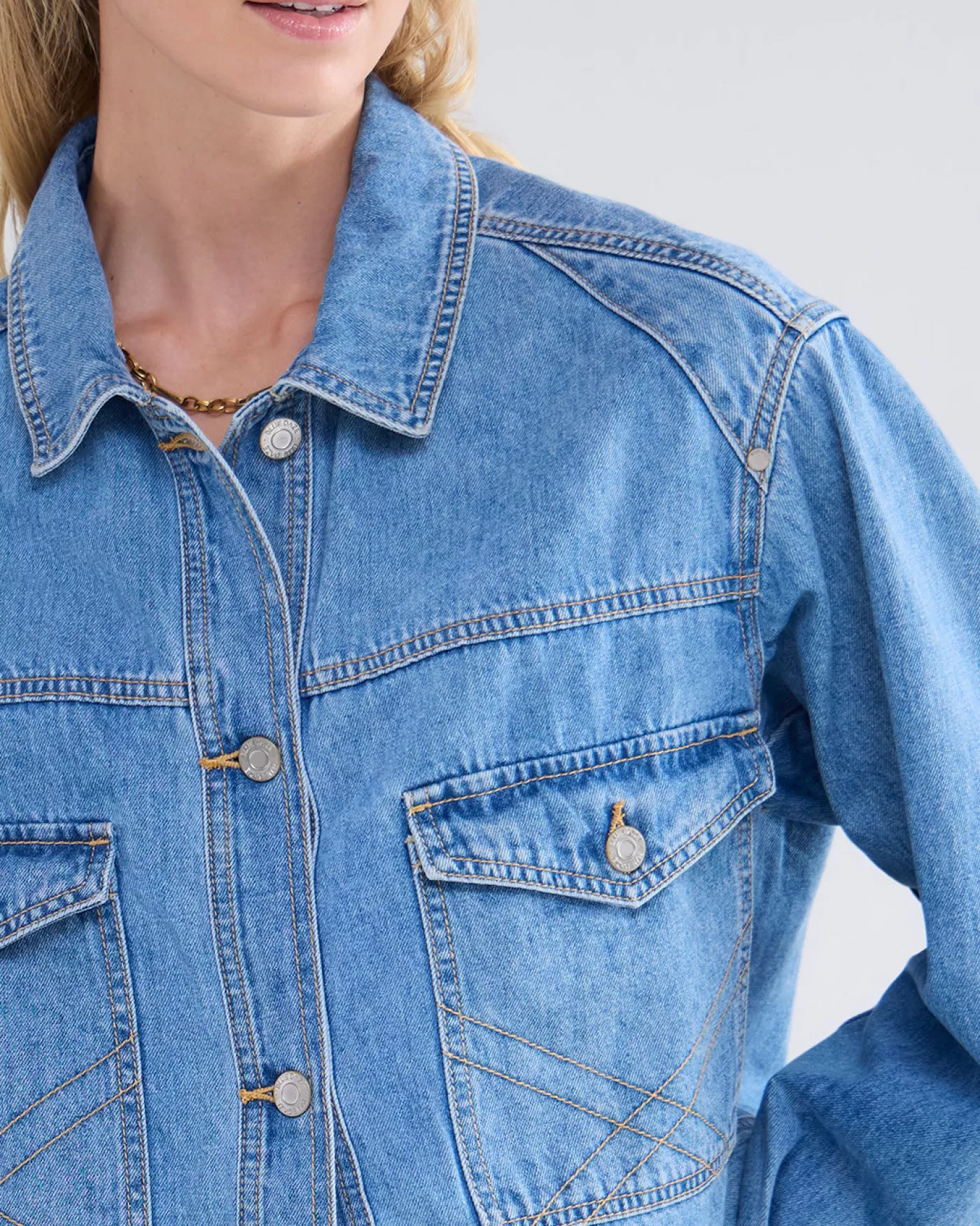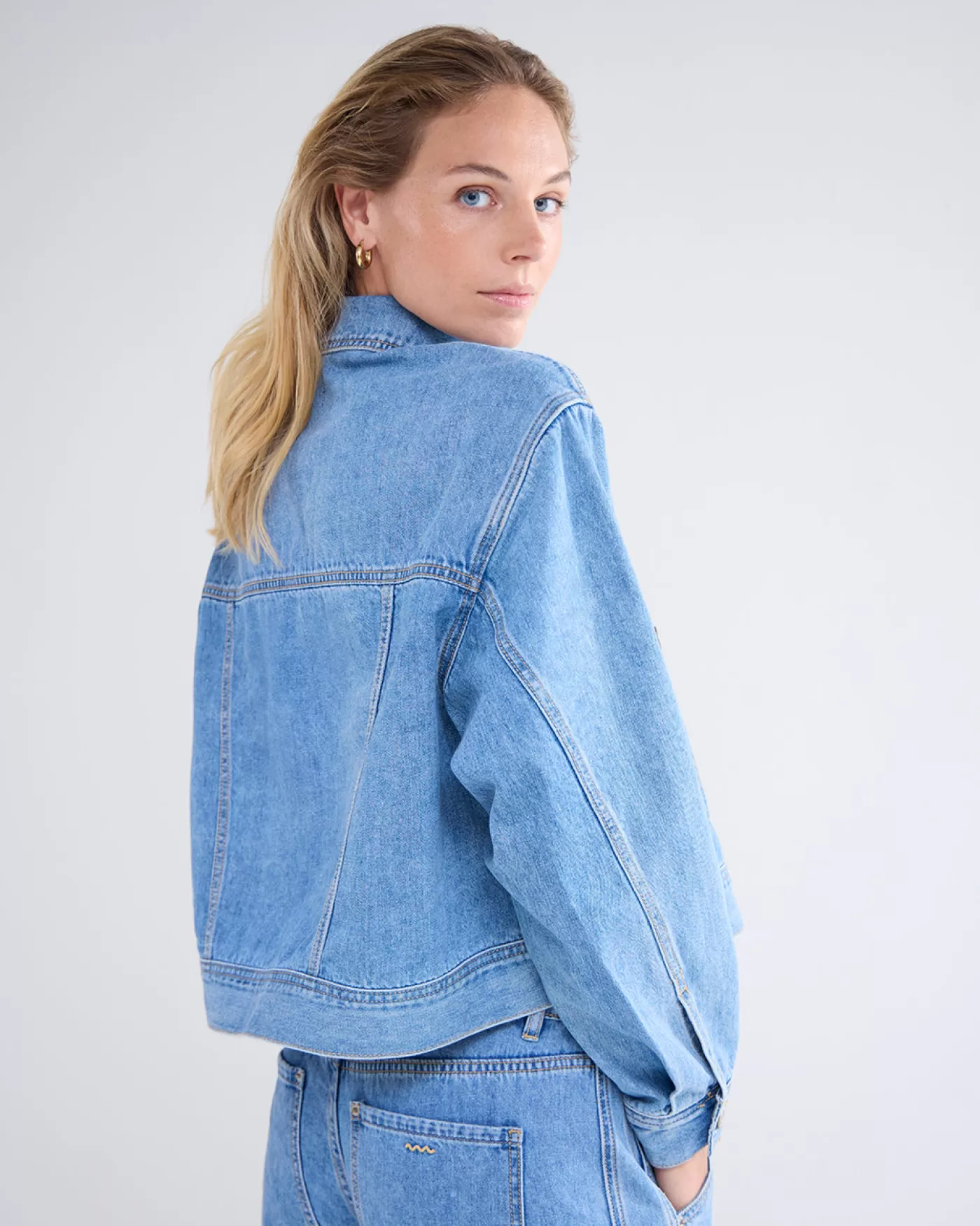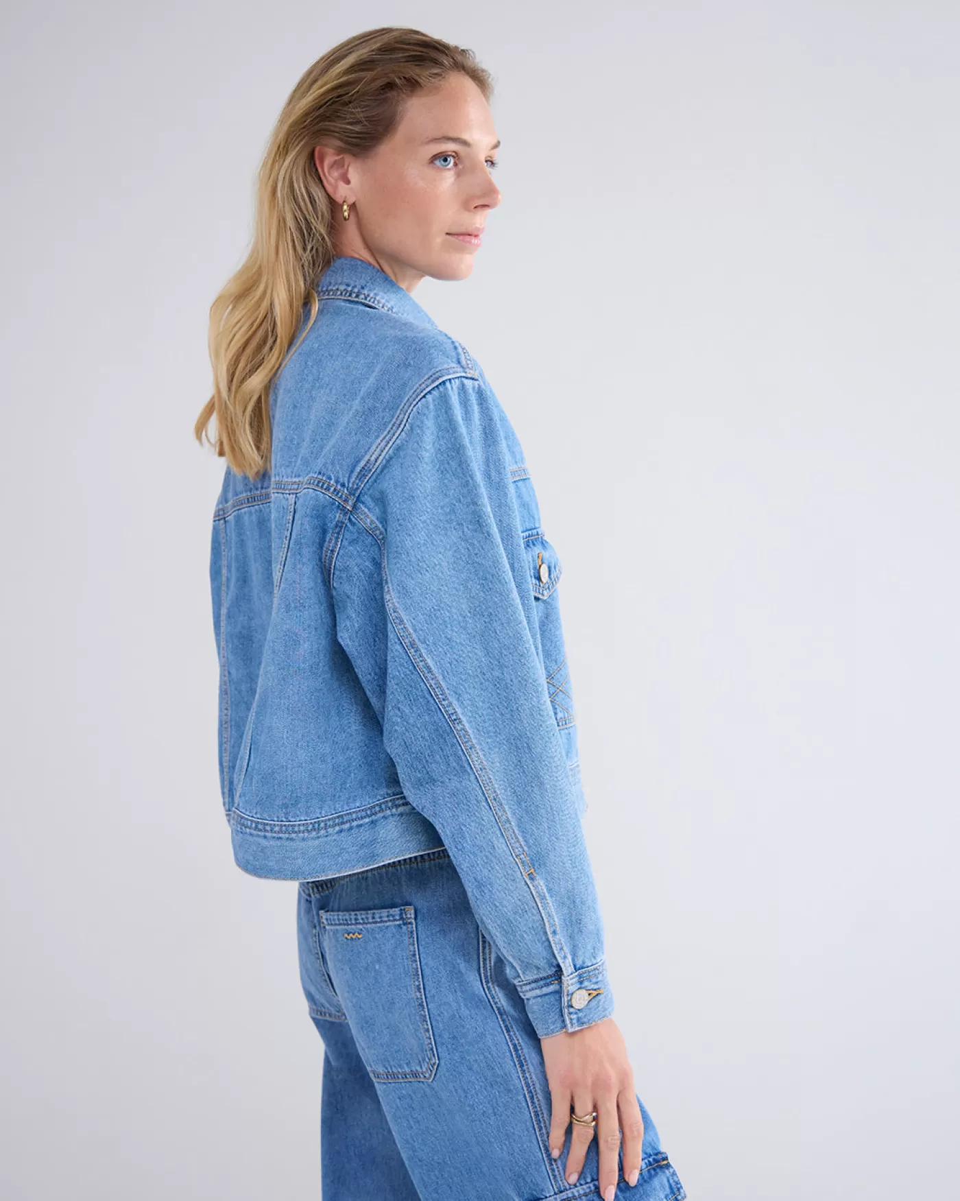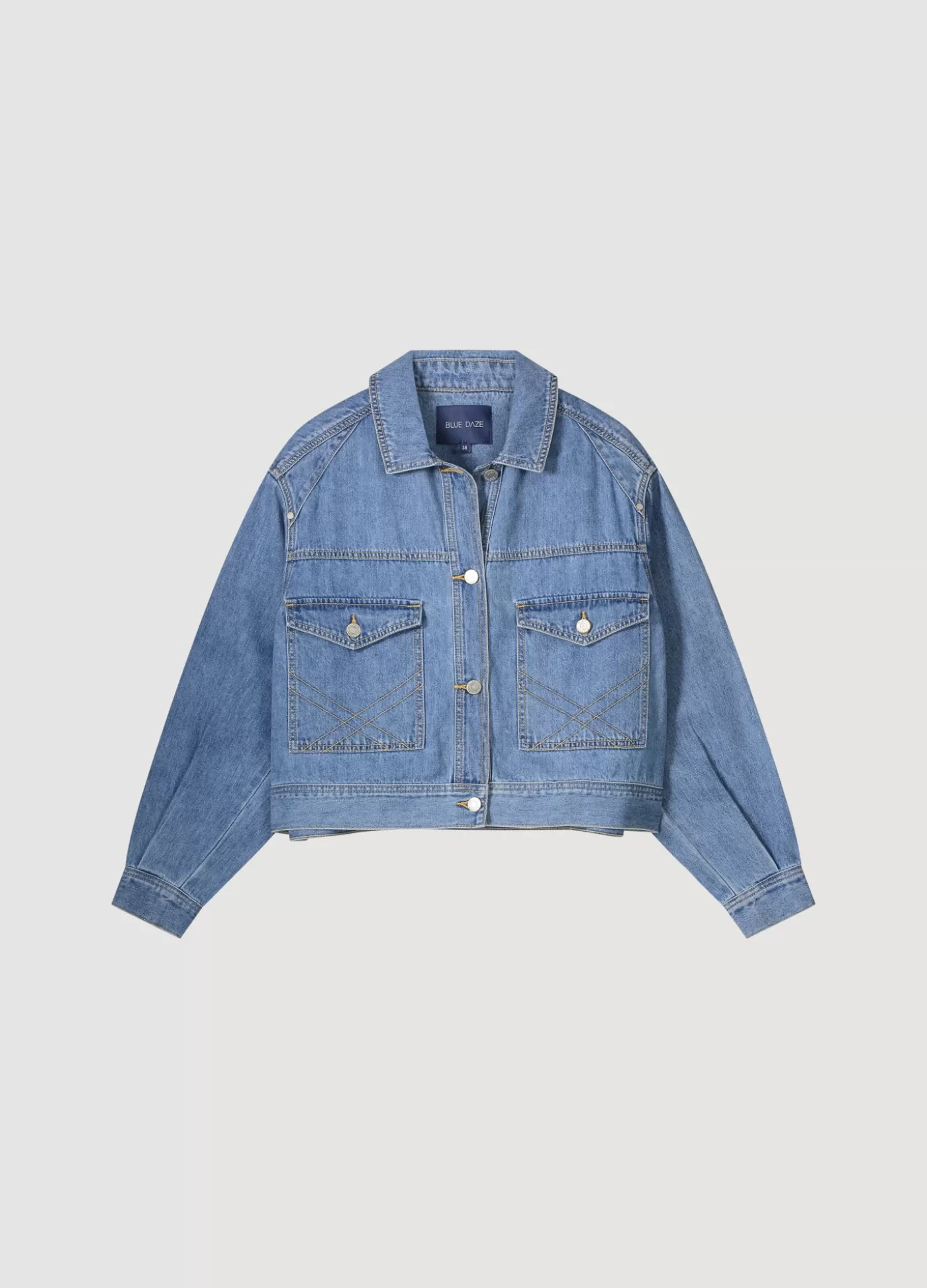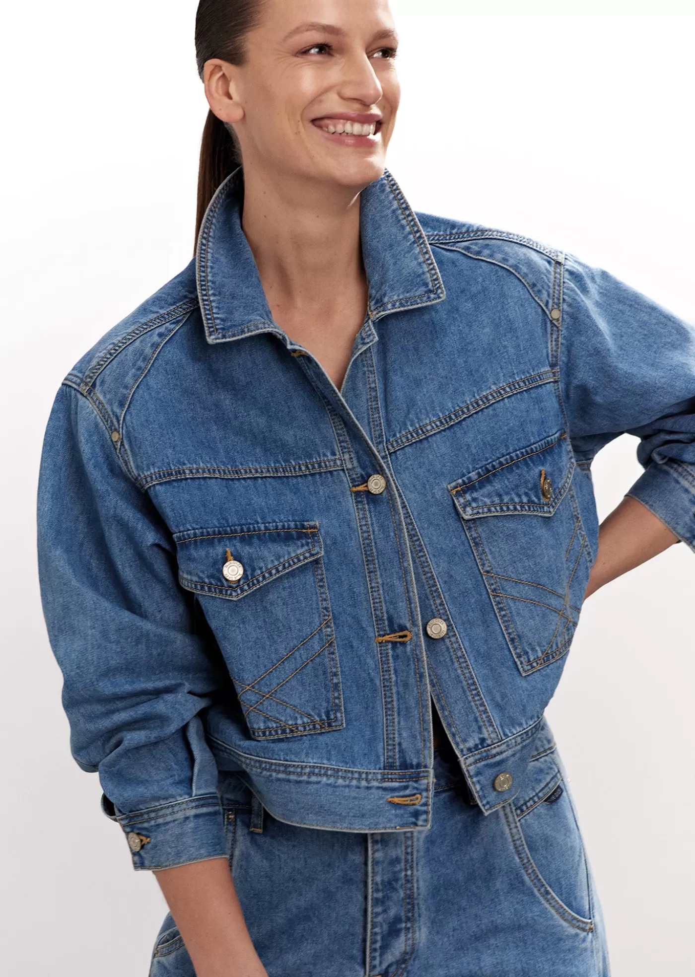 Boxy denim jacket van non-stretch denim. Het jack heeft iets gepofte mouwen en grote steekzakken op het voorpand gedecoreerd met sierstiksels. boxy fit non-stretch denim knoopsluiting steekzakken met sierstiksels