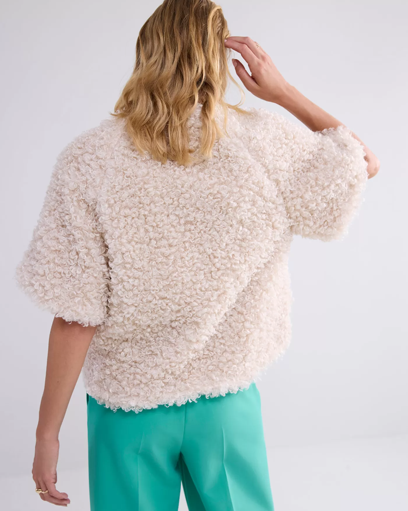 Kort veganistisch bontjasje van zacht, krullige nep bont, met revers kraag en 3/4 mouwtjes. Het jasje heeft een knoopsl…