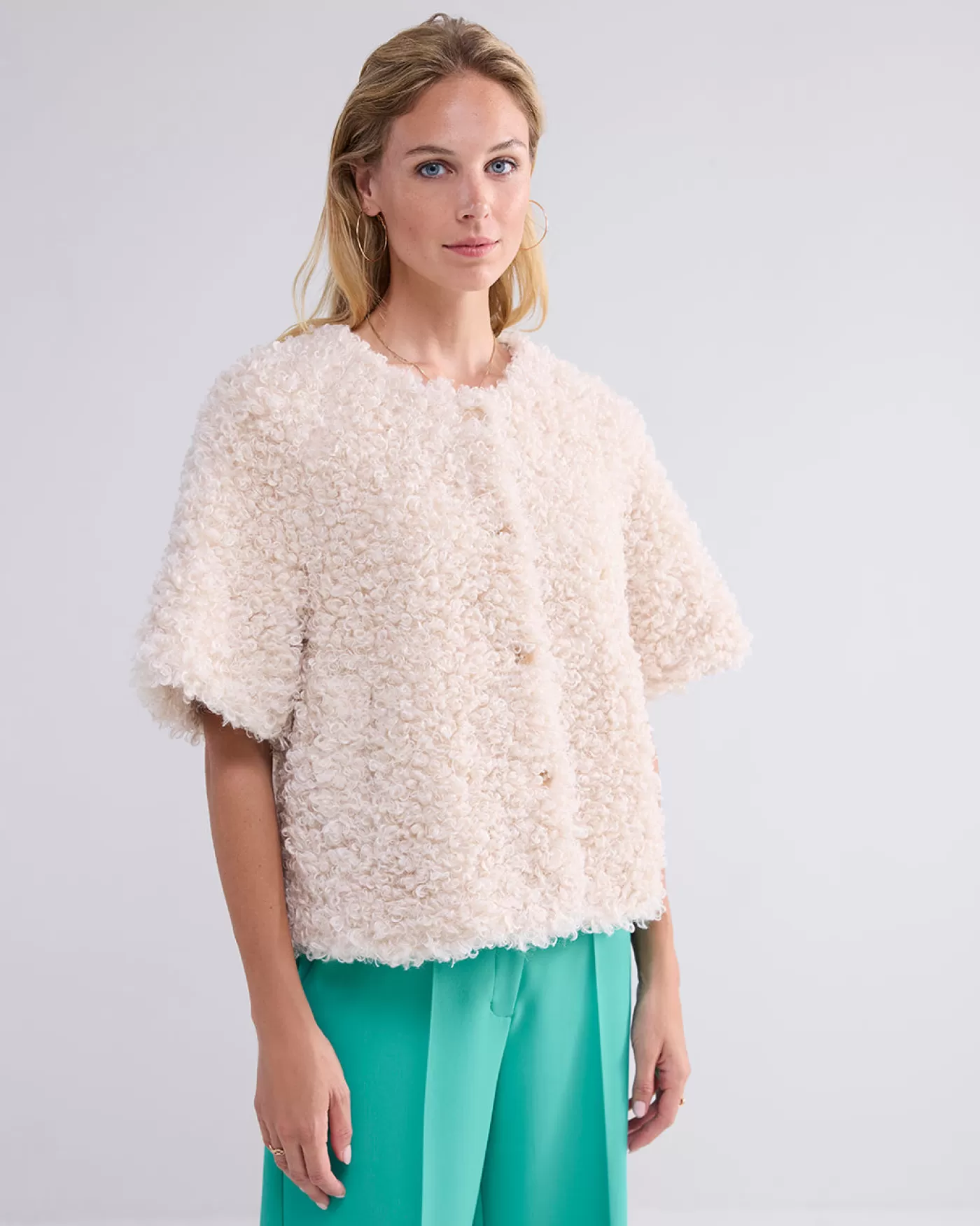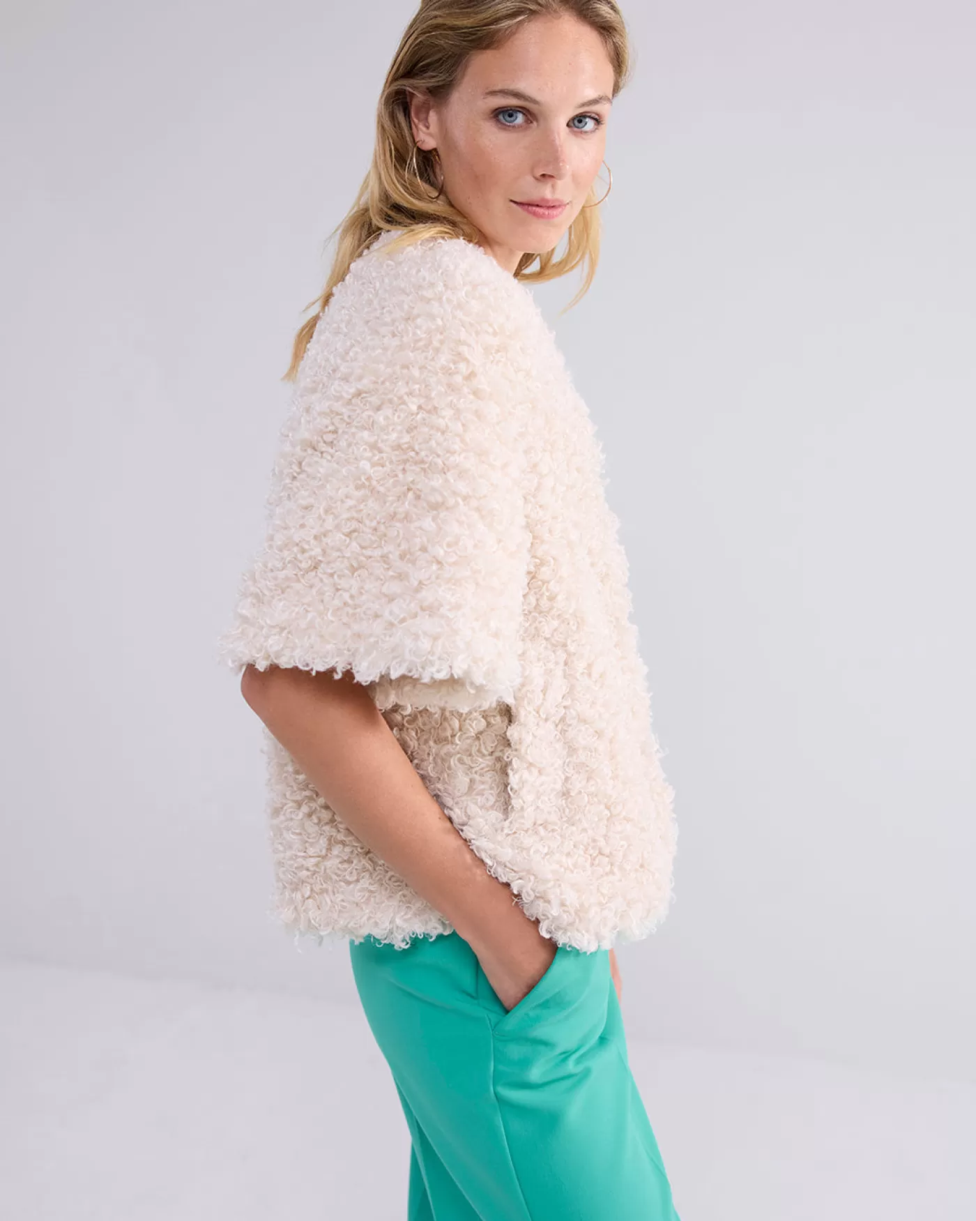 Kort veganistisch bontjasje van zacht, krullige nep bont, met revers kraag en 3/4 mouwtjes. Het jasje heeft een knoopsluiting in ton-sur-ton knopen. korte fit veganistisch bont revers kraag 3/4 mouwen