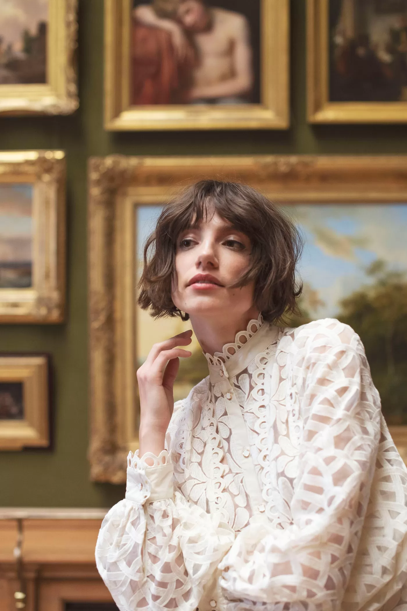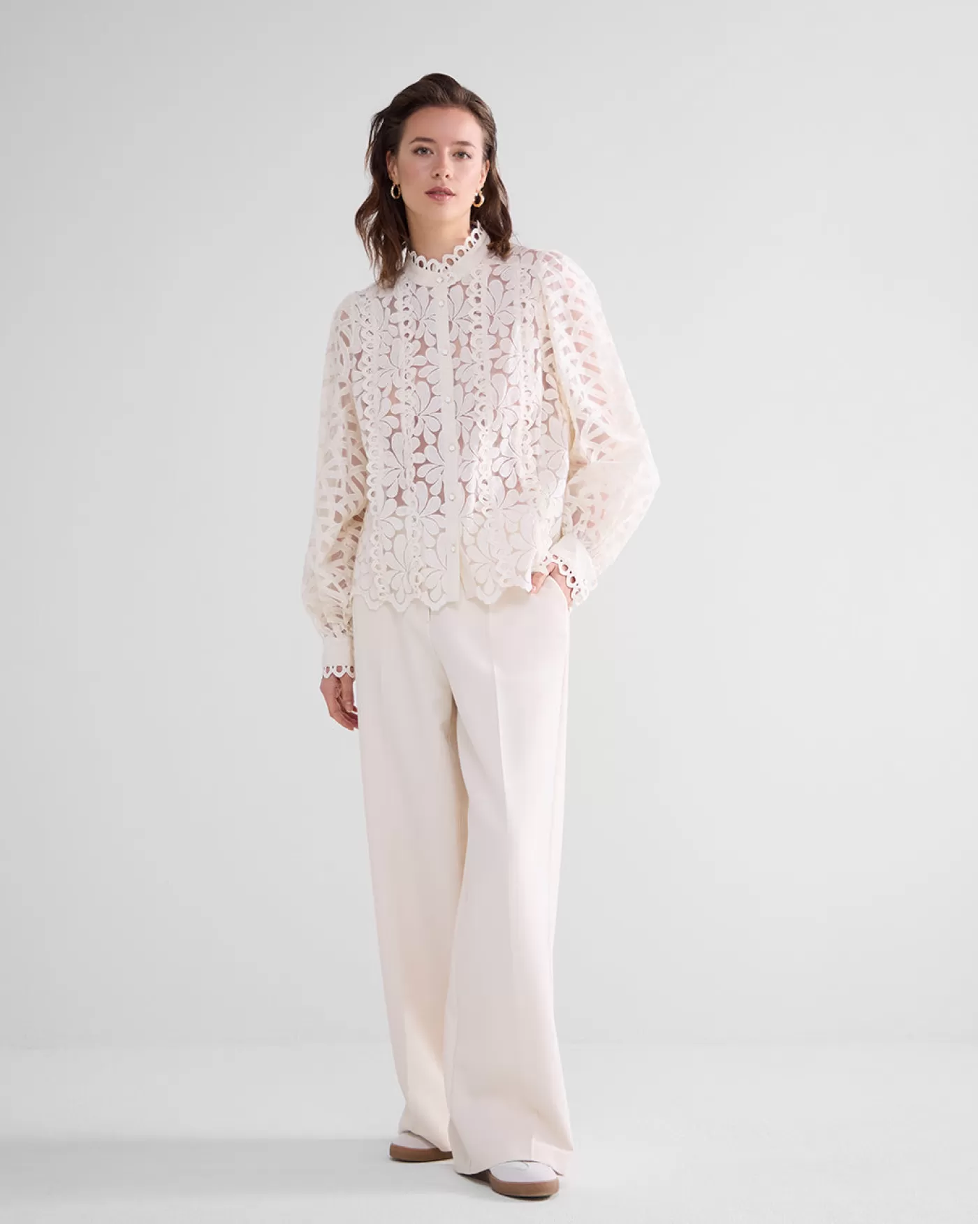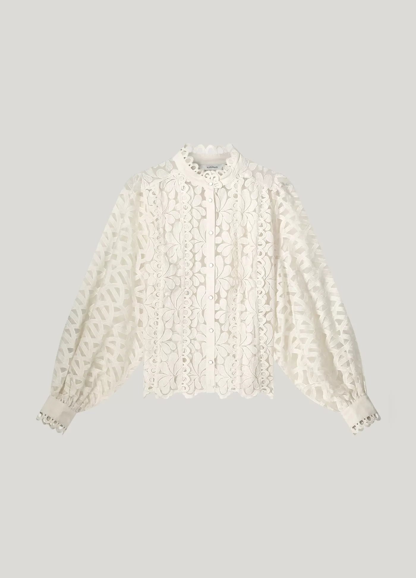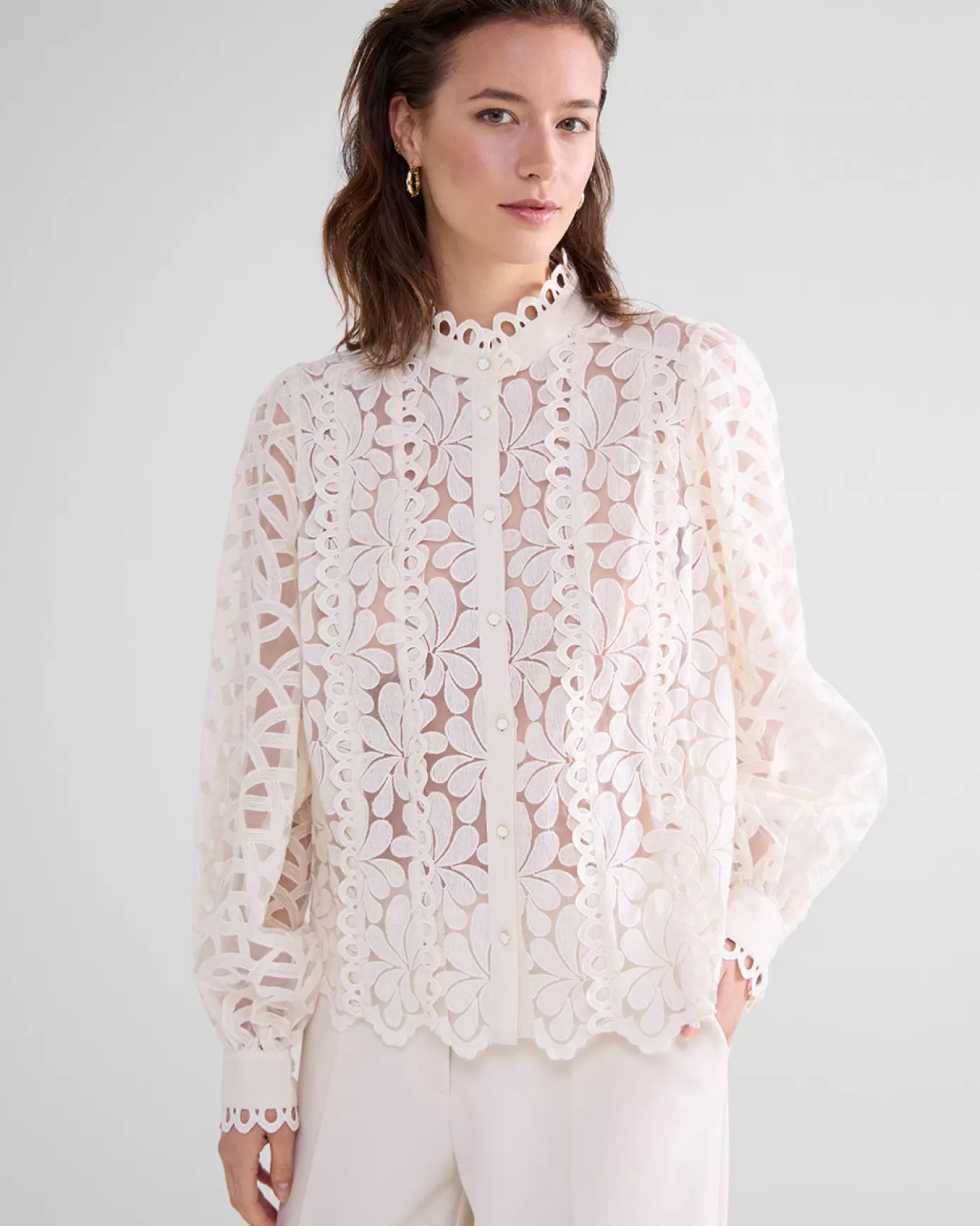 Doorschijnende lange blouse van geweven kant. De blouse heeft lange ballonmouwen, een opstaande kraag en is versierd met kantband met metalen knoopsluiting. rechte snit transparant ballonmouw met manchet kleine metalen knoopjes