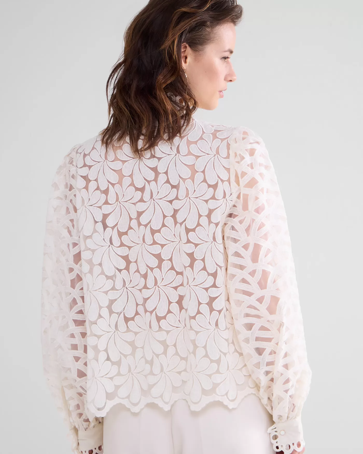 Doorschijnende lange blouse van geweven kant. De blouse heeft lange ballonmouwen, een opstaande kraag en is versierd met…