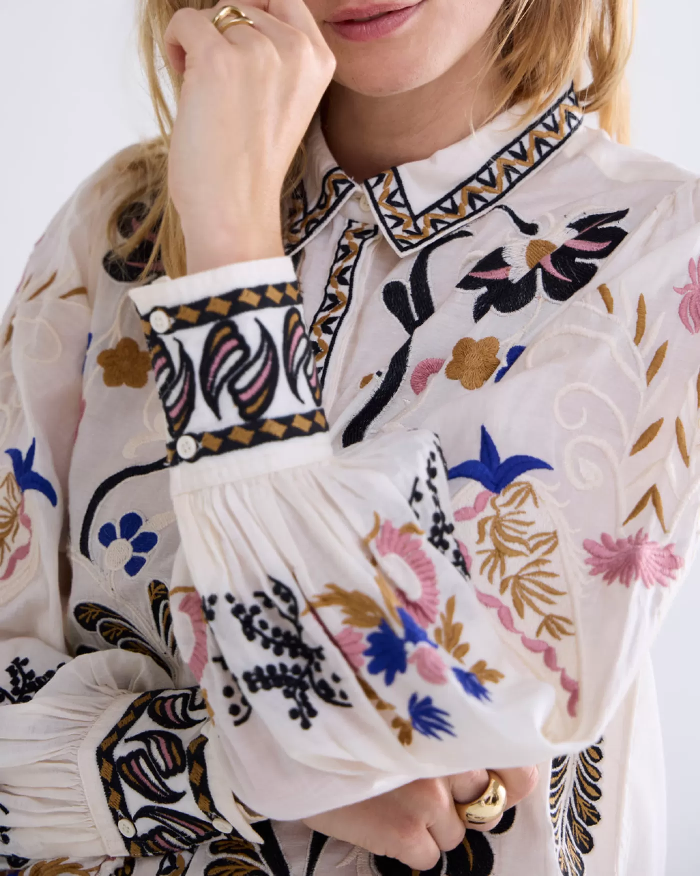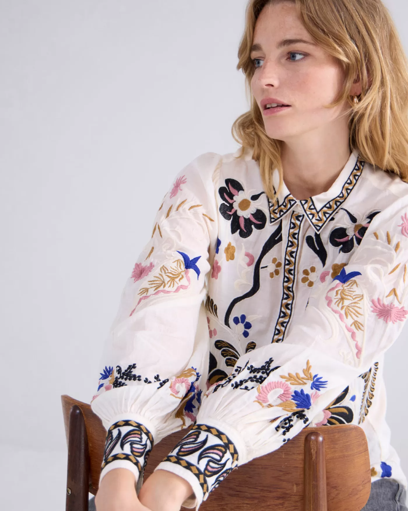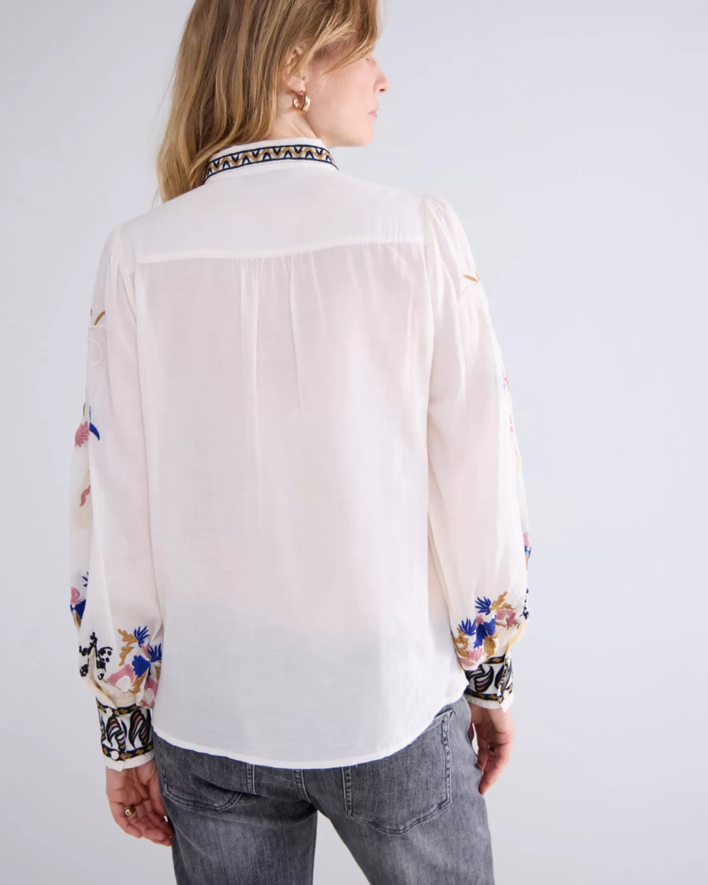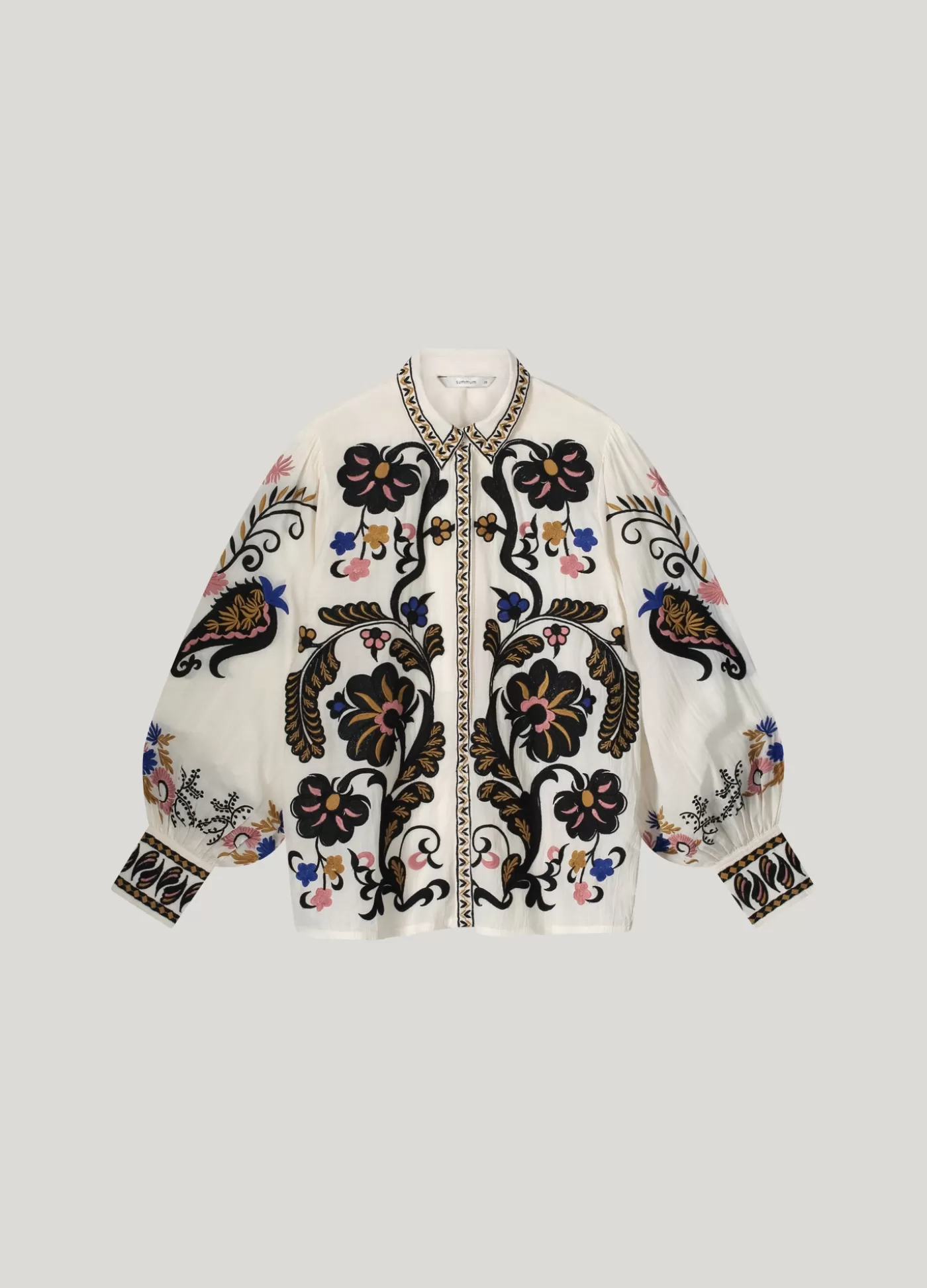 Overhemdkraag blouse met lange ballonmouwen en rijkelijk versierd met borduurwerk. De blouse is gemaakt van een zachte katoen-viscose mix. Overhemdkraag Lange ballonmouwen Rijk borduurwerk Katoen-viscose geweven kwaliteit