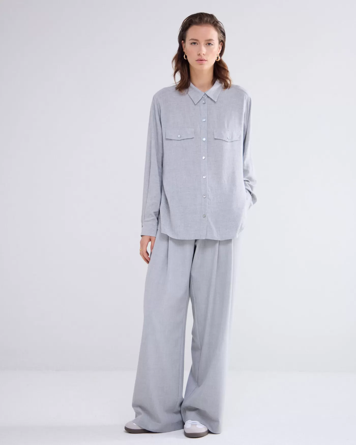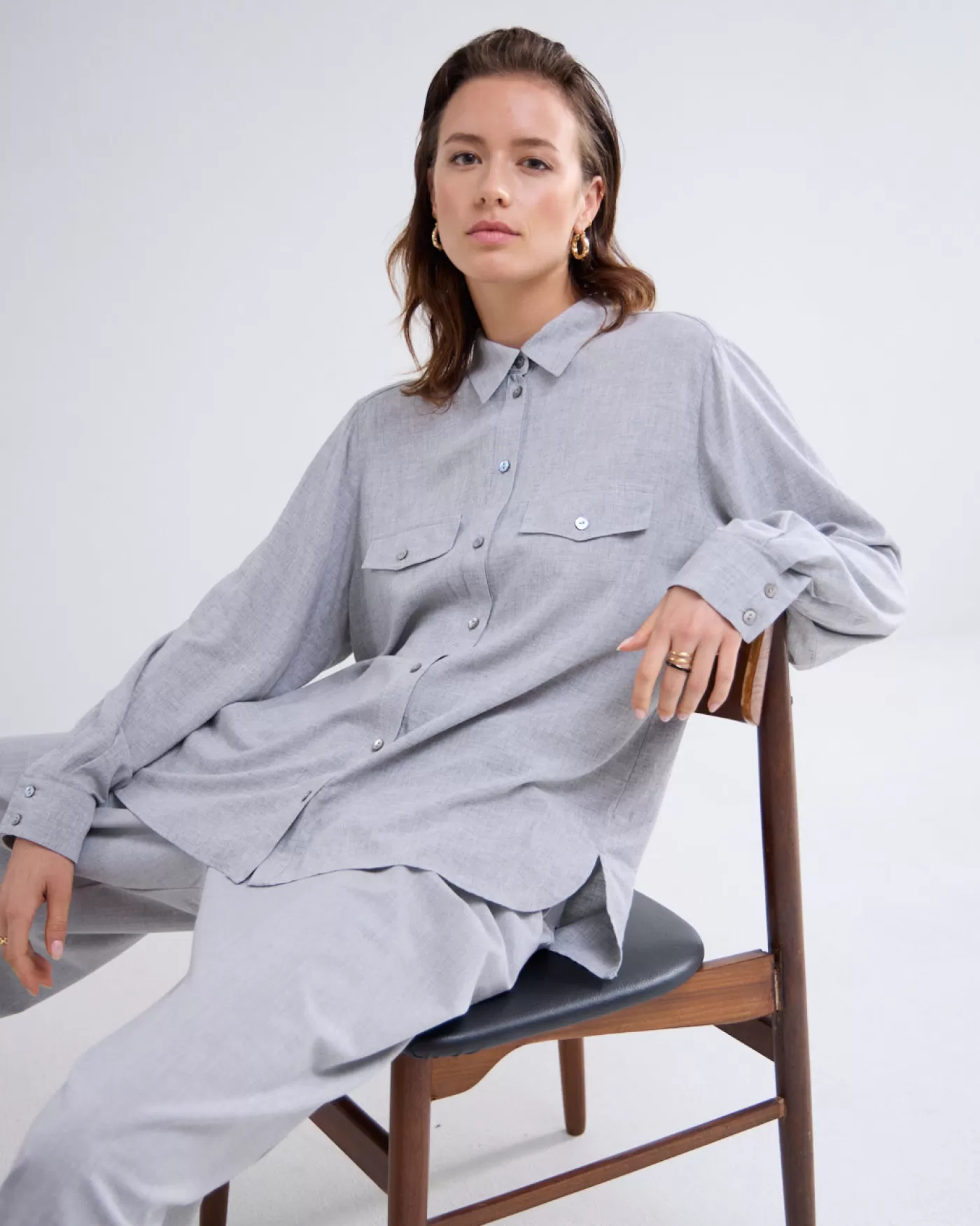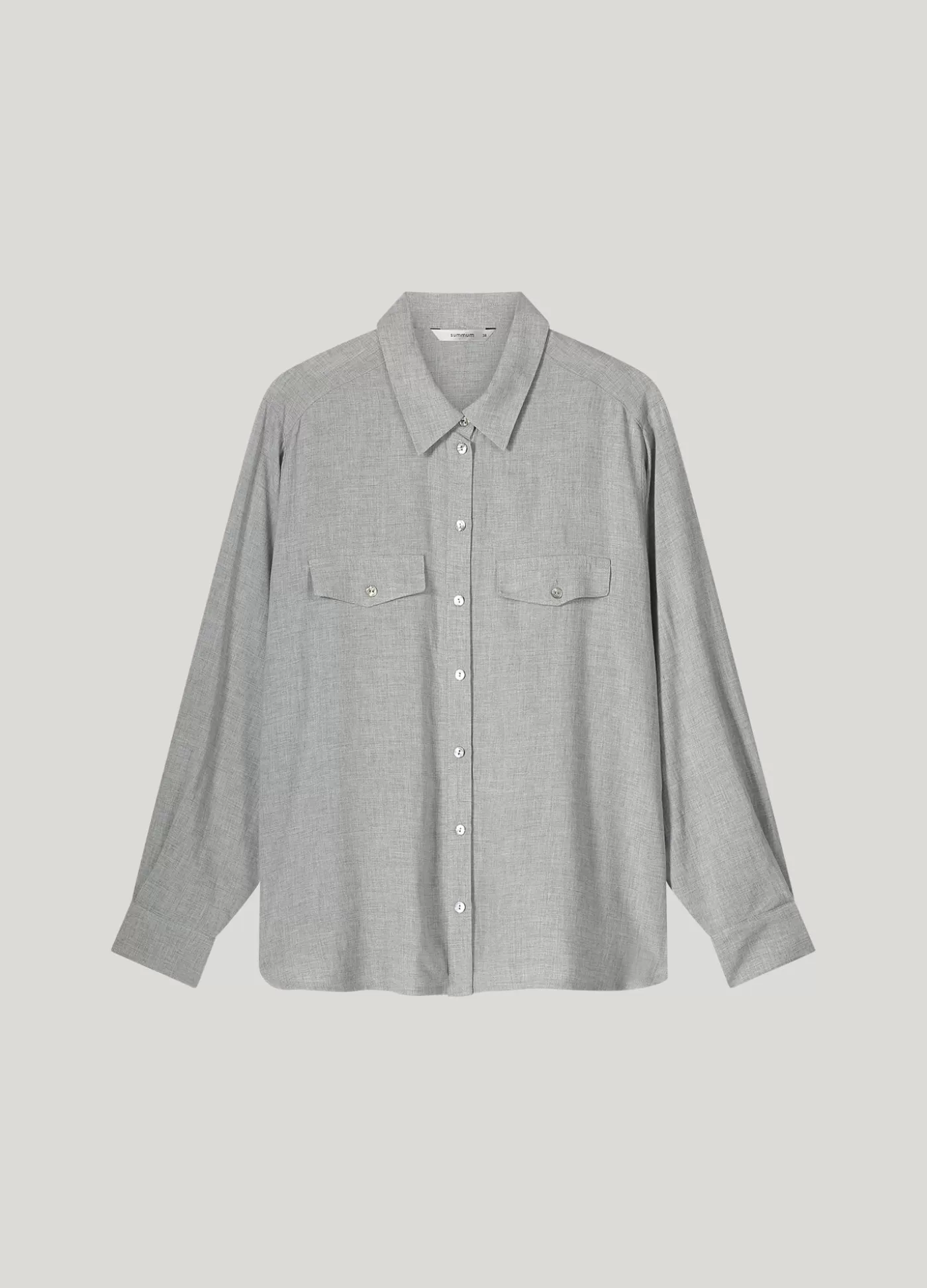 Overhemdblouse met klepjes op de borst, een afgeronde voorkant en een rechte achterkant. De blouse heeft een knoopsluiti…