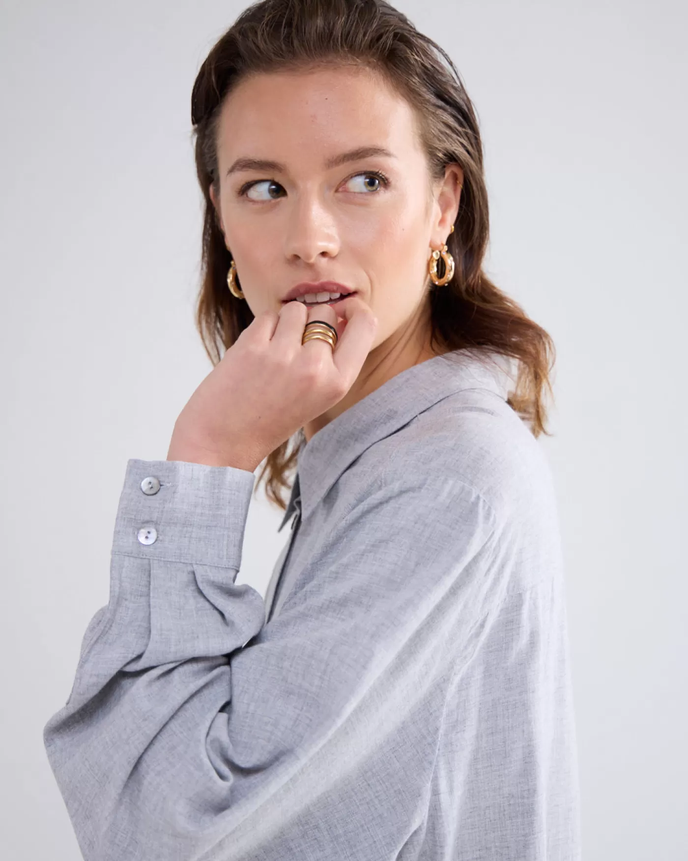 Overhemdblouse met klepjes op de borst, een afgeronde voorkant en een rechte achterkant. De blouse heeft een knoopsluiting met kleine parelmoer knoopjes. Wij adviseren om een maatje kleiner te bestellen borstklepjes afgeronde voorkant rechte achterkant parelmoer knoopjes