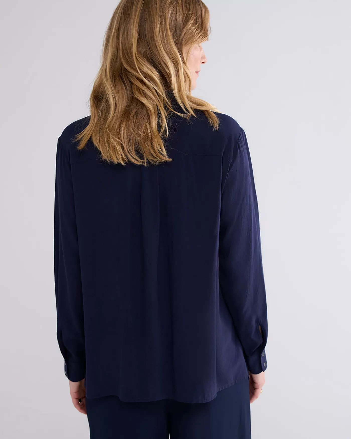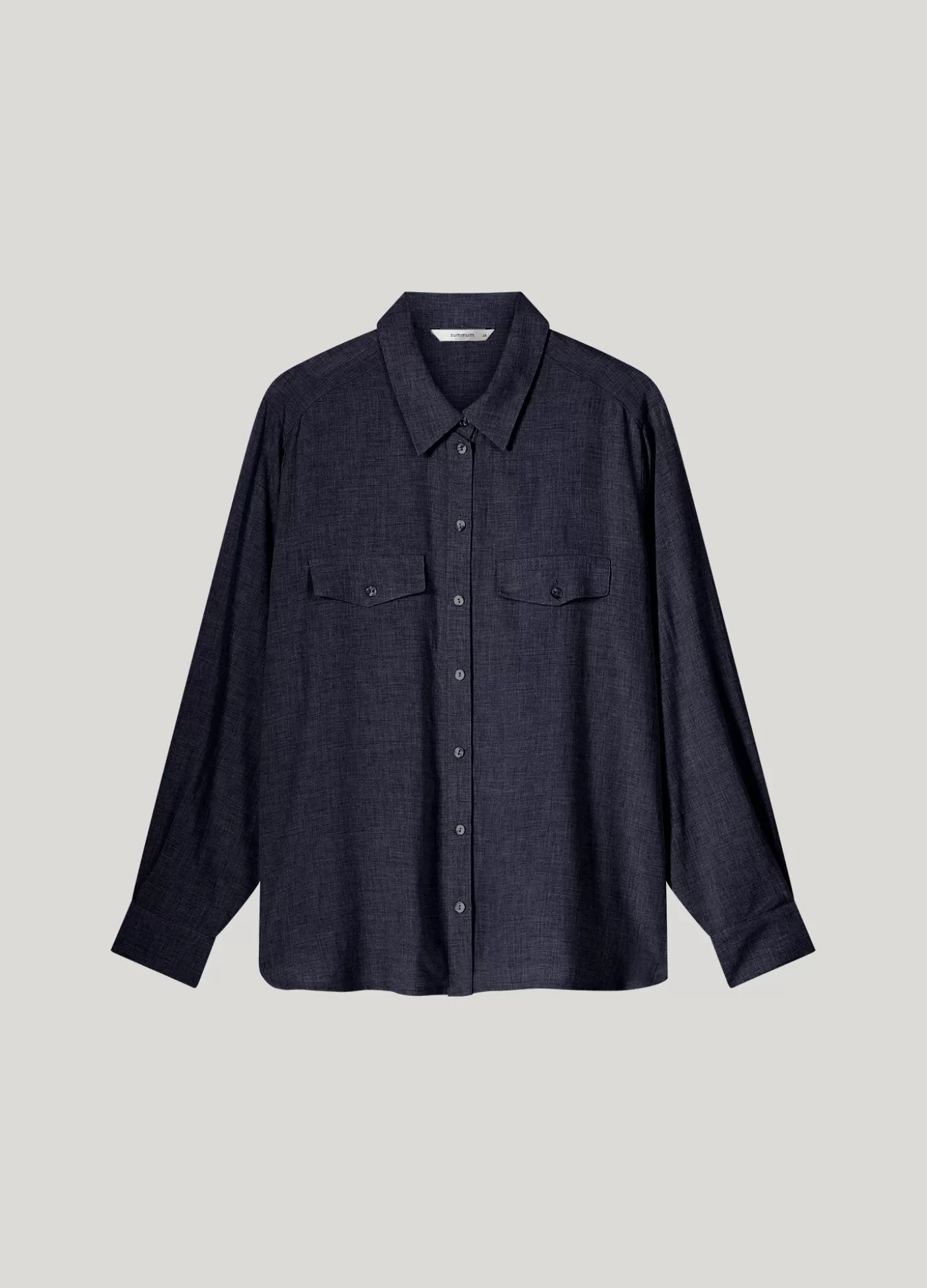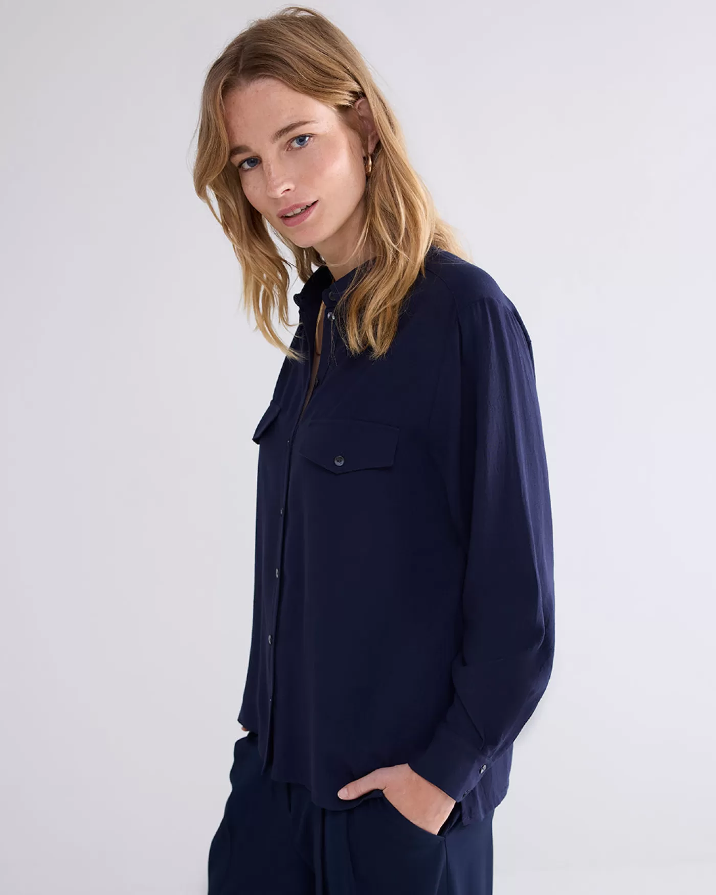 Overhemdblouse met klepjes op de borst, een afgeronde voorkant en een rechte achterkant. De blouse heeft kleine parelmoe…