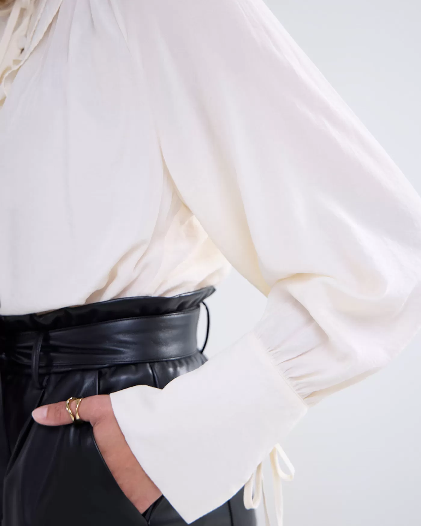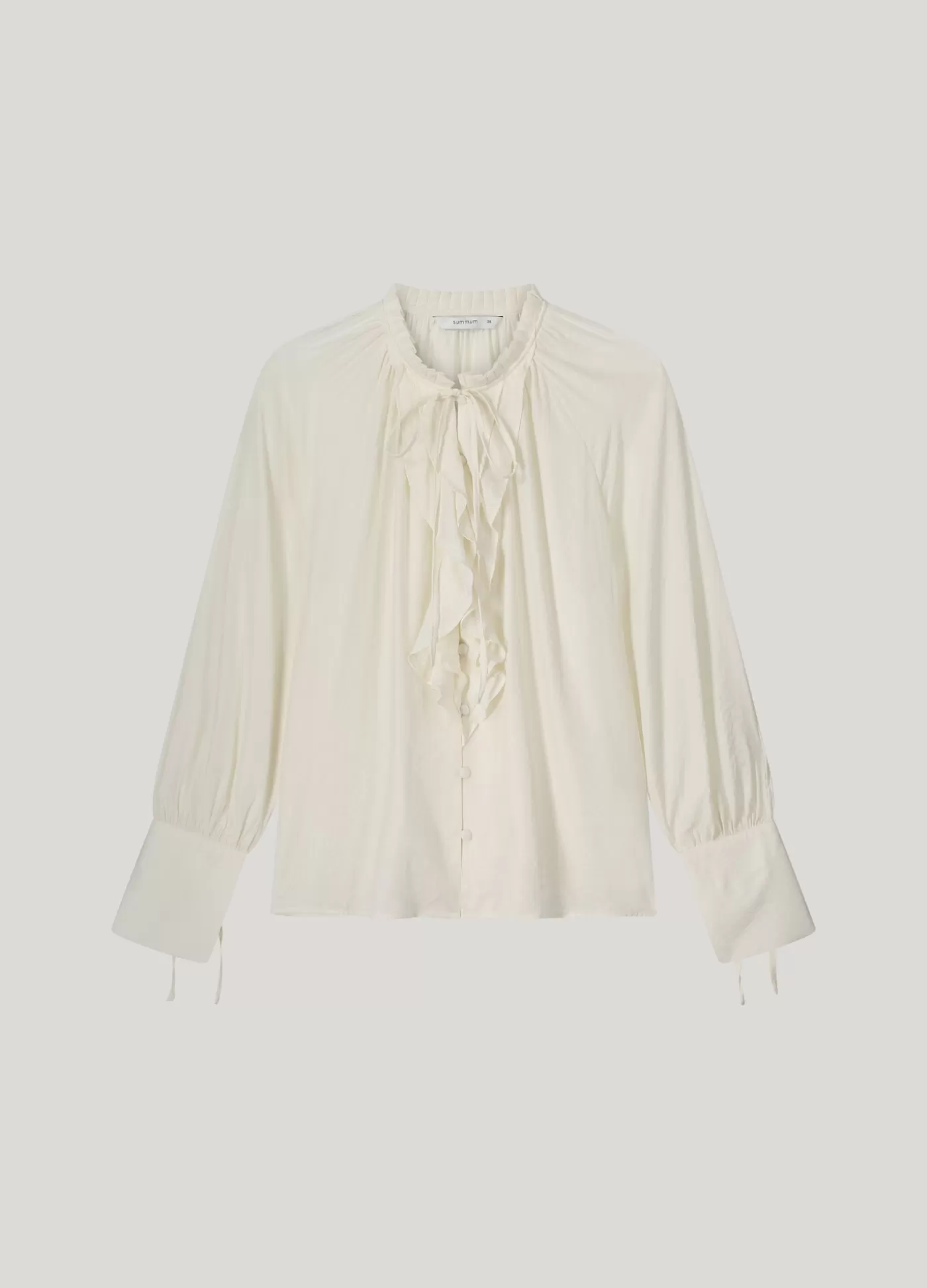 Blouse met lange mouwen en een opstaande kraag en koordsluiting. Gemaakt van luxe viscose kwaliteit en versierd met ruches. opstaande kraag ruches luxe viscose lange mouwen