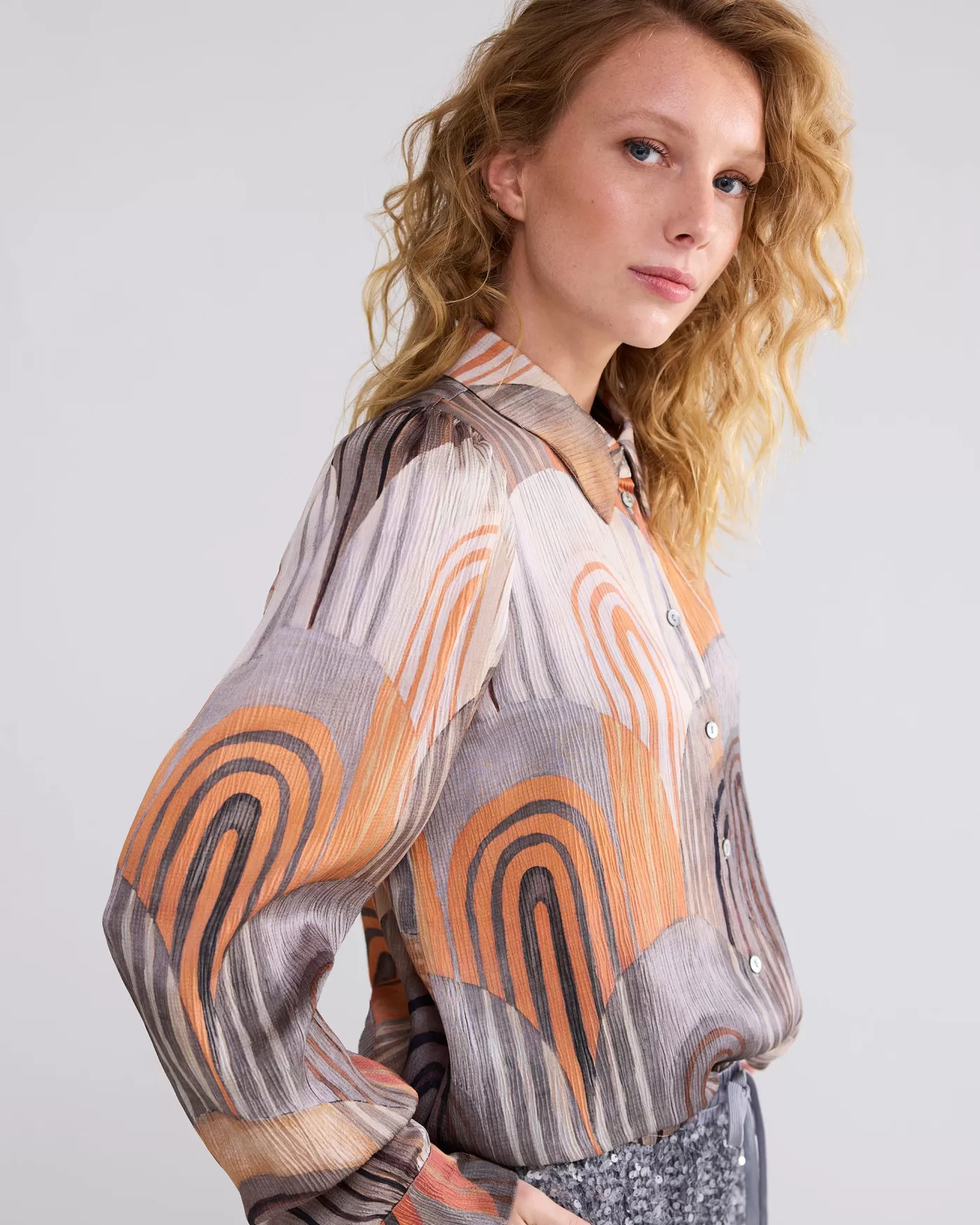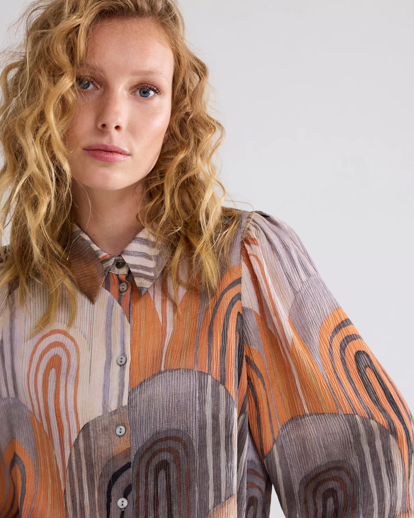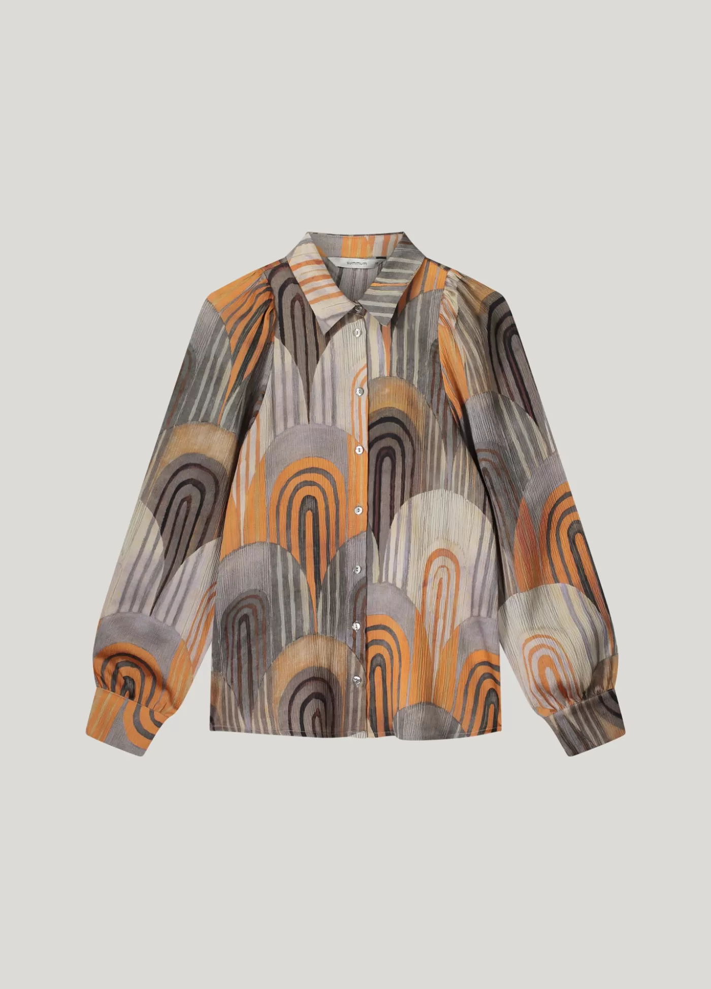 Blouse met smalle schouders en royale pofmouwen, gemaakt van stof met een subtiele structuur. De blouse is gemaakt van een overall bedrukte, soepelvallende stof en heeft een knoopsluiting. smalle schouders royale pofmouwen stof met structuur allover print