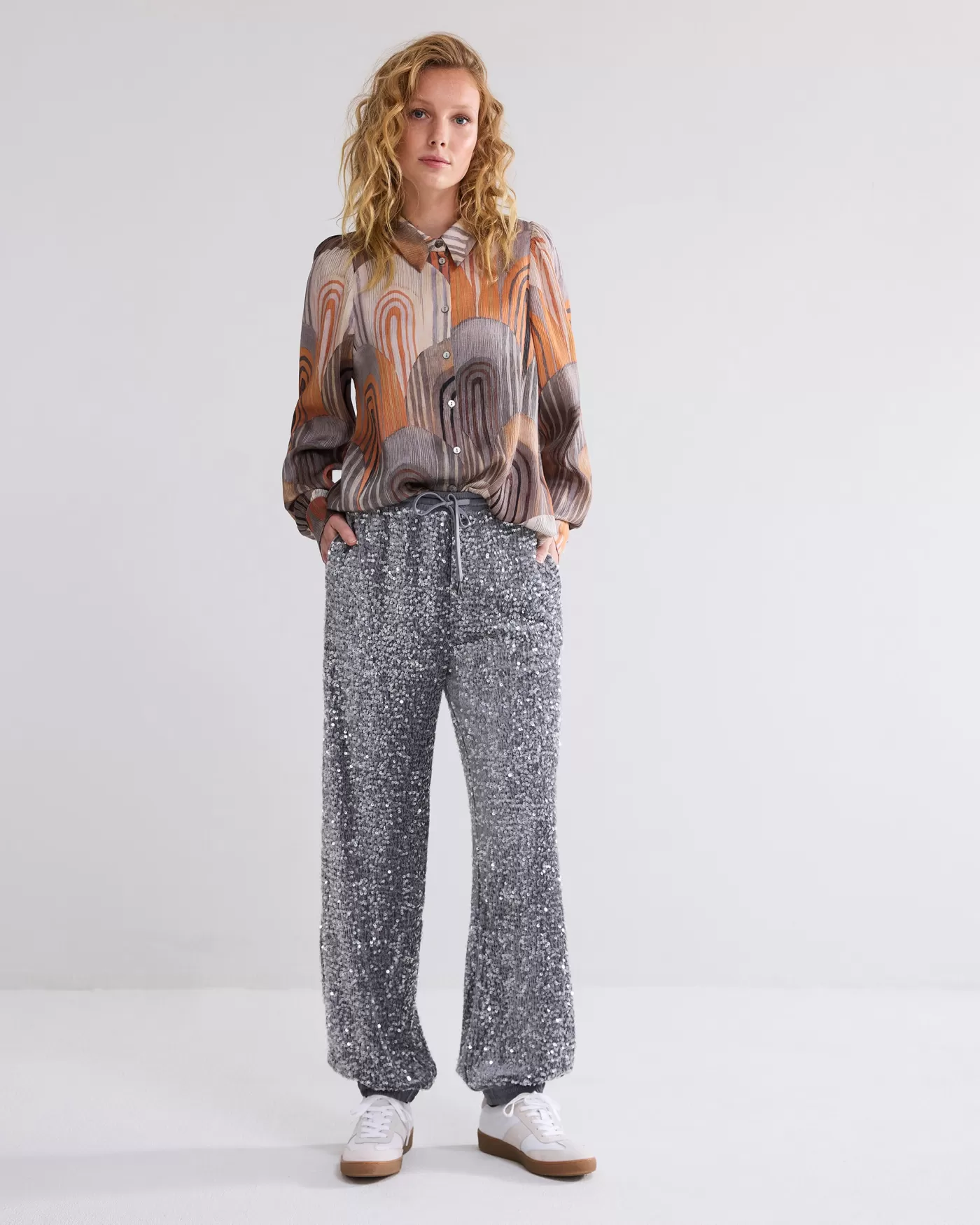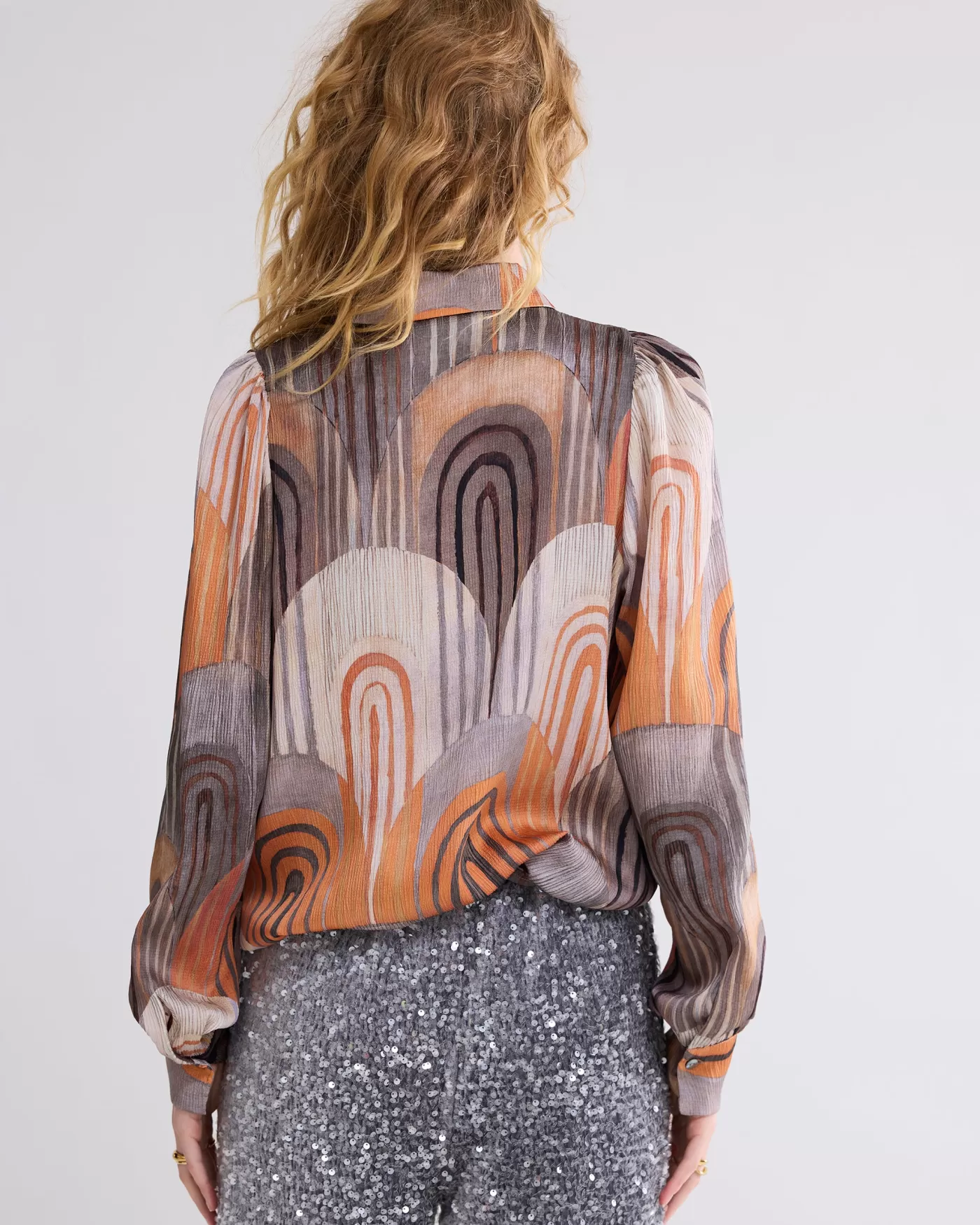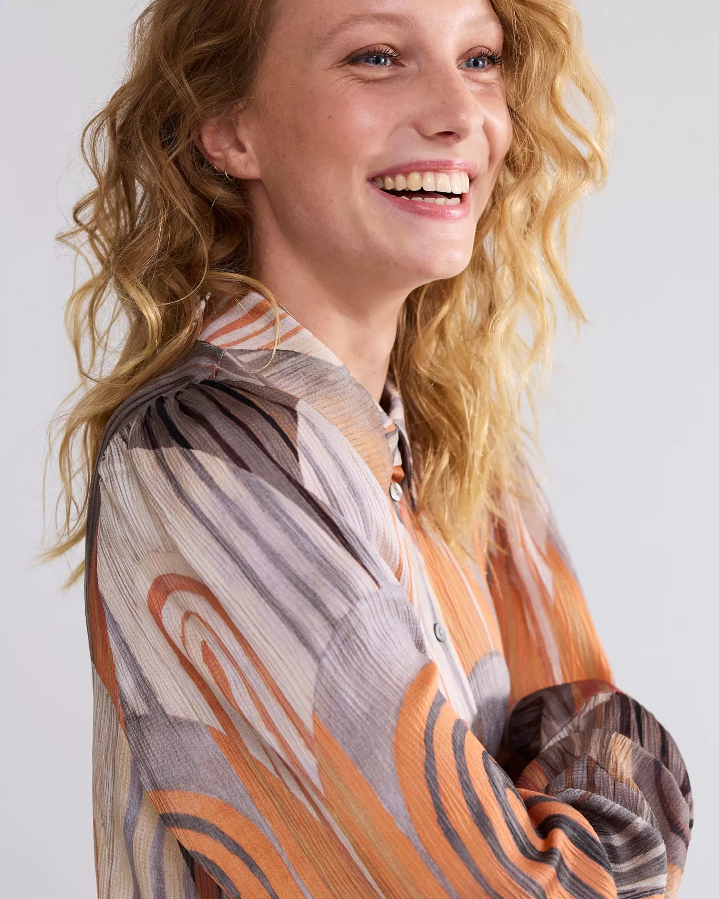 Blouse met smalle schouders en royale pofmouwen, gemaakt van stof met een subtiele structuur. De blouse is gemaakt van een overall bedrukte, soepelvallende stof en heeft een knoopsluiting. smalle schouders royale pofmouwen stof met structuur allover print