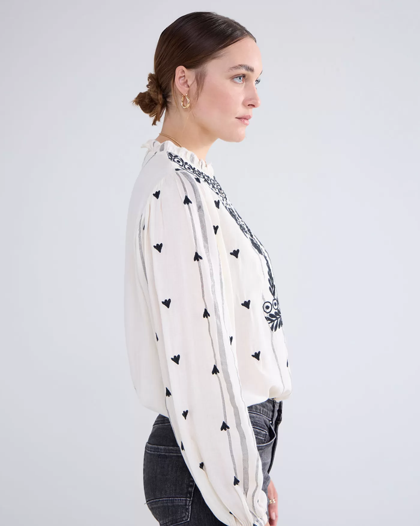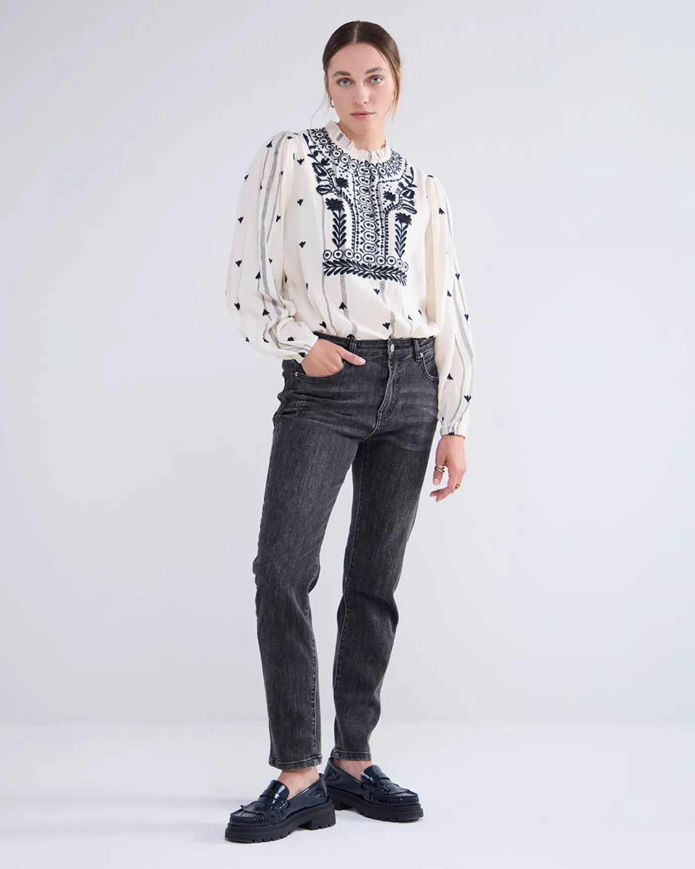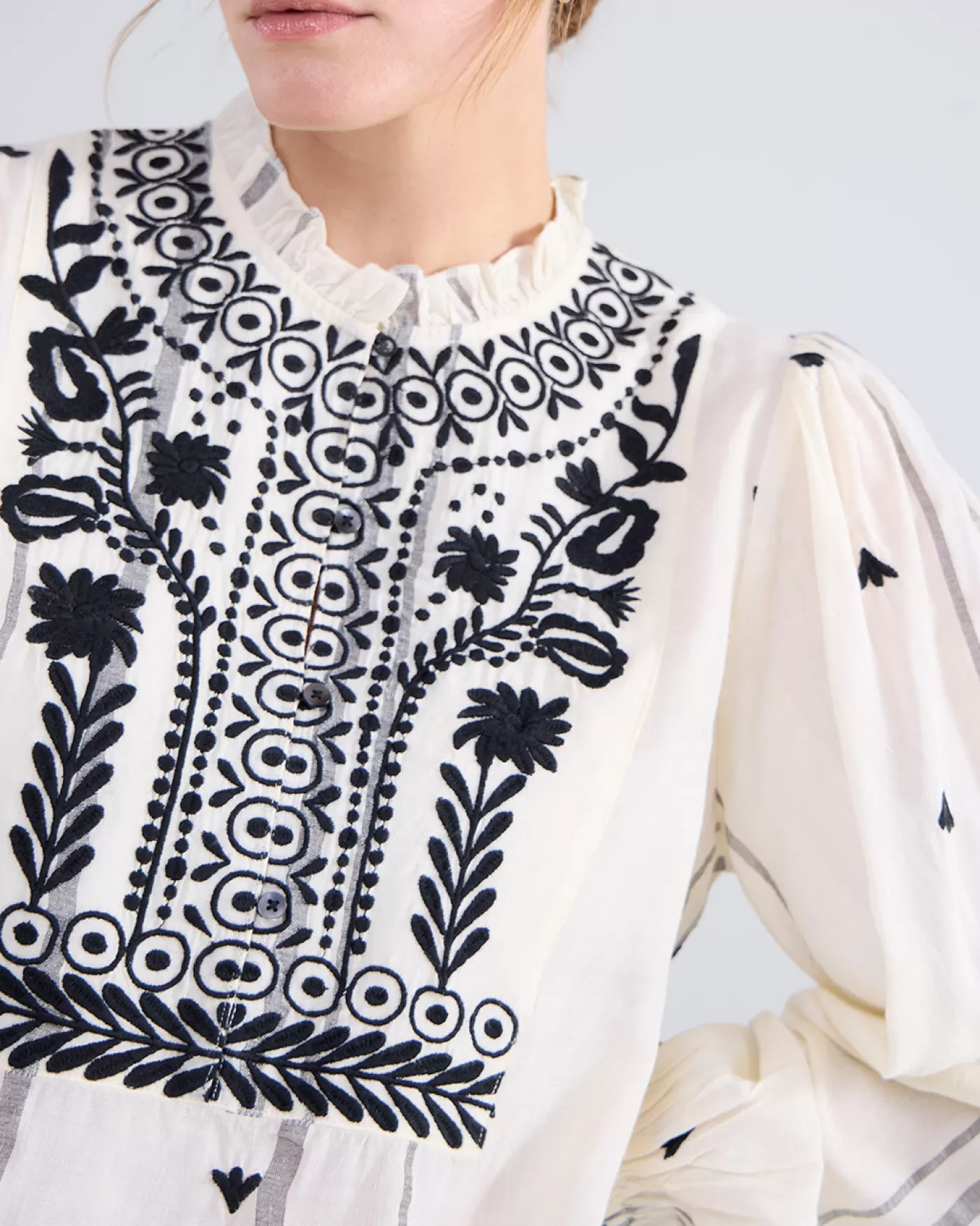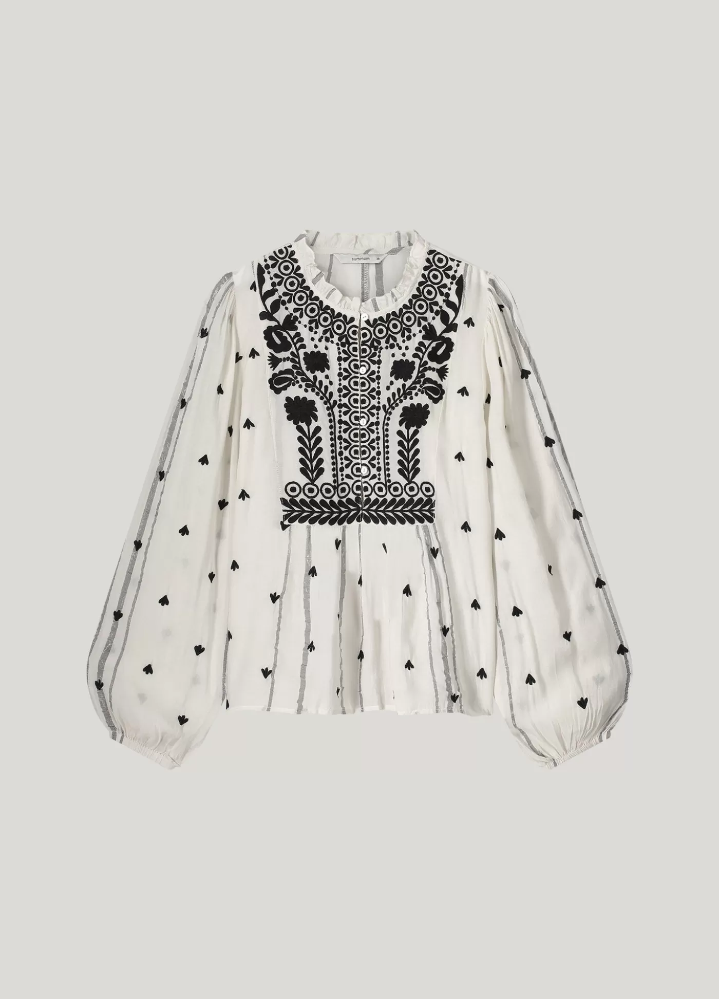 Boho chic blouse met zwart geborduurde bloemen- en geometrische patronen op een lichte, luchtige stof. De blouse heeft lange, wijde mouwen met elastische boorden en een ronde halslijn met subtiele ruches. Gemaakt van viscose met metallic strepen. rechte pasvorm ballonmouwen opstaande ronde hals metallic strepen