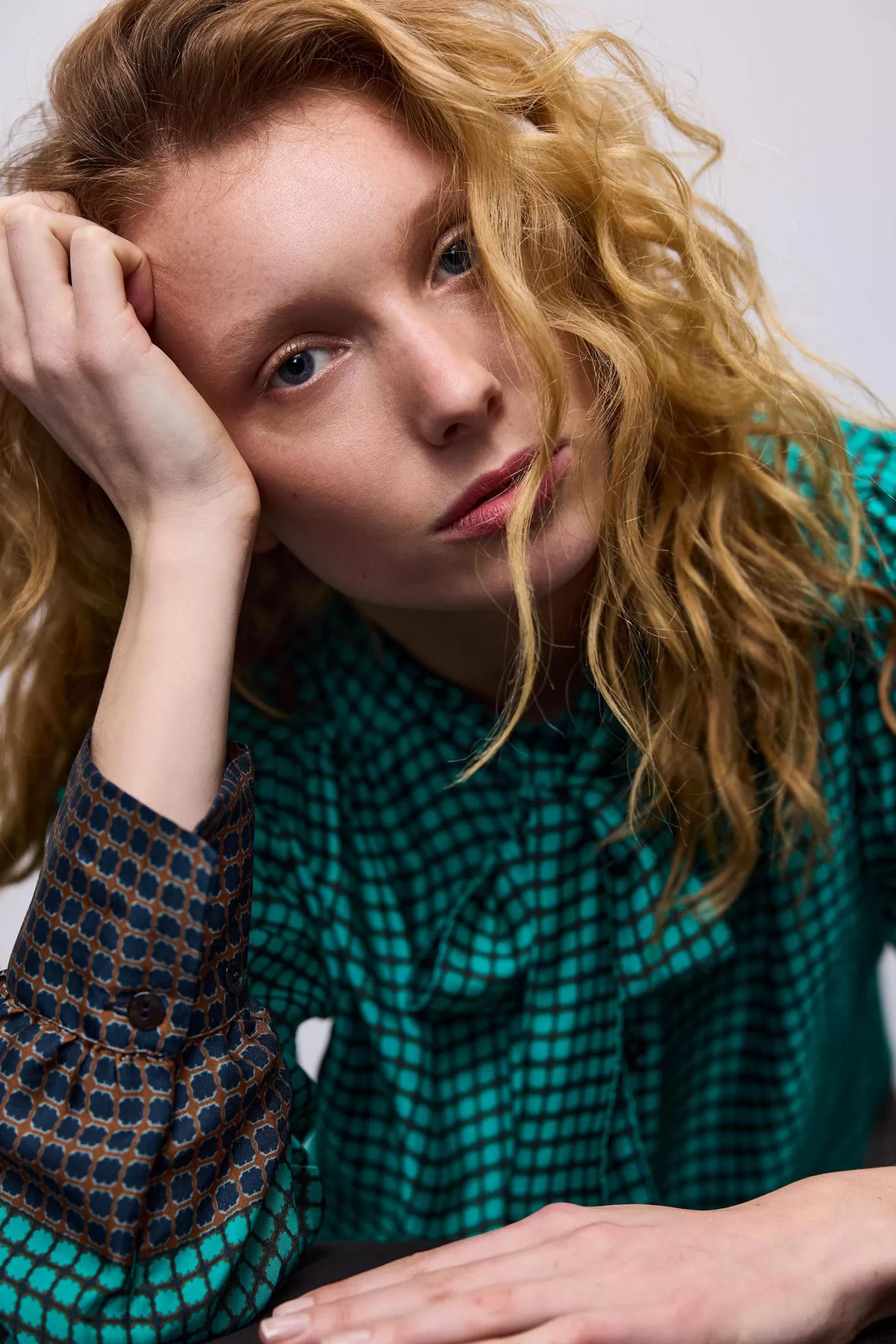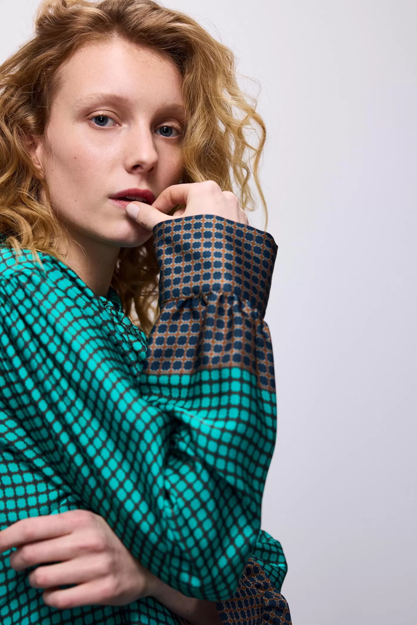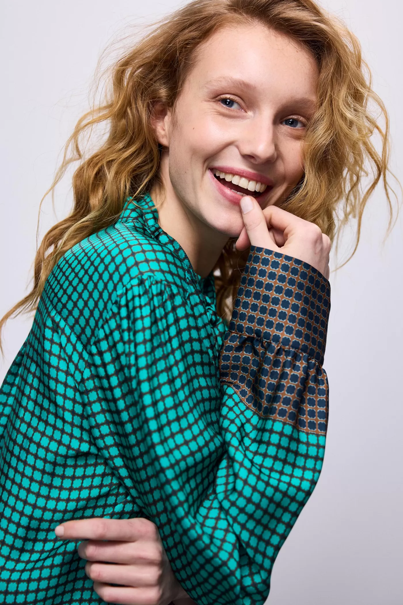 Blouse met staanderkraag en afneembare strik, uitgevoerd in een contrasterende print. De blouse heeft pofmouwen en een knoopsluiting. staanderkraag pofmouwen rechte pasvorm contrasterende print