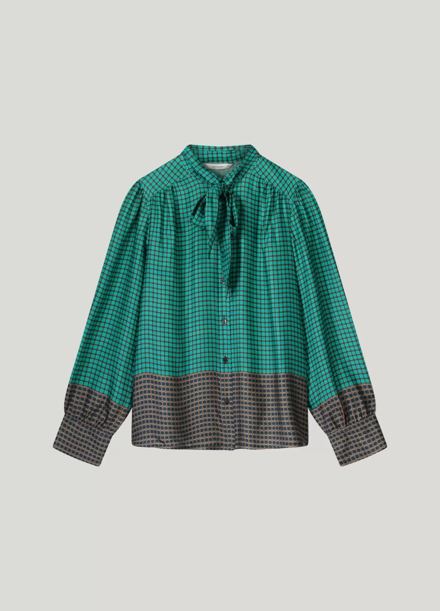 Blouse met staanderkraag en afneembare strik, uitgevoerd in een contrasterende print. De blouse heeft pofmouwen en een k…
