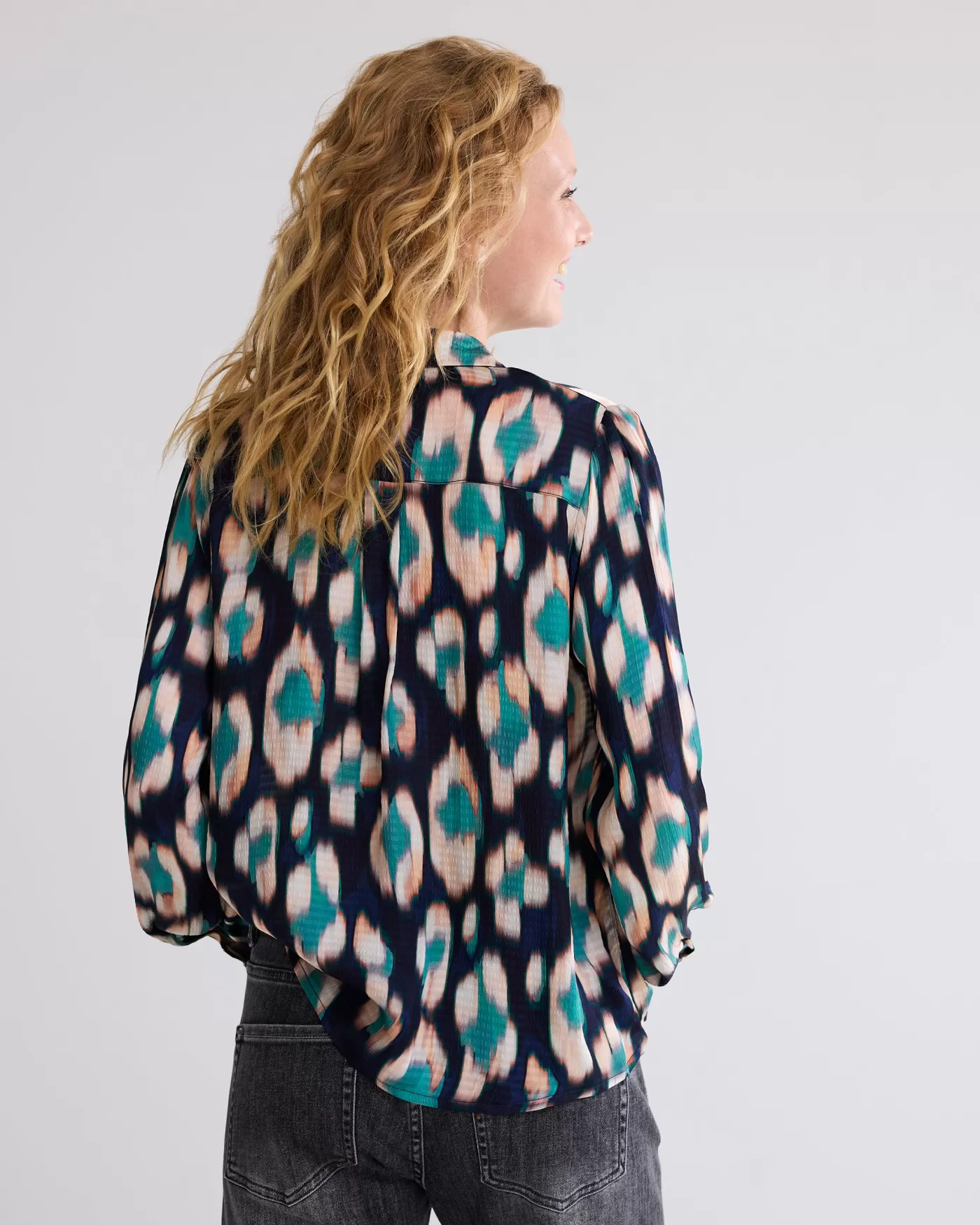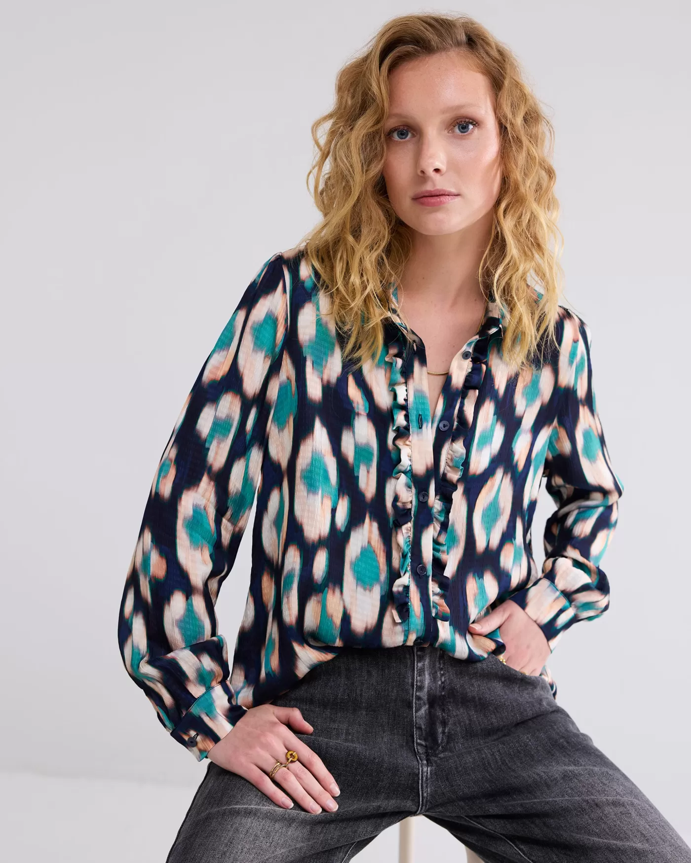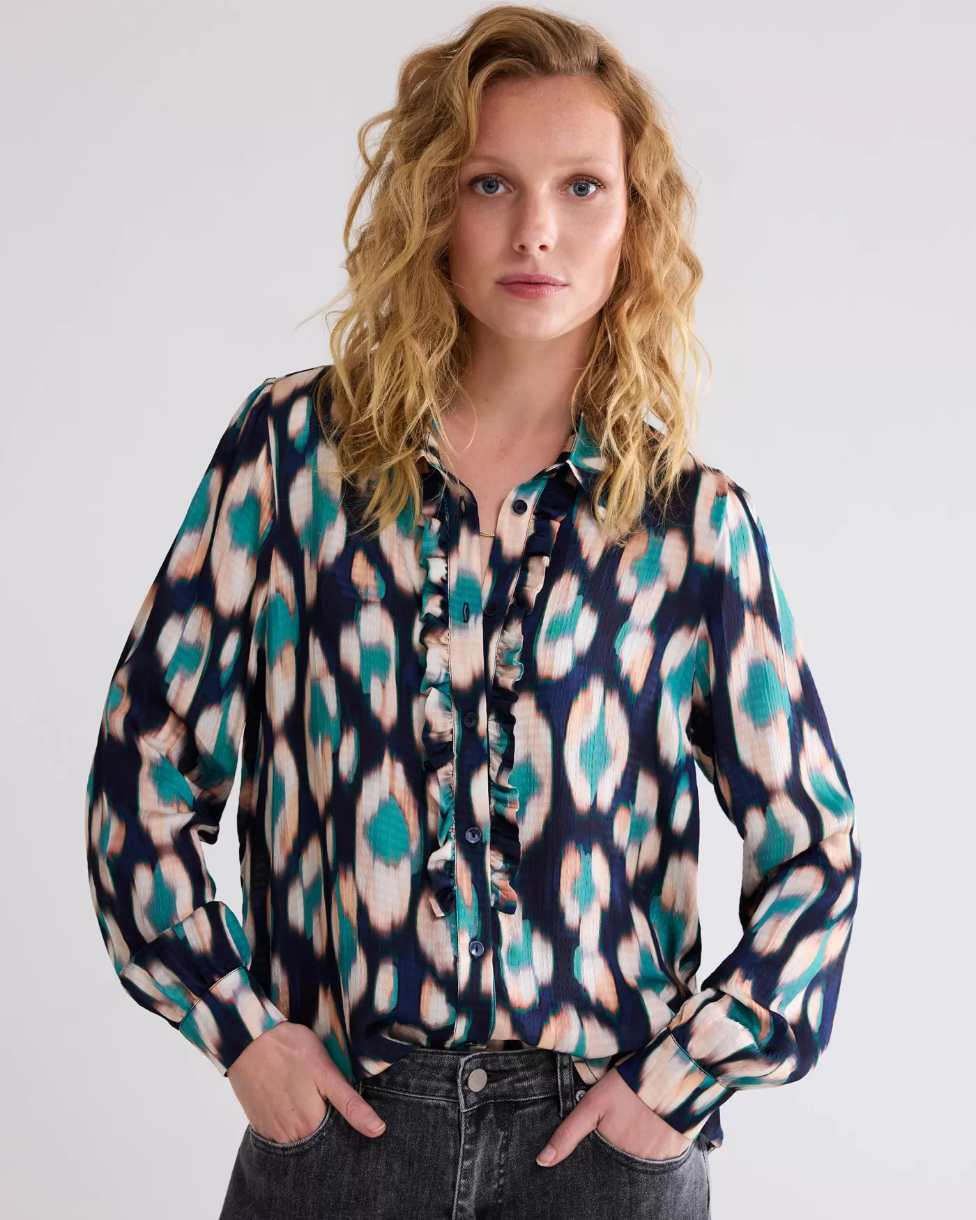Blouse met ruches langs de knopenlijst en licht geplooide schouders. Gemaakt van een stof met structuur in een overall Ikat-print. ruches langs knopenlijst rimpeling bij schouder en mouw rechte pasvorm Ikat-print