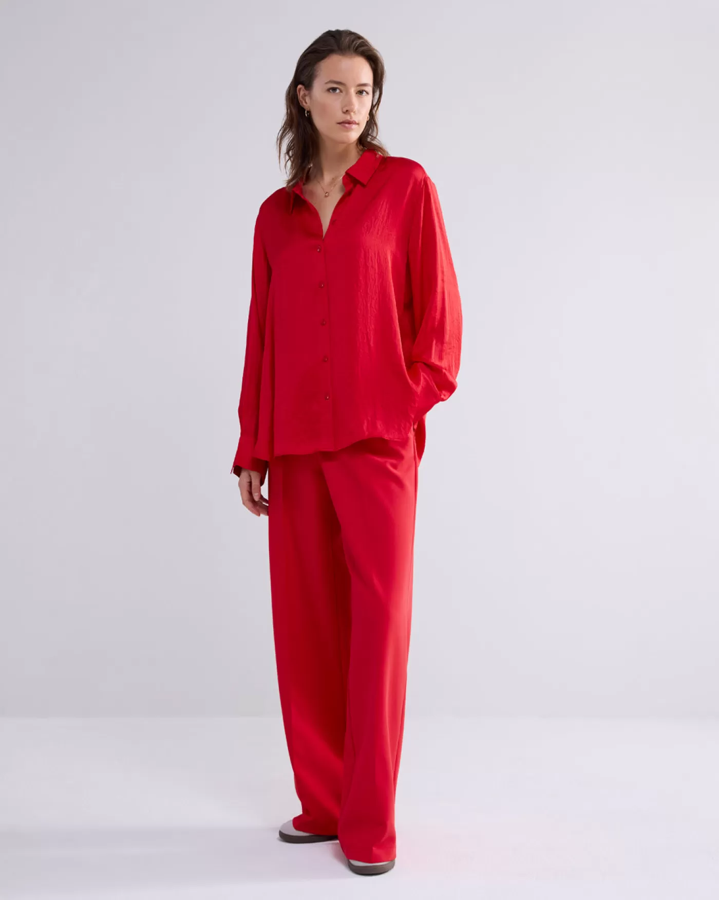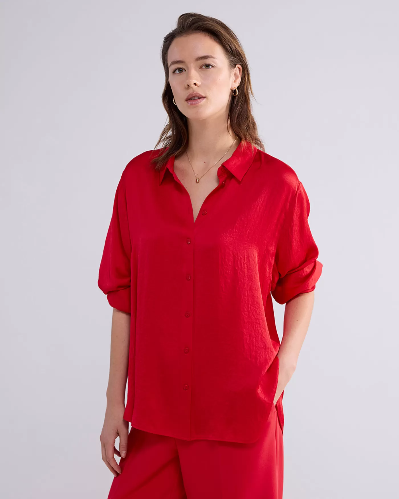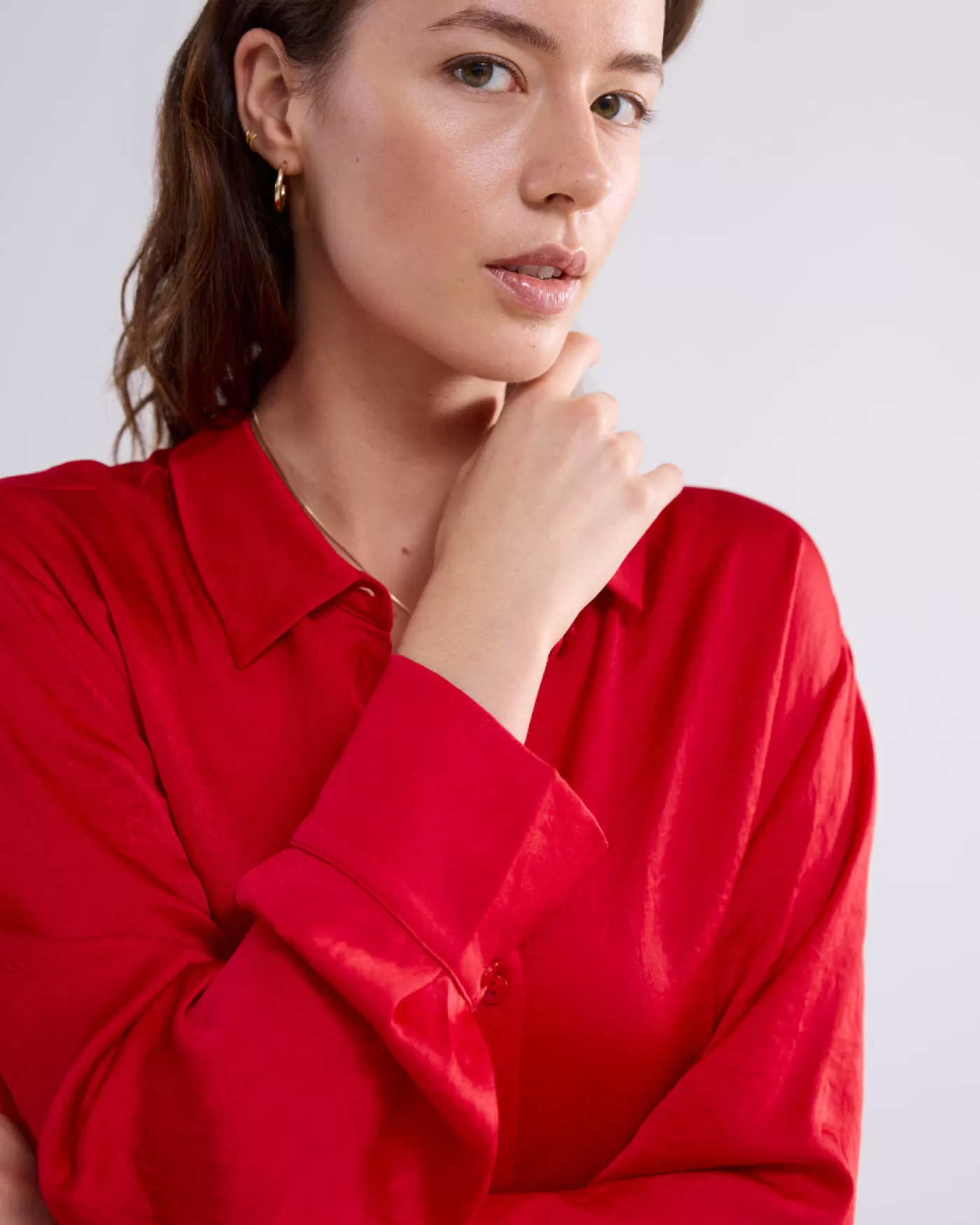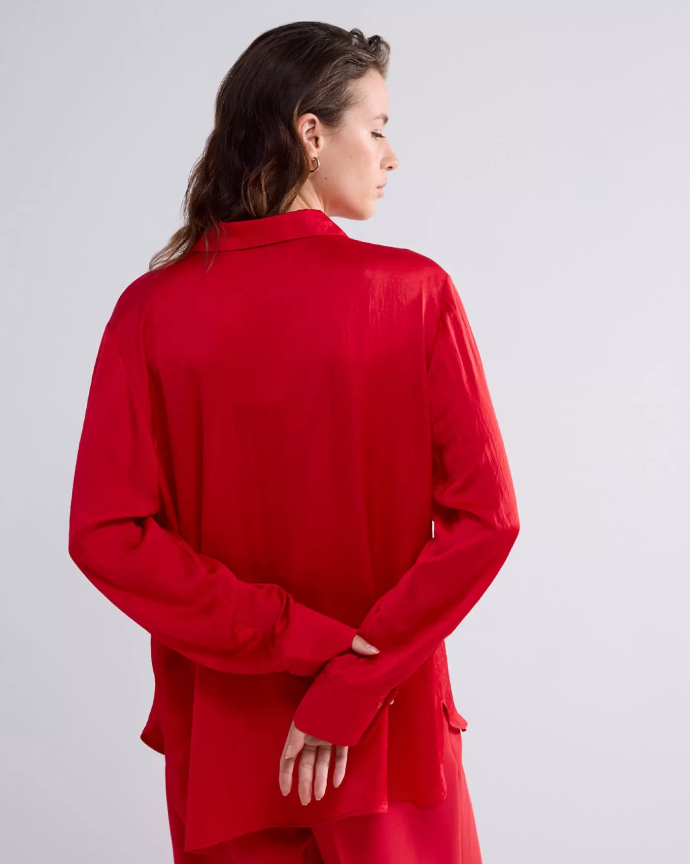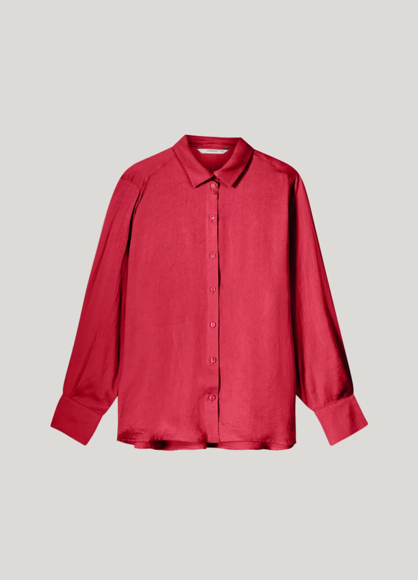 Klassieke blouse van soepelvallende glanzende stof. De blouse heeft een afgeronde onderkant en knoopsluiting met ton-sur-ton knoopjes. Wij adviseren om een maatje kleiner te bestellen. klassieke fit glanzende stof afgeronde onderkant ton-sur-ton knoopjes