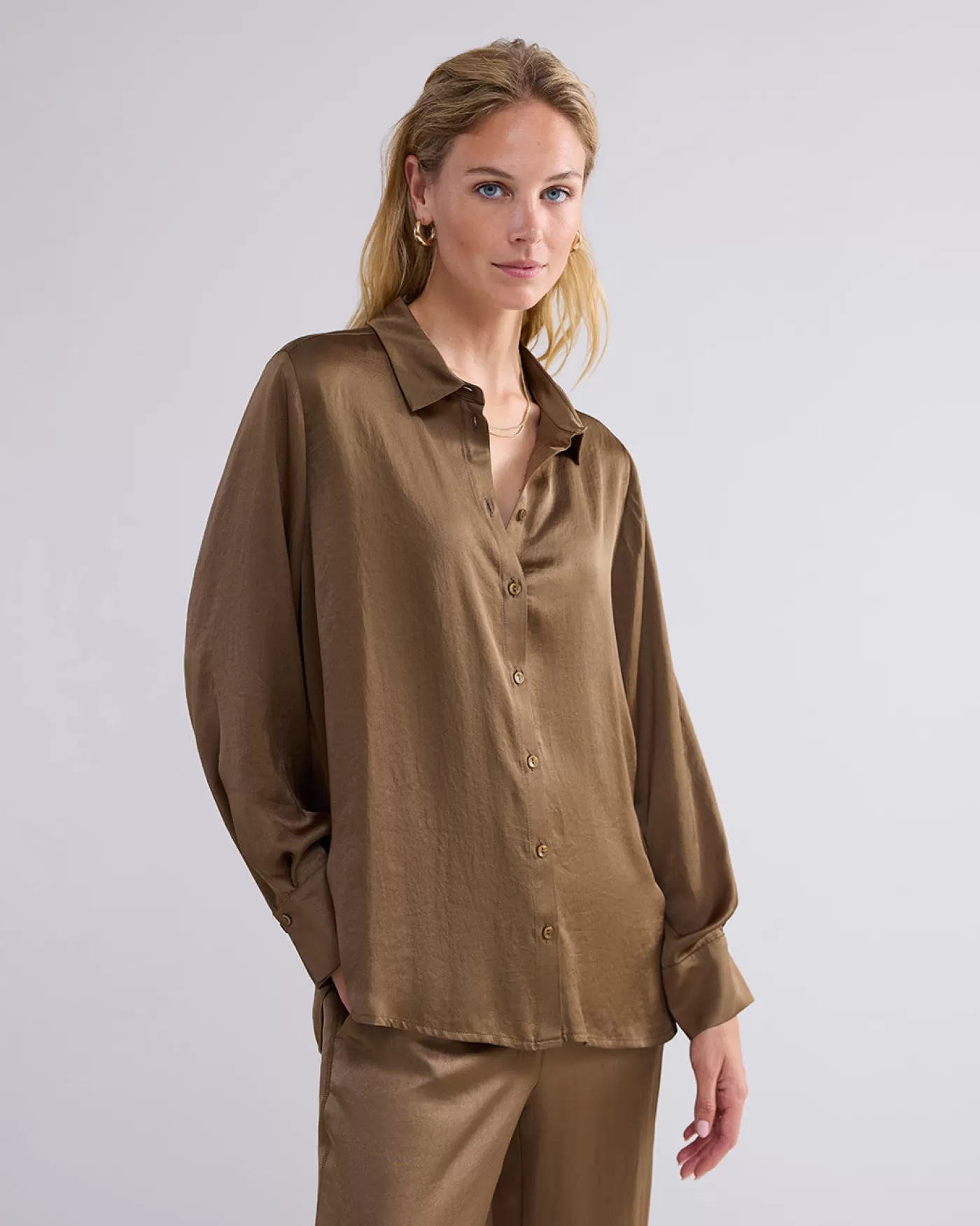 Klassieke blouse van soepelvallende glanzende stof. De blouse heeft een afgeronde onderkant en knoopsluiting met ton-sur…