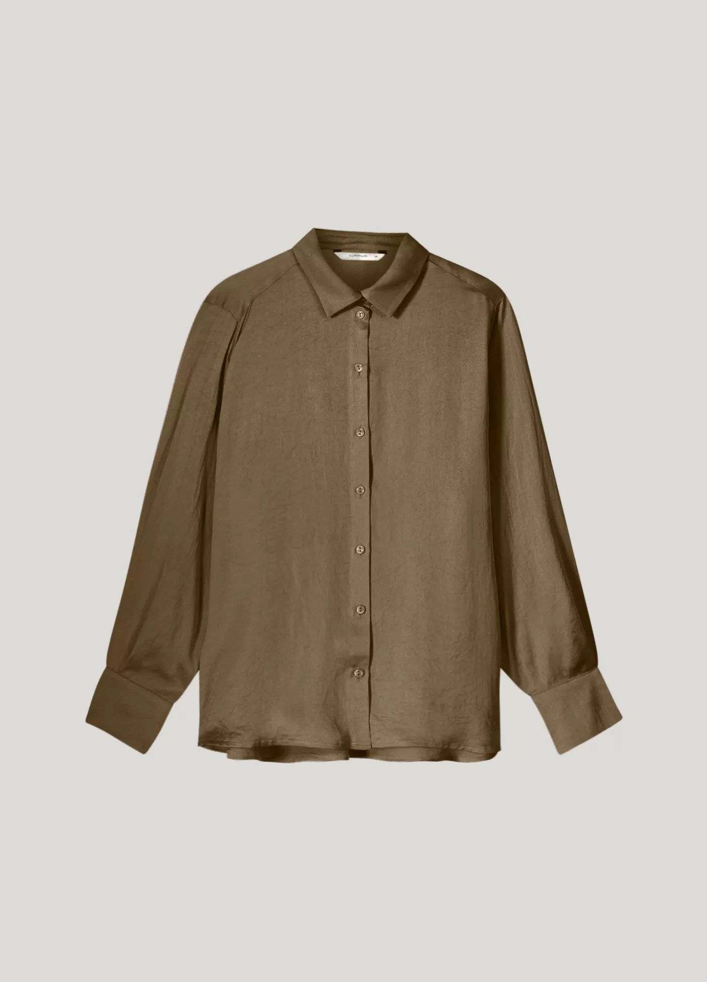Klassieke blouse van soepelvallende glanzende stof. De blouse heeft een afgeronde onderkant en knoopsluiting met ton-sur-ton knoopjes. klassieke fit glanzende stof afgeronde onderkant ton-sur-ton knoopjes