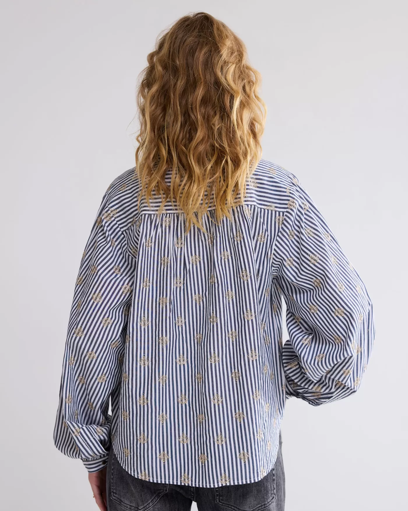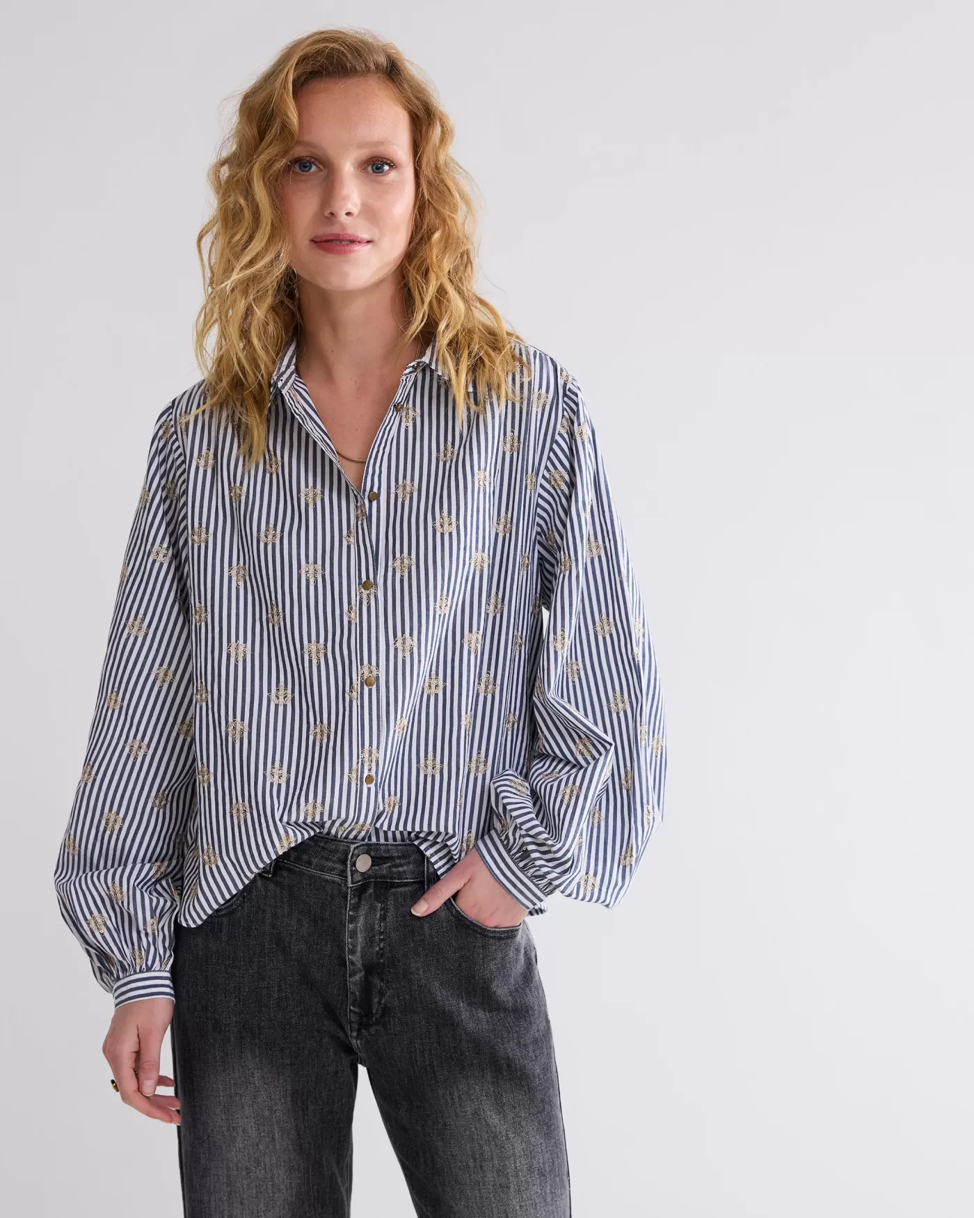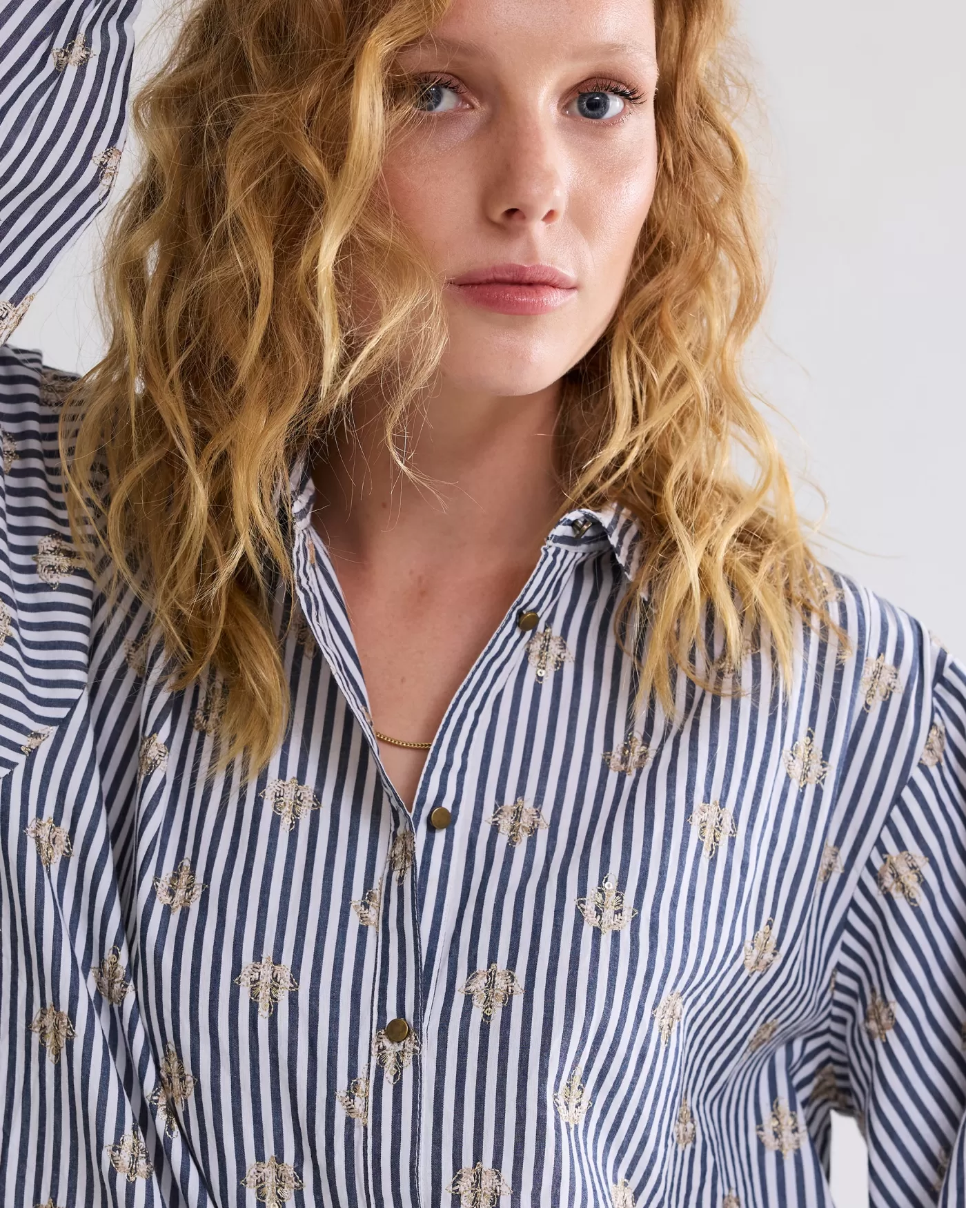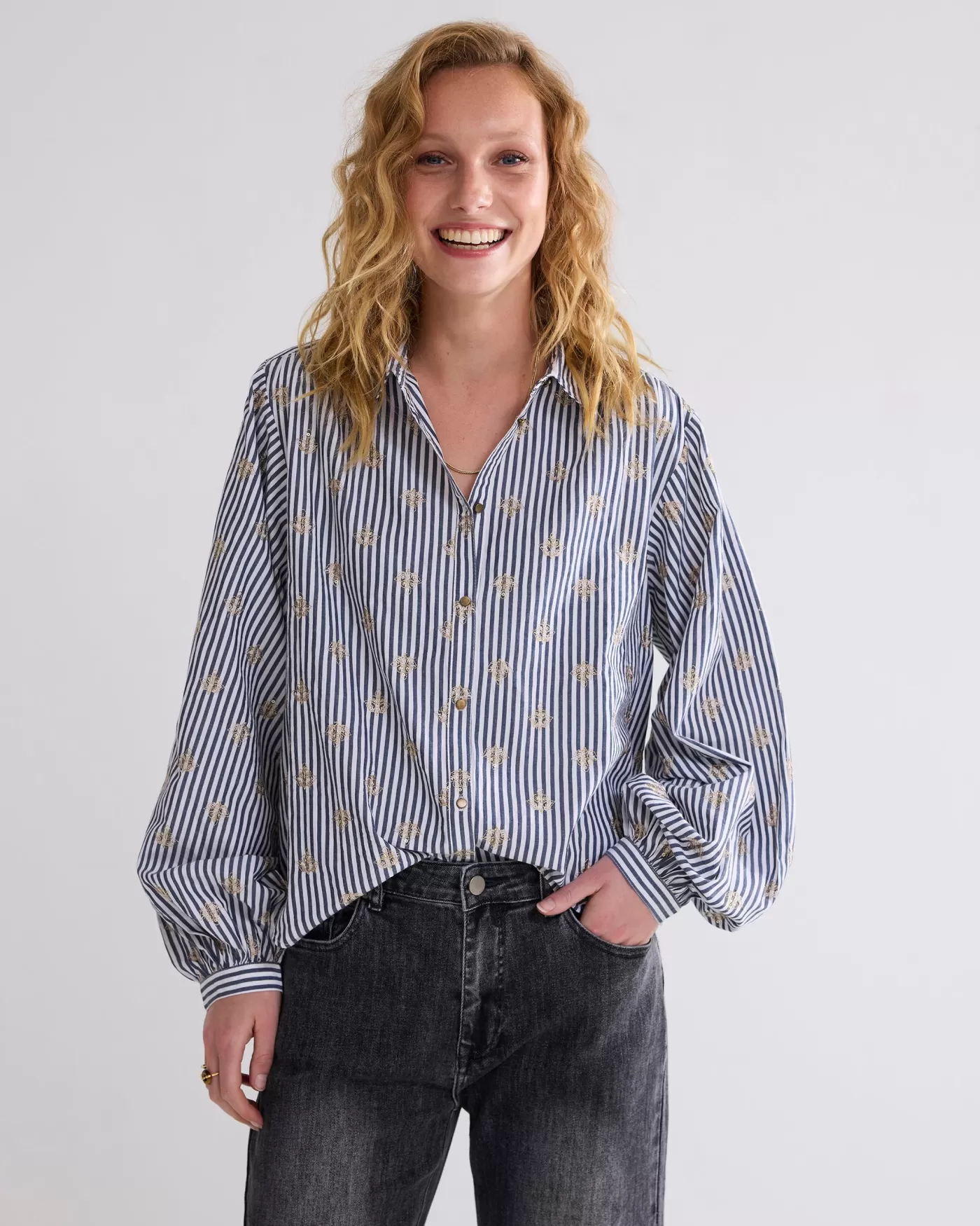 Blouse met lange ballonmouwen, gemaakt van gestreepte katoenen stof met metallic bloemen borduurwerk. De stof heeft een knoopsluiting met kleine messing knoopjes. lange ballonmouwen metallic bloemen dessin messing knoopjes gestreept patroon