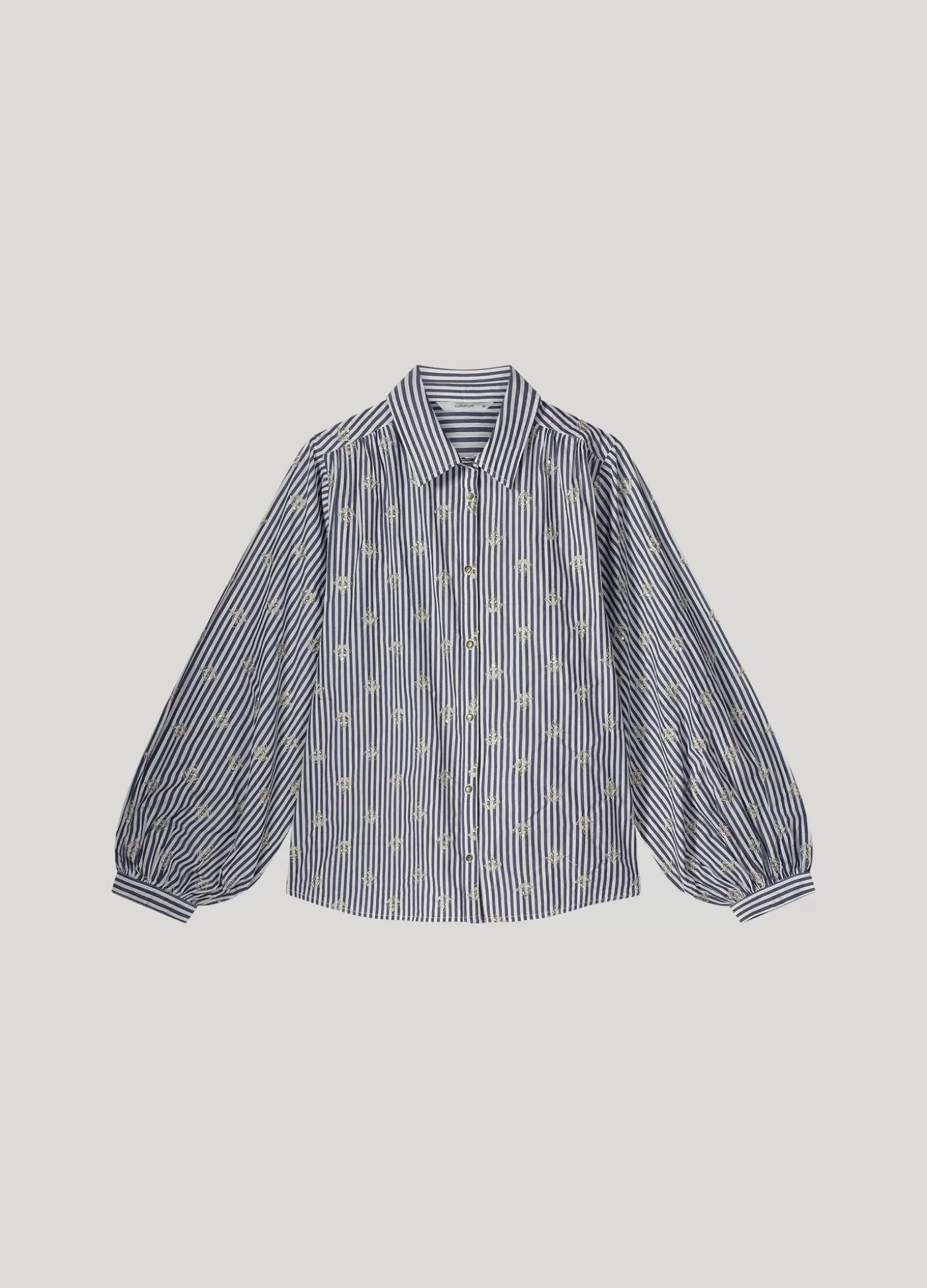 Blouse met lange ballonmouwen, gemaakt van gestreepte katoenen stof met metallic bloemen borduurwerk. De stof heeft een …