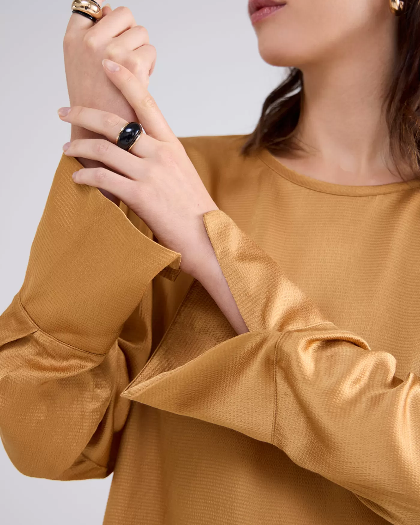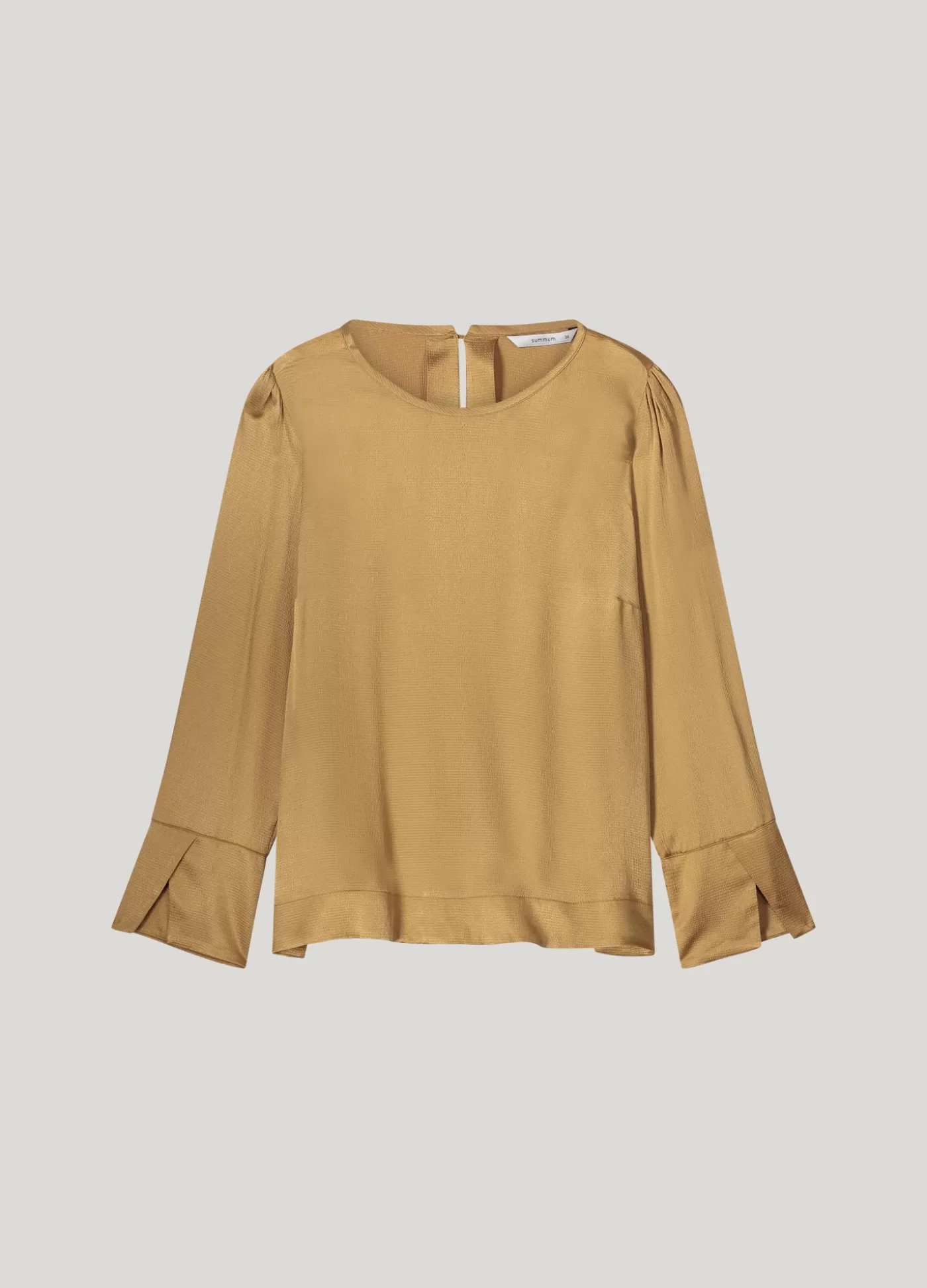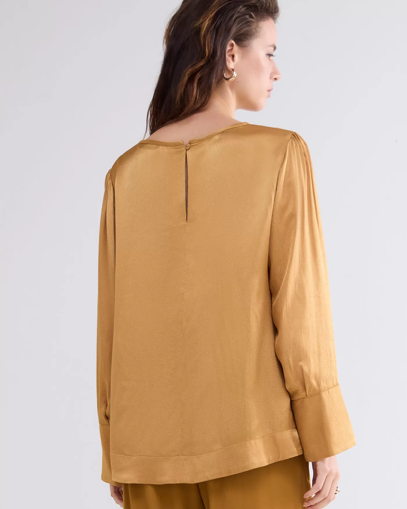 Top met een ronde hals en een splitje en knoopje aan de achterkant. De top heeft brede manchetten met overslagsplit en coupenaadjes op borsthoogte. Gemaakt van gehamerd viscose met een glanzende afwerking. ronde hals met split brede manchetten met overslagsplit zij-splitjes aan de onderkant gehamerd, glanzend viscose