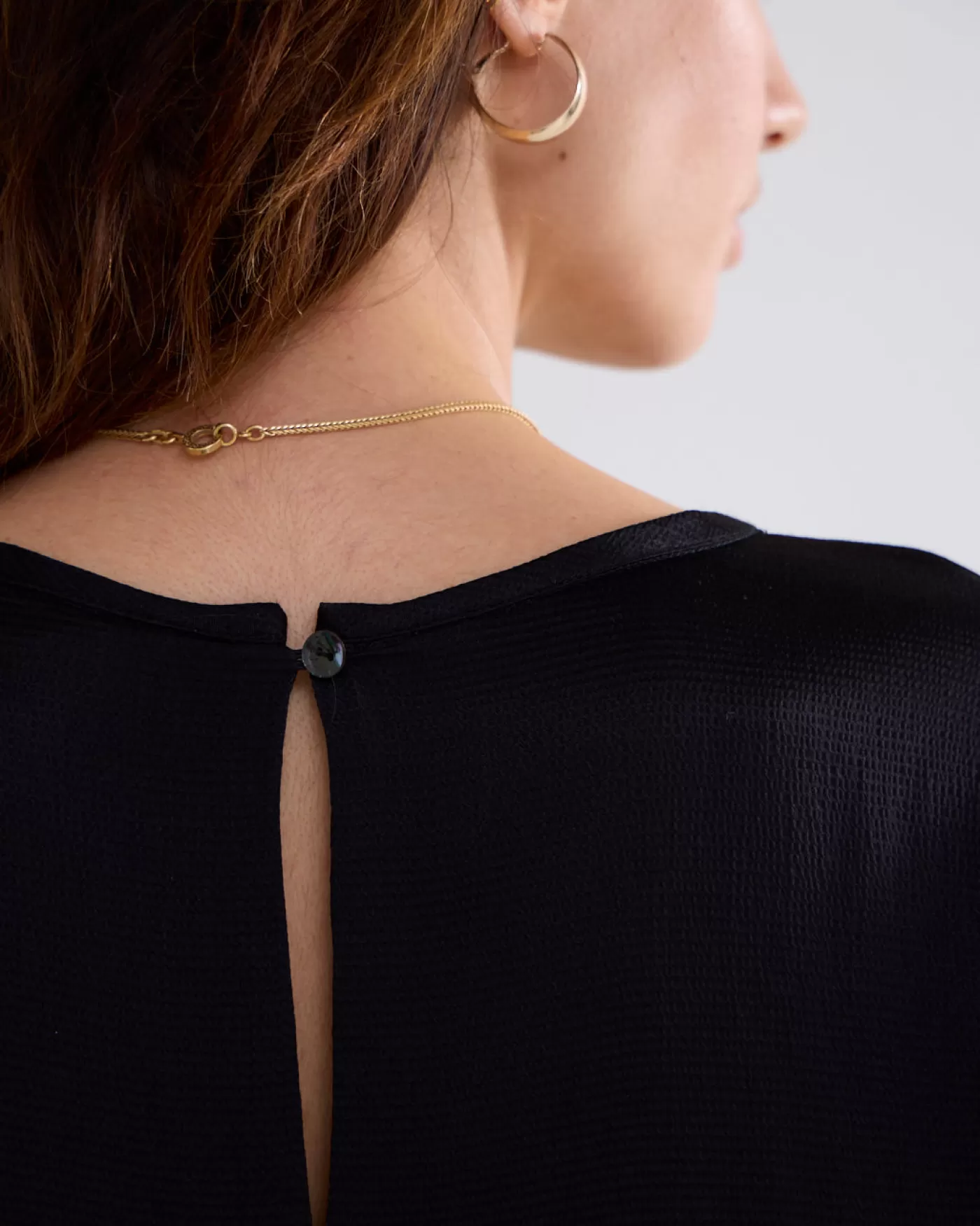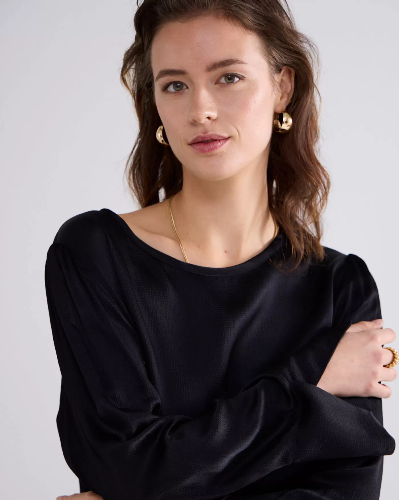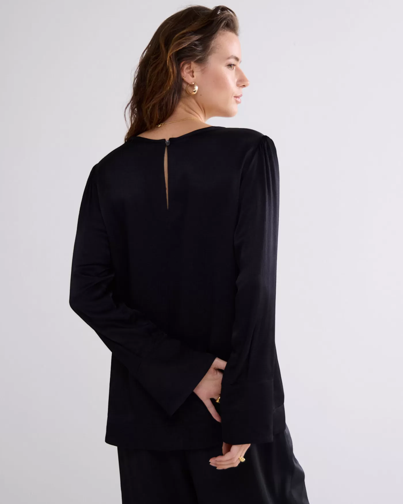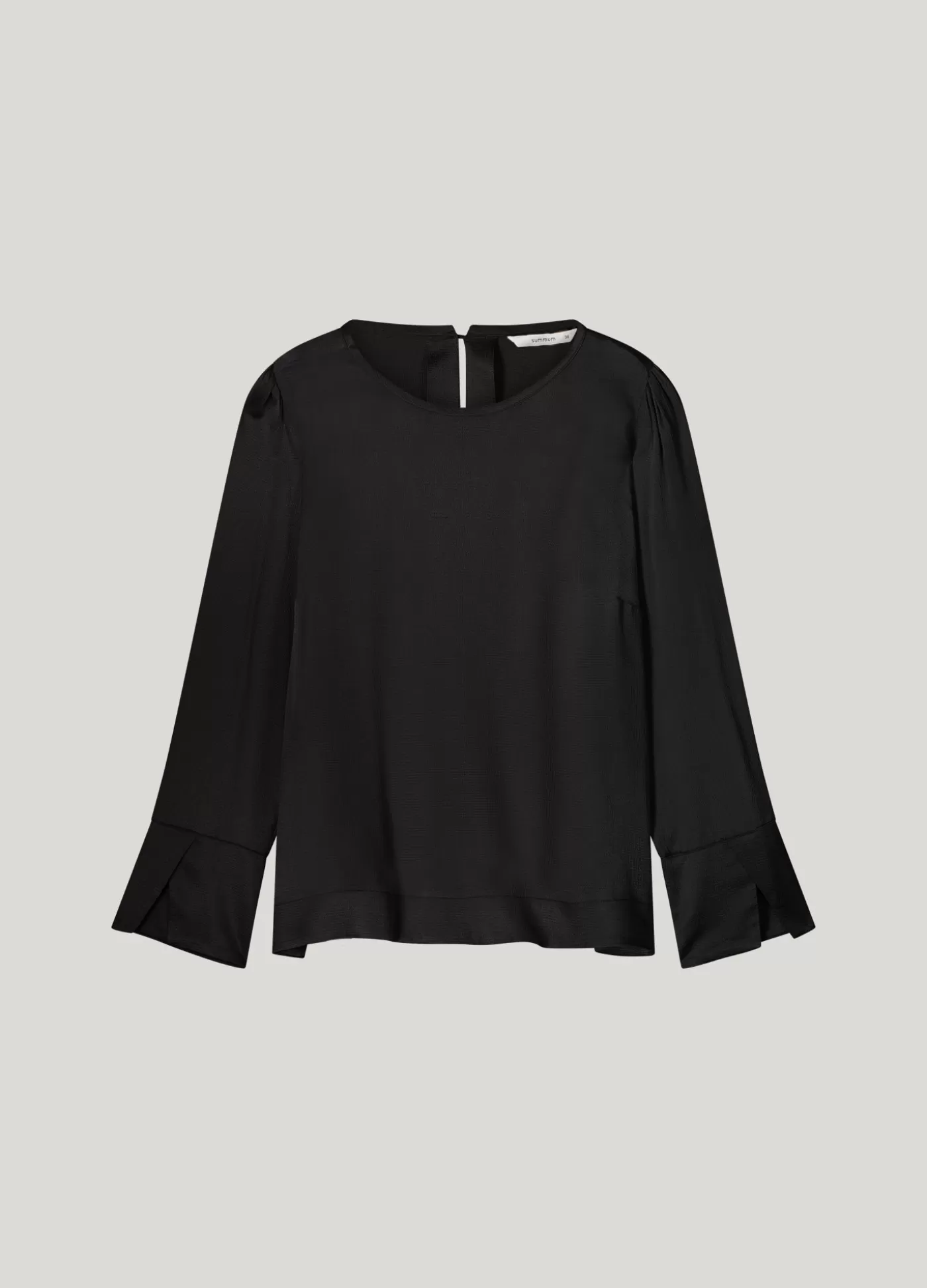 Top met een ronde hals en een splitje en knoopje aan de achterkant. De top heeft brede manchetten met overslagsplit en coupenaadjes op borsthoogte. Gemaakt van gehamerd viscose met een glanzende afwerking. ronde hals met split brede manchetten met overslagsplit zij-splitjes aan de onderkant gehamerd, glanzend viscose