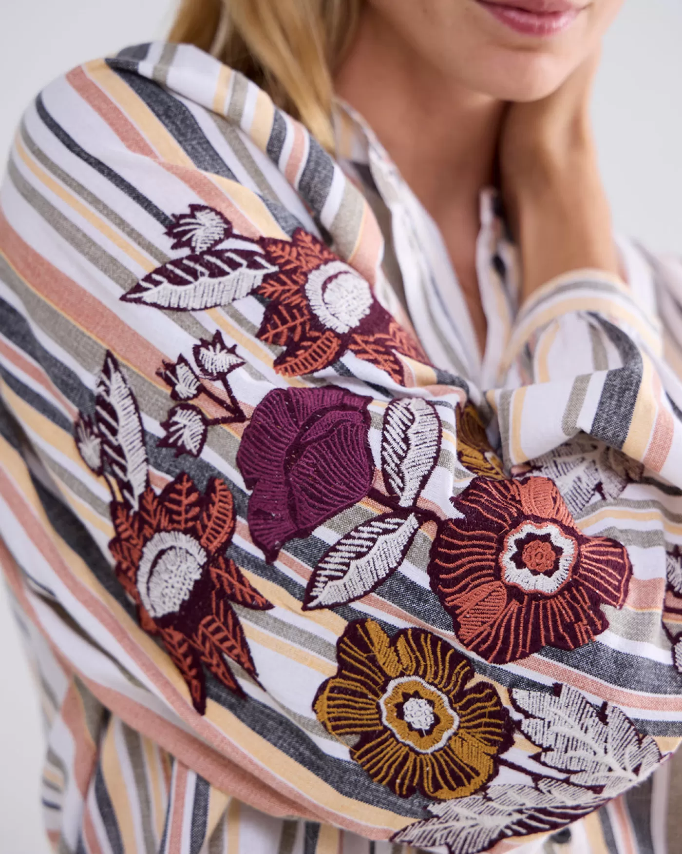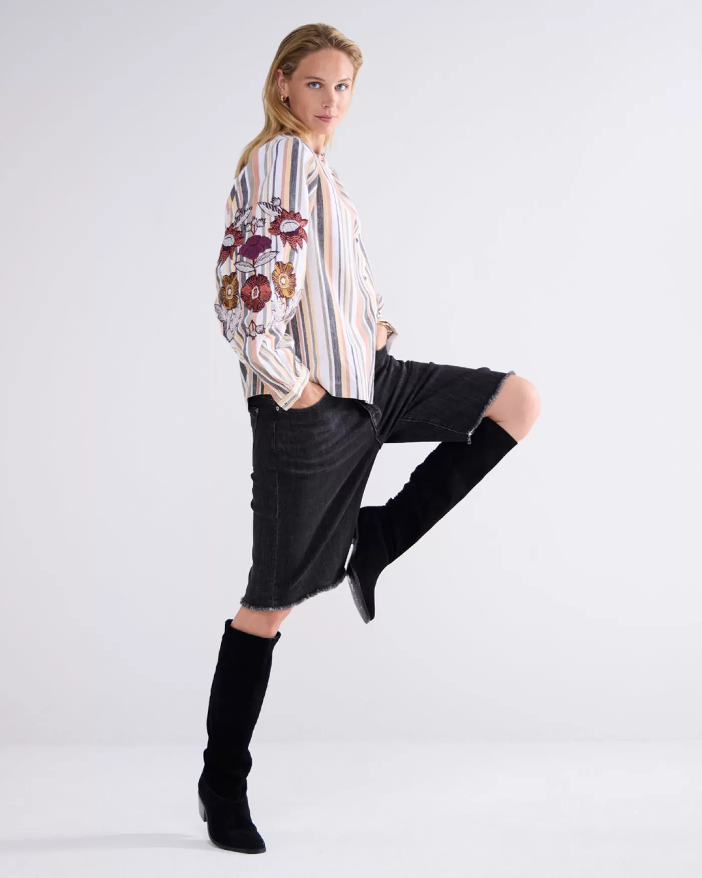 Blouse met lange wijde mouwen en een opstaande ronde hals, gemaakt van gestreepte katoenen stof. Versierd met bloemenbor…