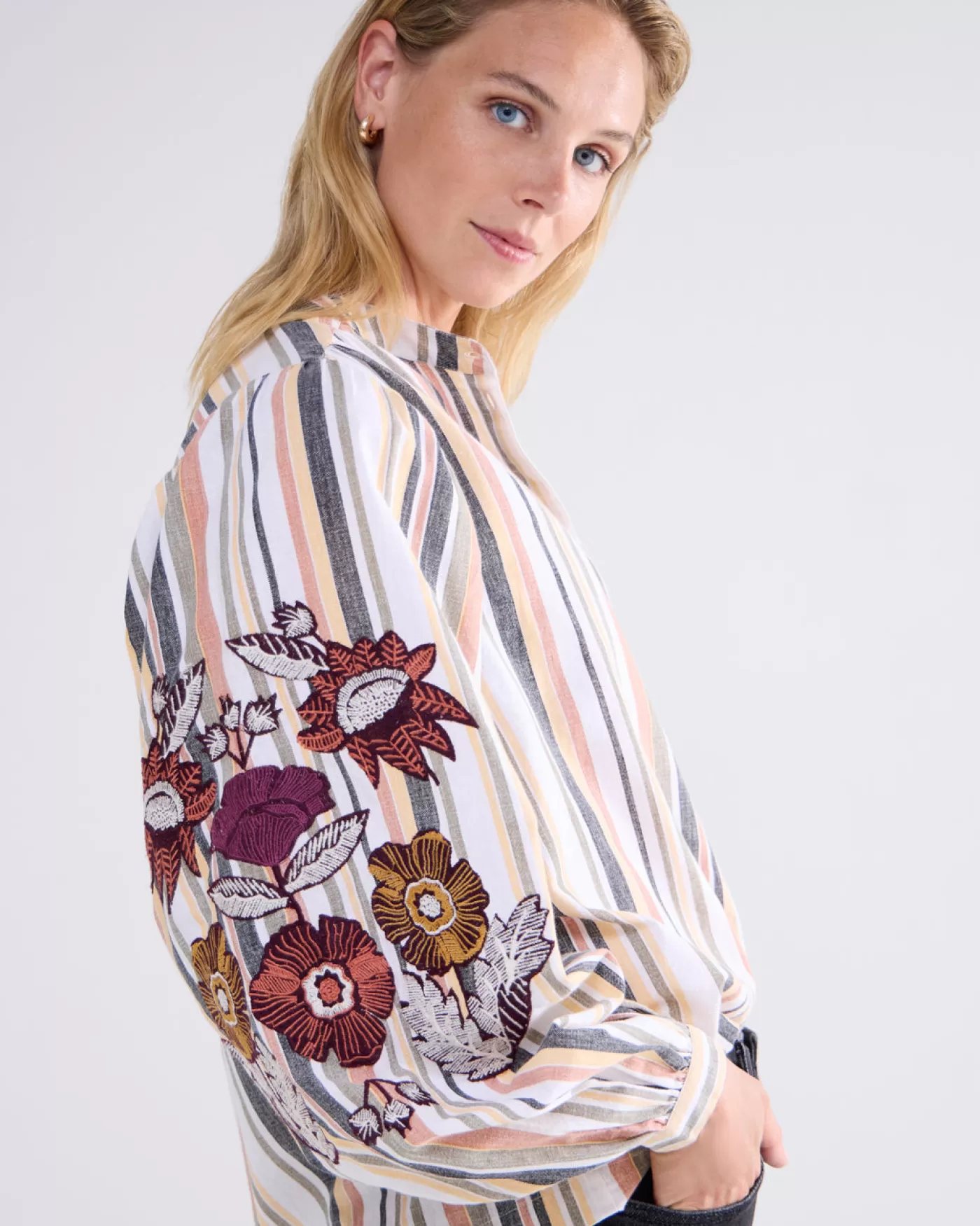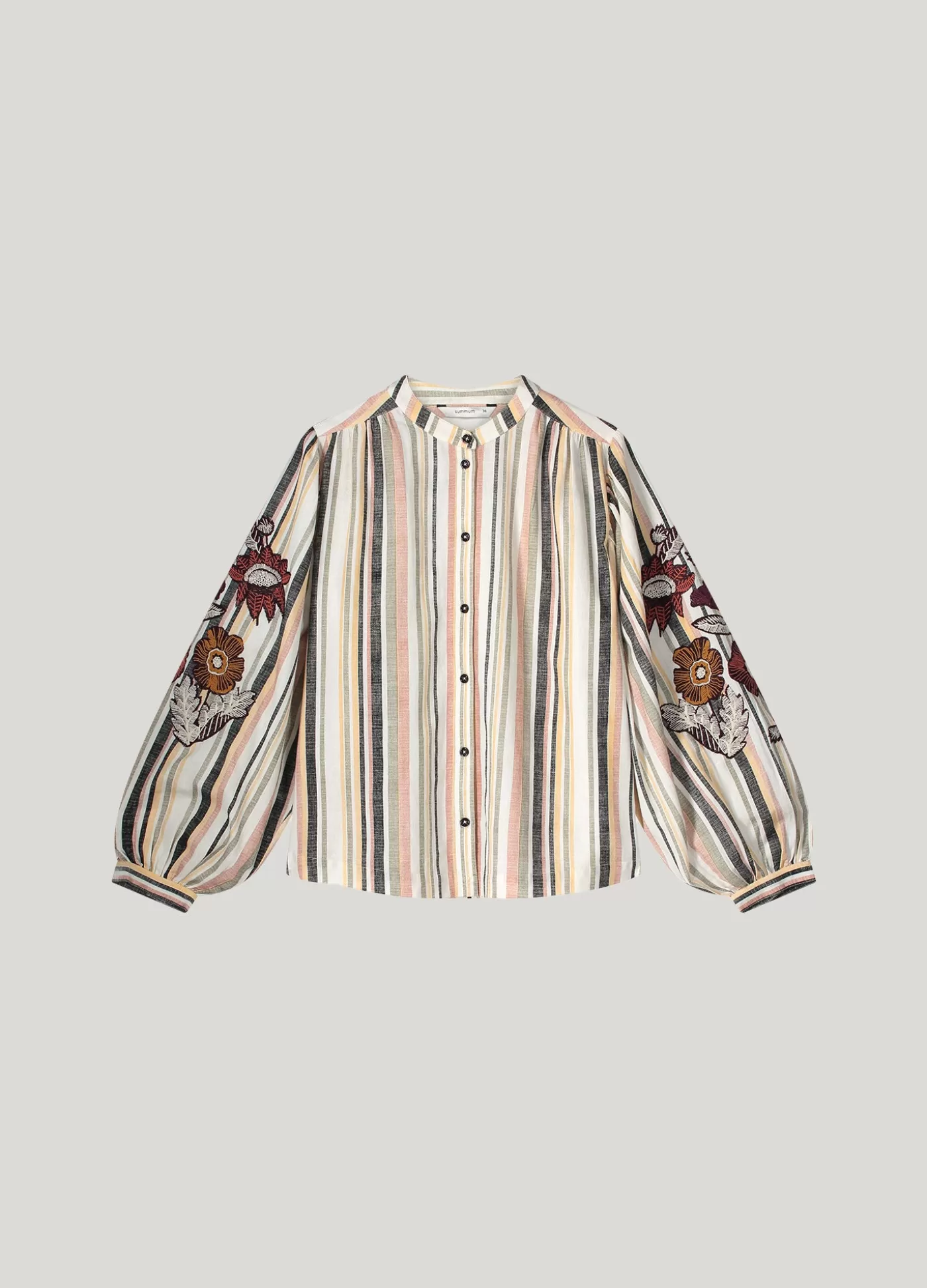 Blouse met lange wijde mouwen en een opstaande ronde hals, gemaakt van gestreepte katoenen stof. Versierd met bloemenborduurwerk op de pofmouwen. wijde fit opstaande ronde hals bloemen borduurwerk knoopsluiting