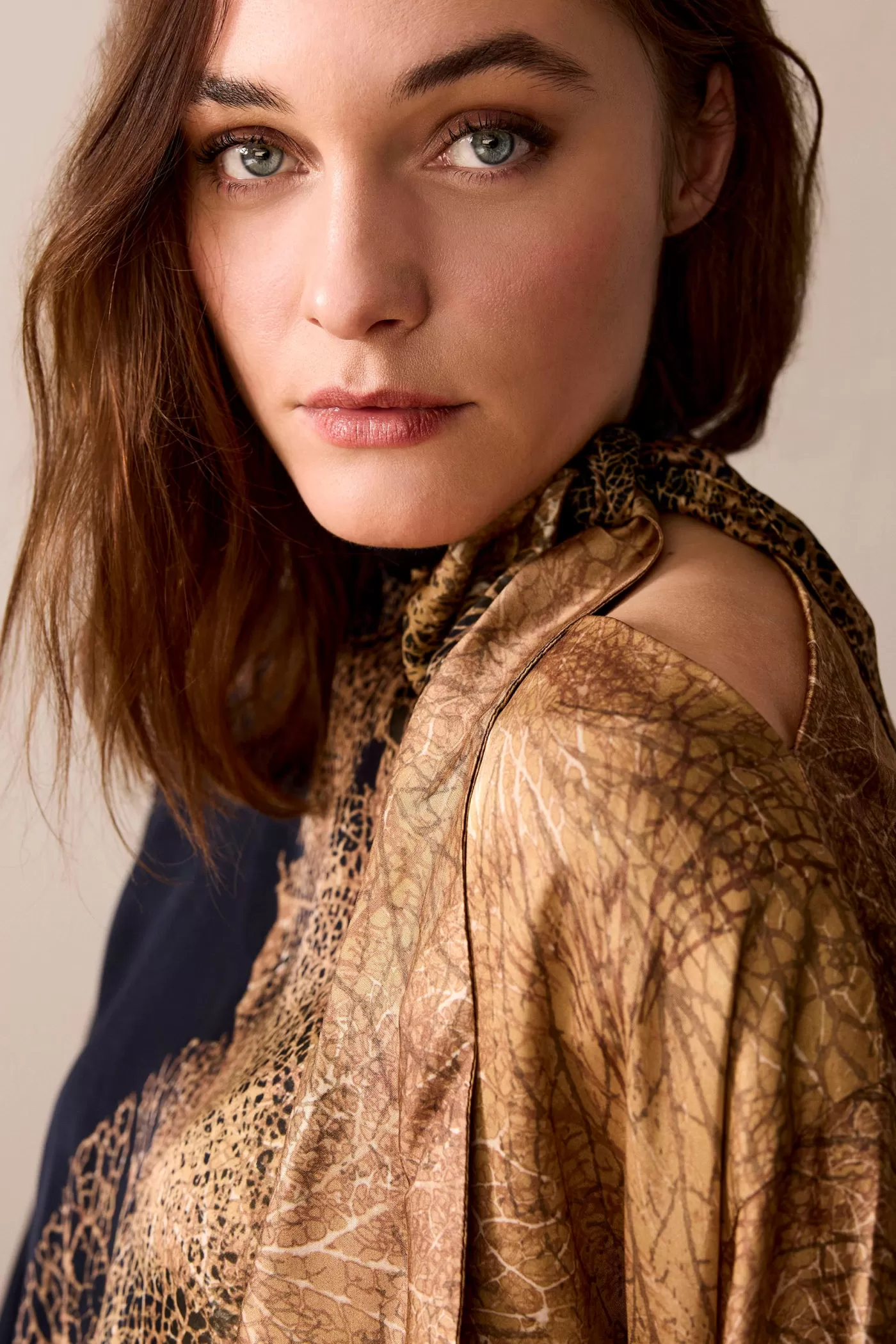 Top met vaste strik in de hals en levendige bladprint in een lichtglanzende soepele stof. De top heeft vleermuismouwen m…