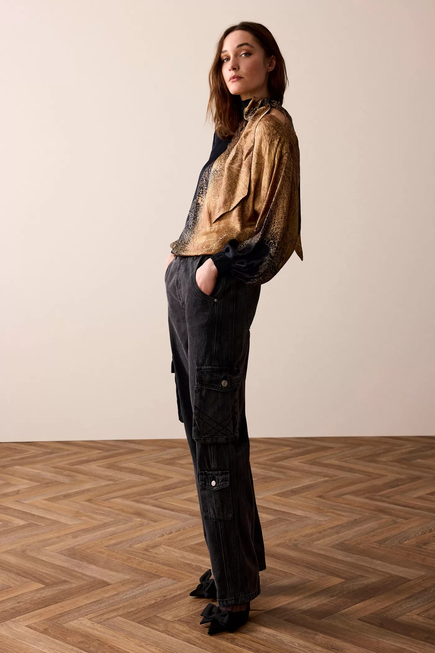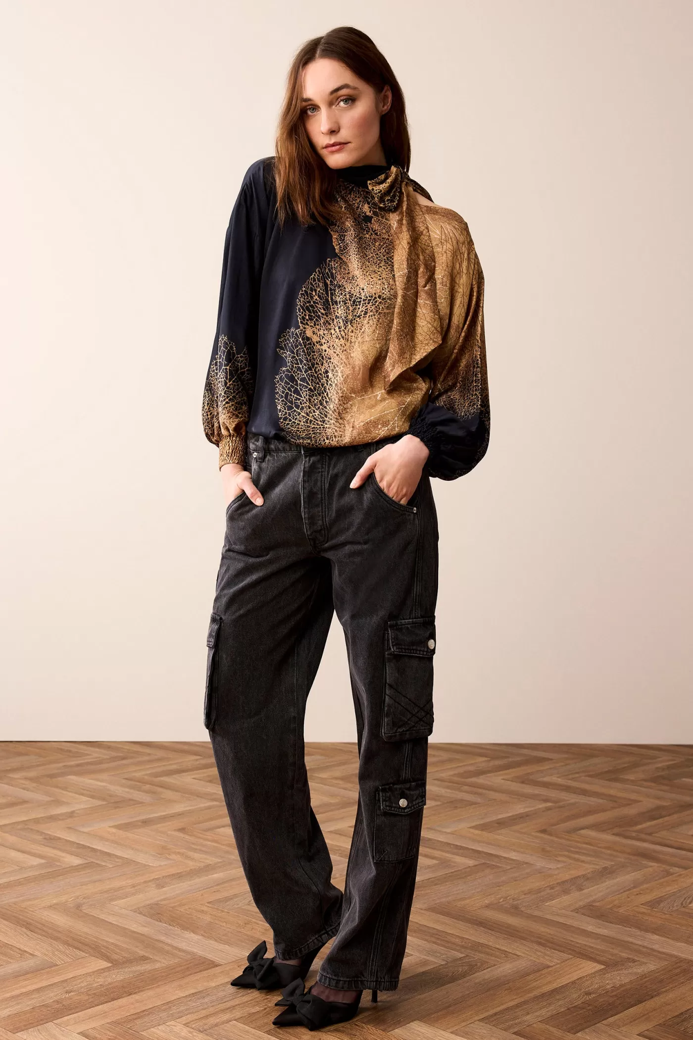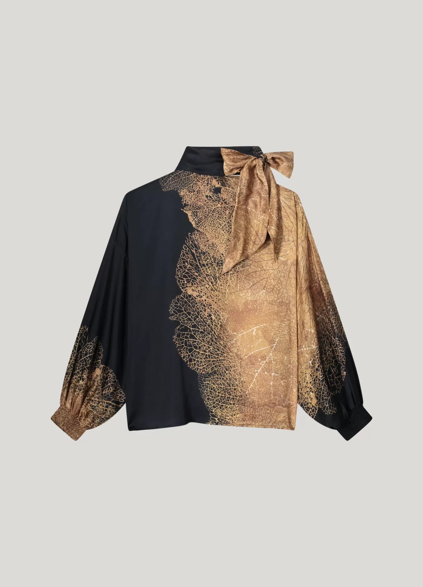 Top met vaste strik in de hals en levendige bladprint in een lichtglanzende soepele stof. De top heeft vleermuismouwen met gesmokte manchetten. bladprint vleermuismouwen vaste strik in de hals soepele stof