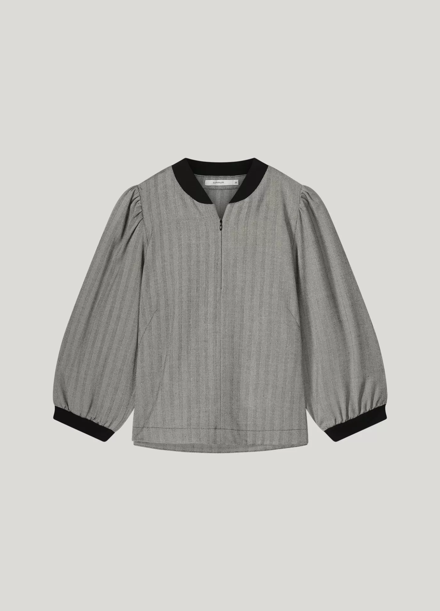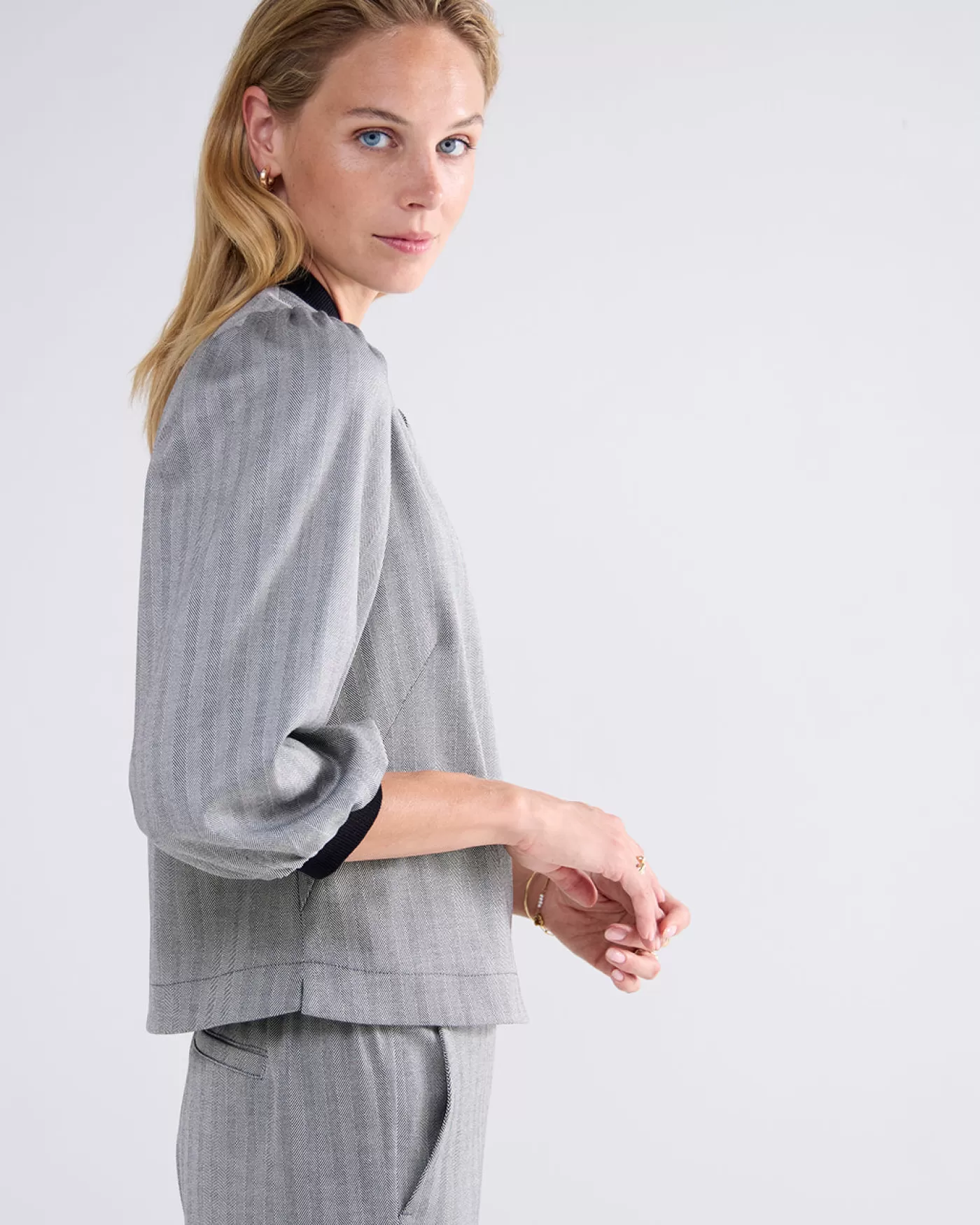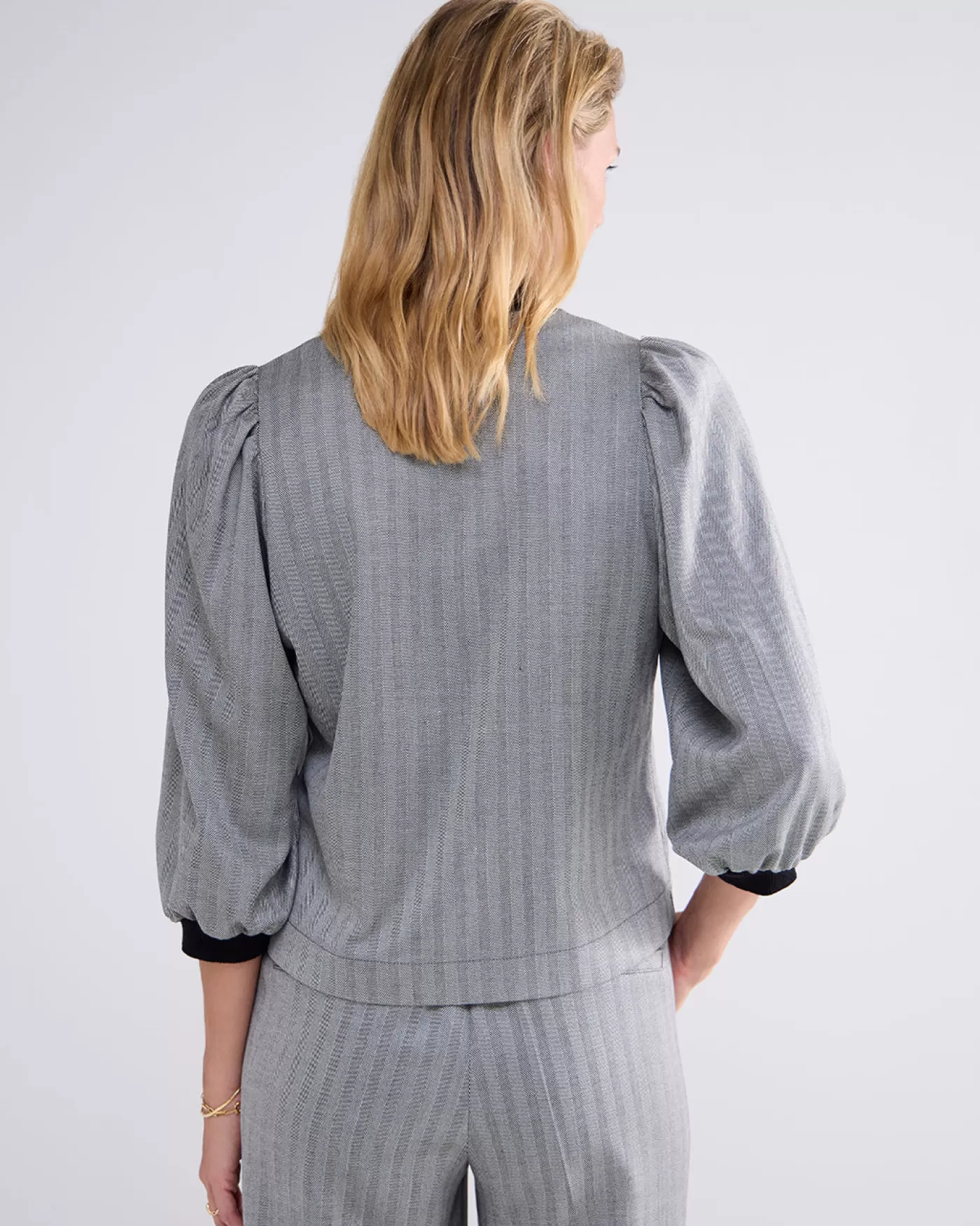 De top is gemaakt van een visgraat dessin en heeft pofmouwen tot de elleboog. De top heeft een ronde hals met een blinde ritssluiting en splitjes in de zijnaad. loose fit pofmouwen ronde hals splitjes in de zijnaad