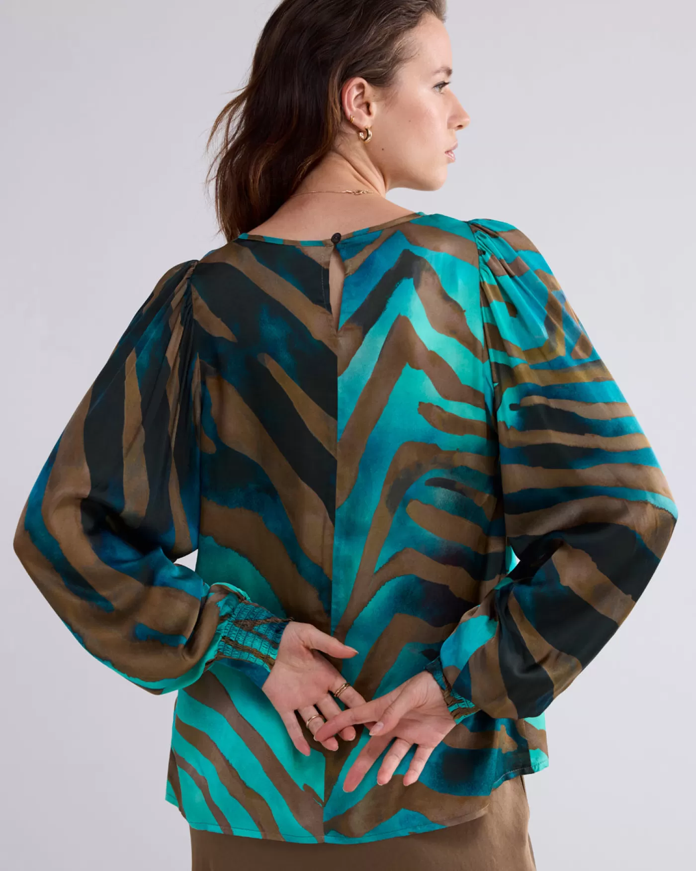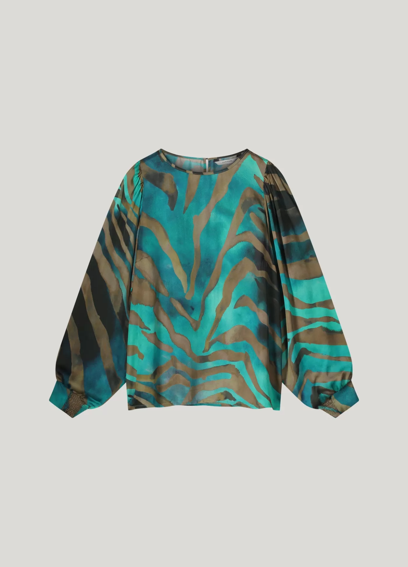 Top met ronde hals in een licht glanzende, satijnen stof. De top heeft pofmouwen met gedeeltelijk gesmokte manchetten. smalle boothals satijnen lichte glanzende stof pofmouwen gedeeltelijke gesmokte boorden