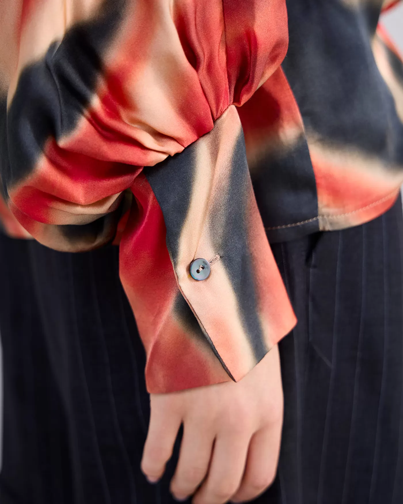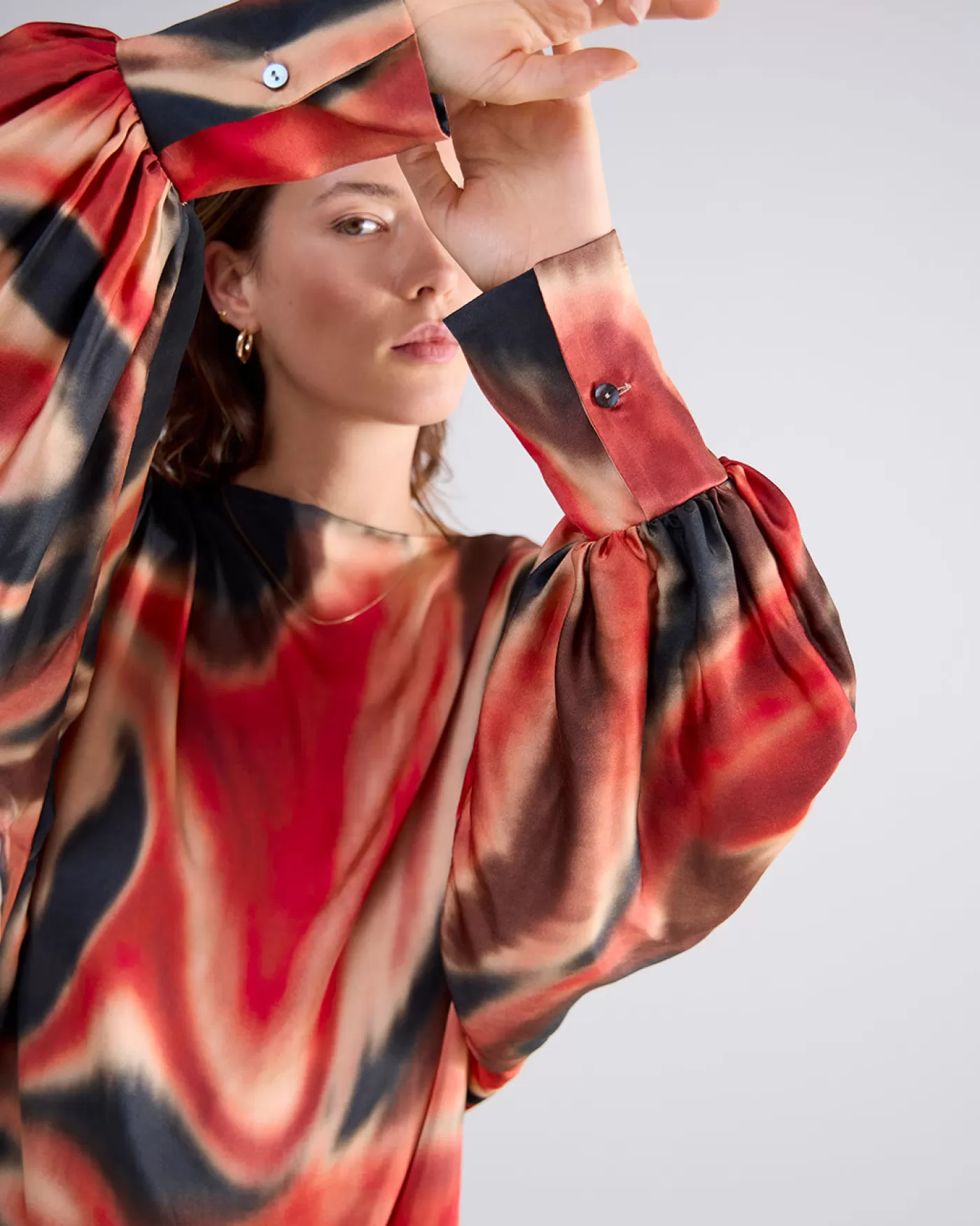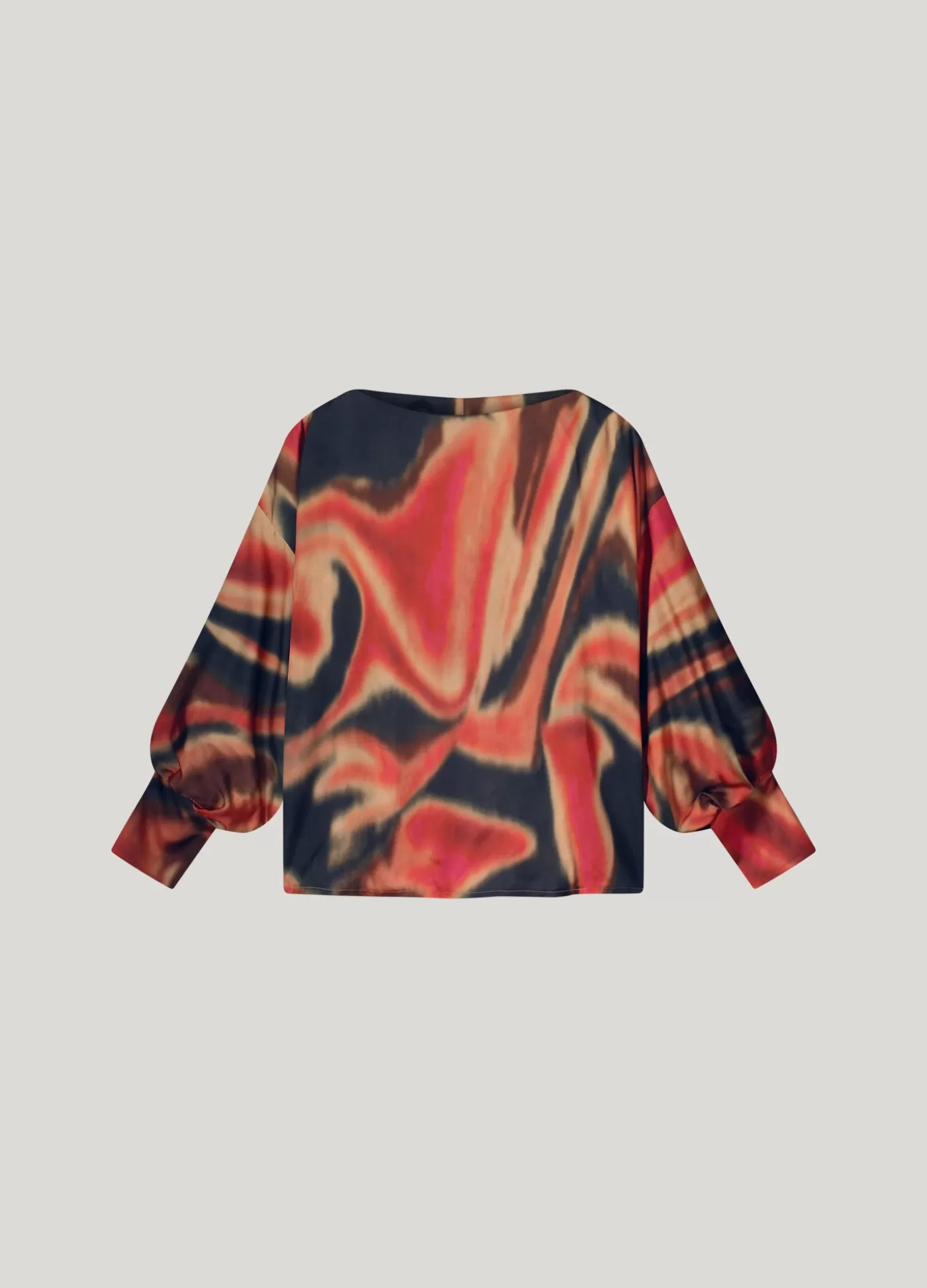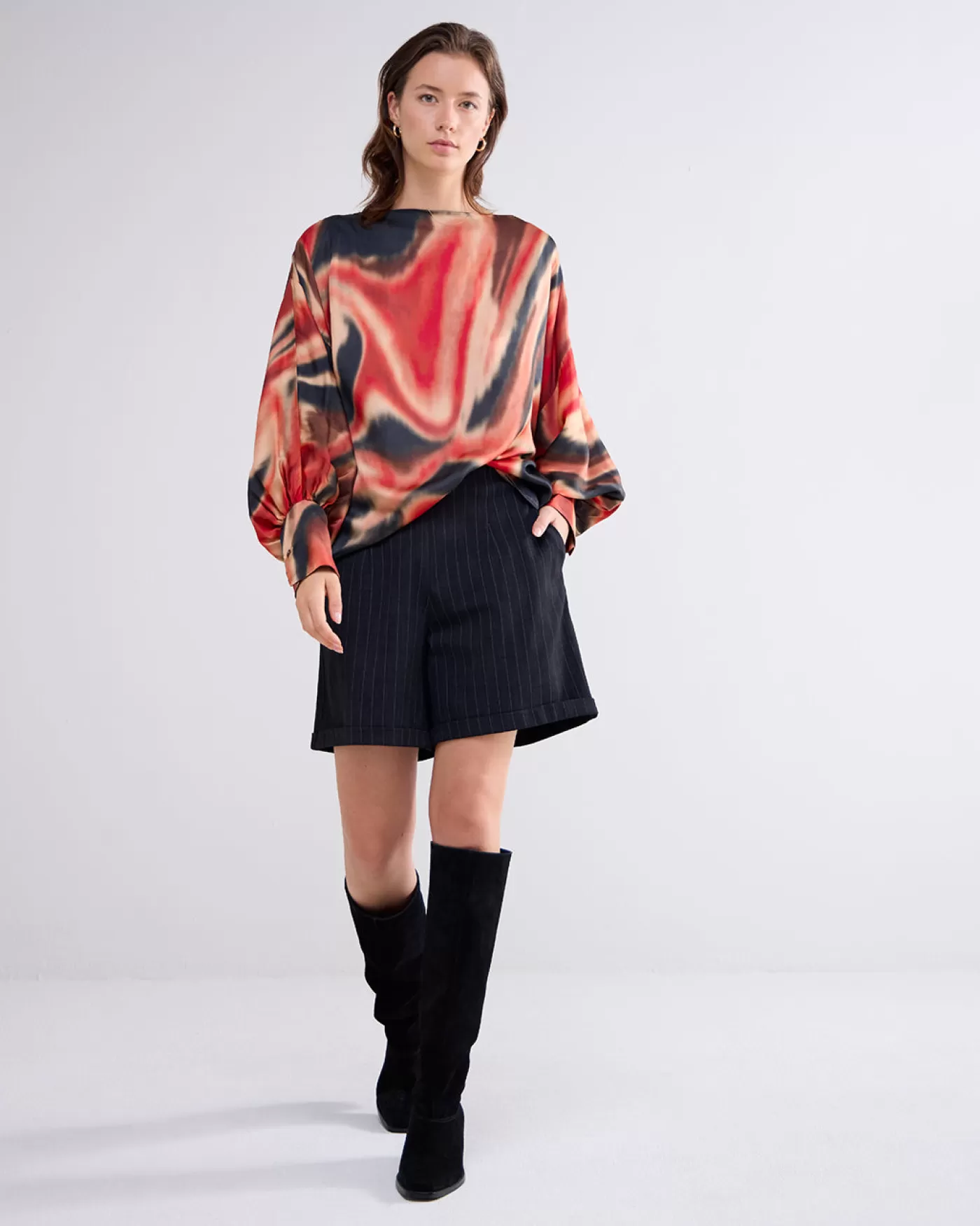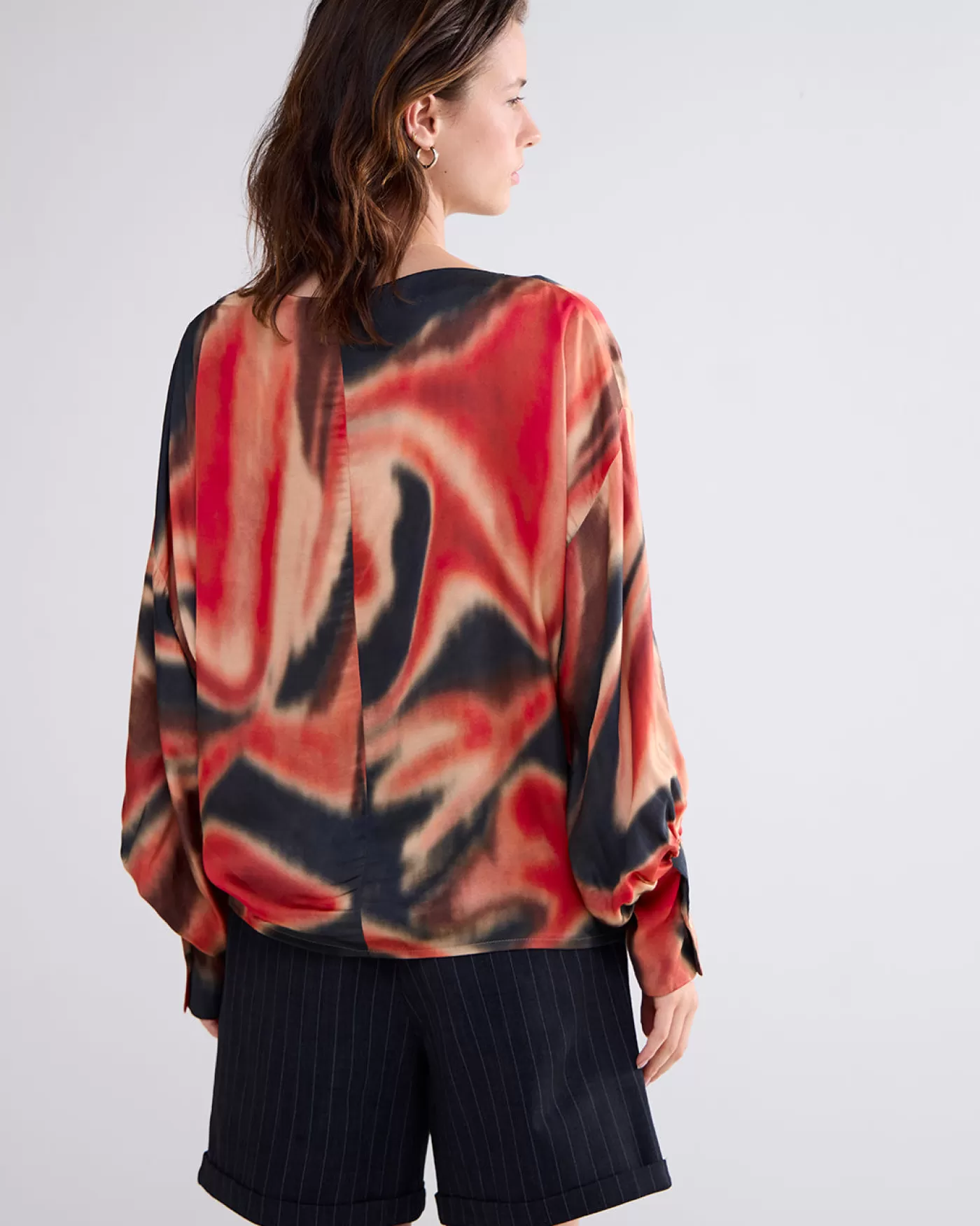 Top met smalle boothals in een licht glanzende, bedrukte stof. De top heeft vleermuismouwen met strakke manchetten. smalle boothals lichte glanzende stof vleermuismouw gedeeltelijke gesmokte boorden