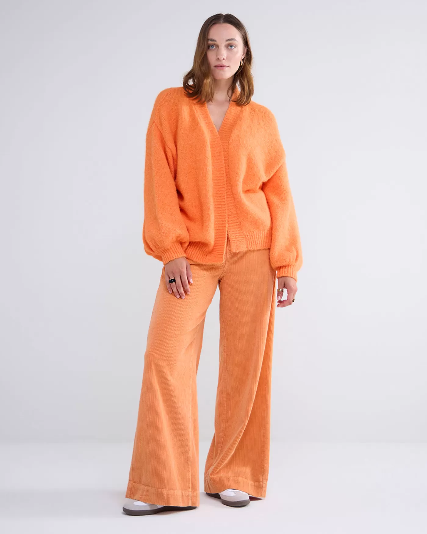 Flared broek met wijde uitlopende pijpen en hoge taille, gemaakt van soepele corduroy. Voorzien van gulp met ritssluiting. wijde flared pijpen hoge taille soepele corduroy gulp met ritssluiting