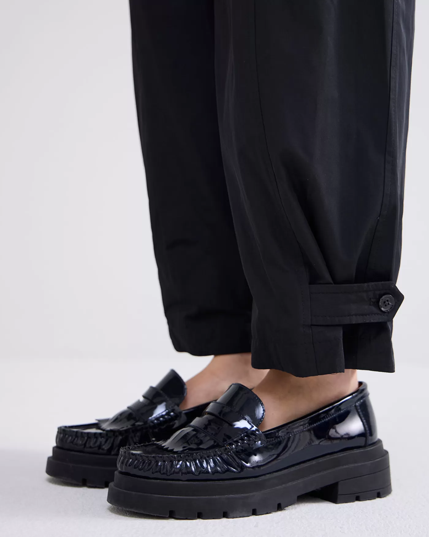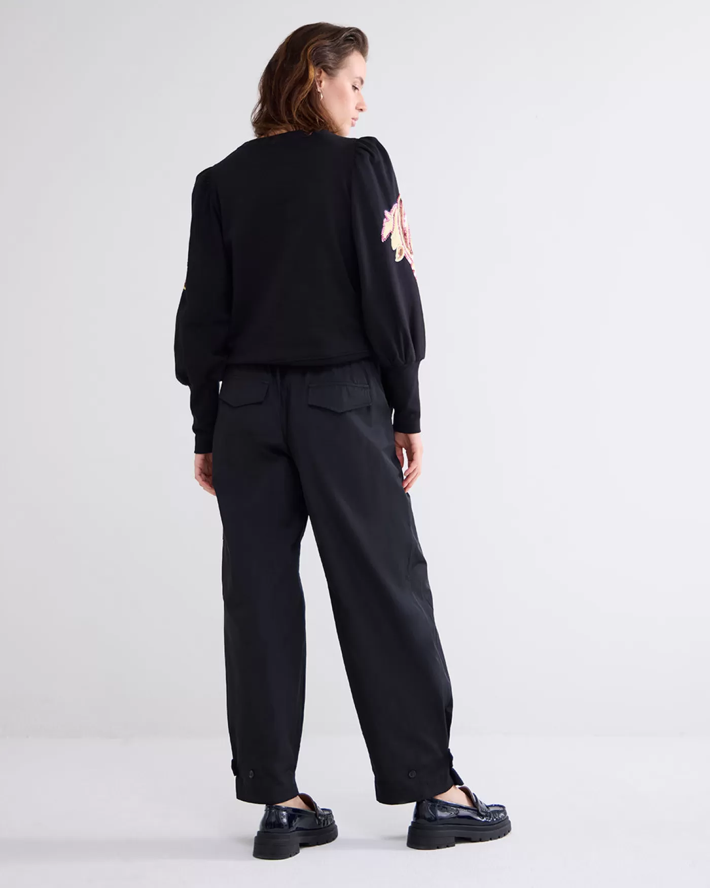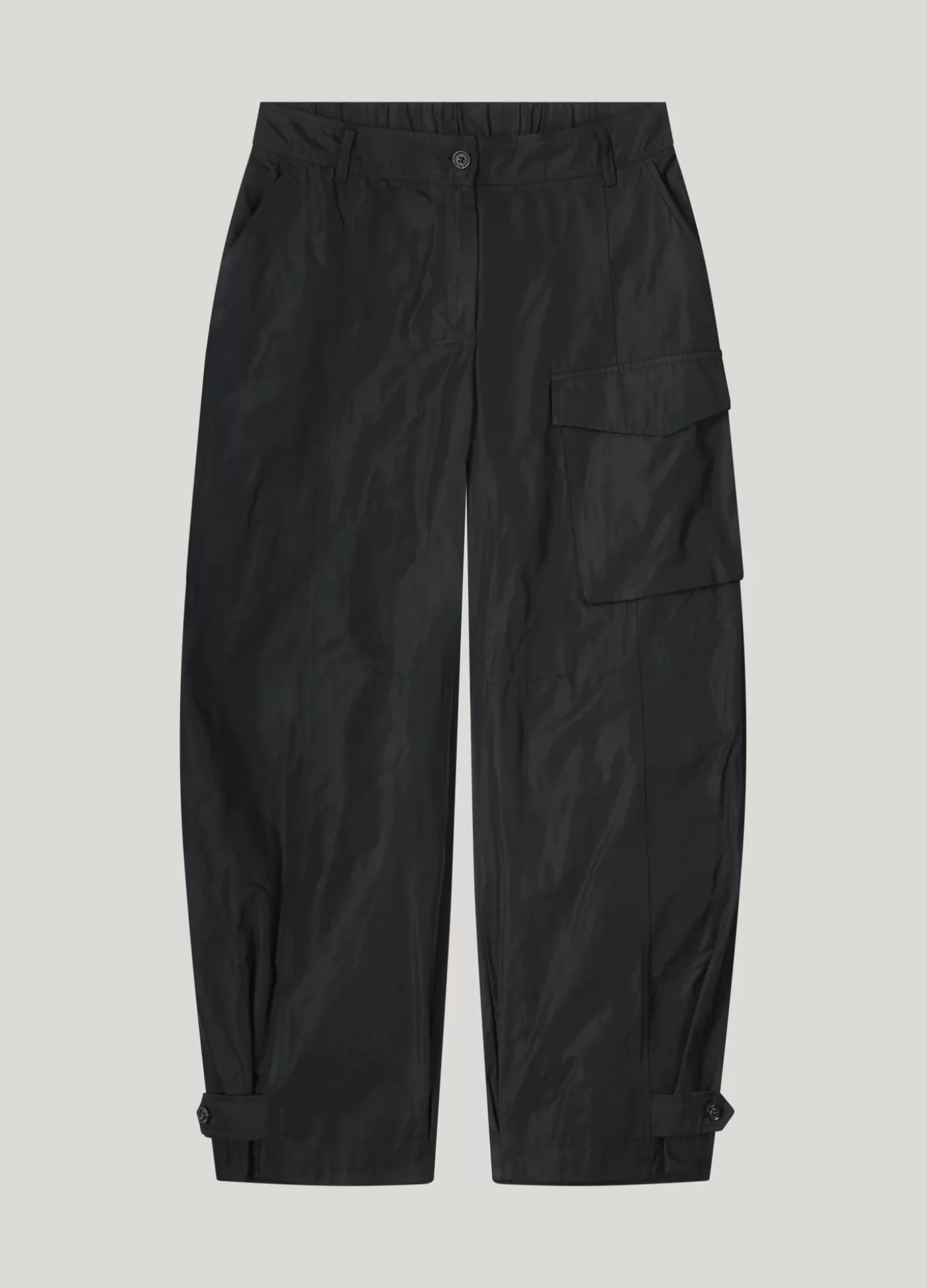Cargobroek gemaakt van taft met verstelbare broekspijpen. De broek heeft steekzakken, een grote opgestikte zak met klep …