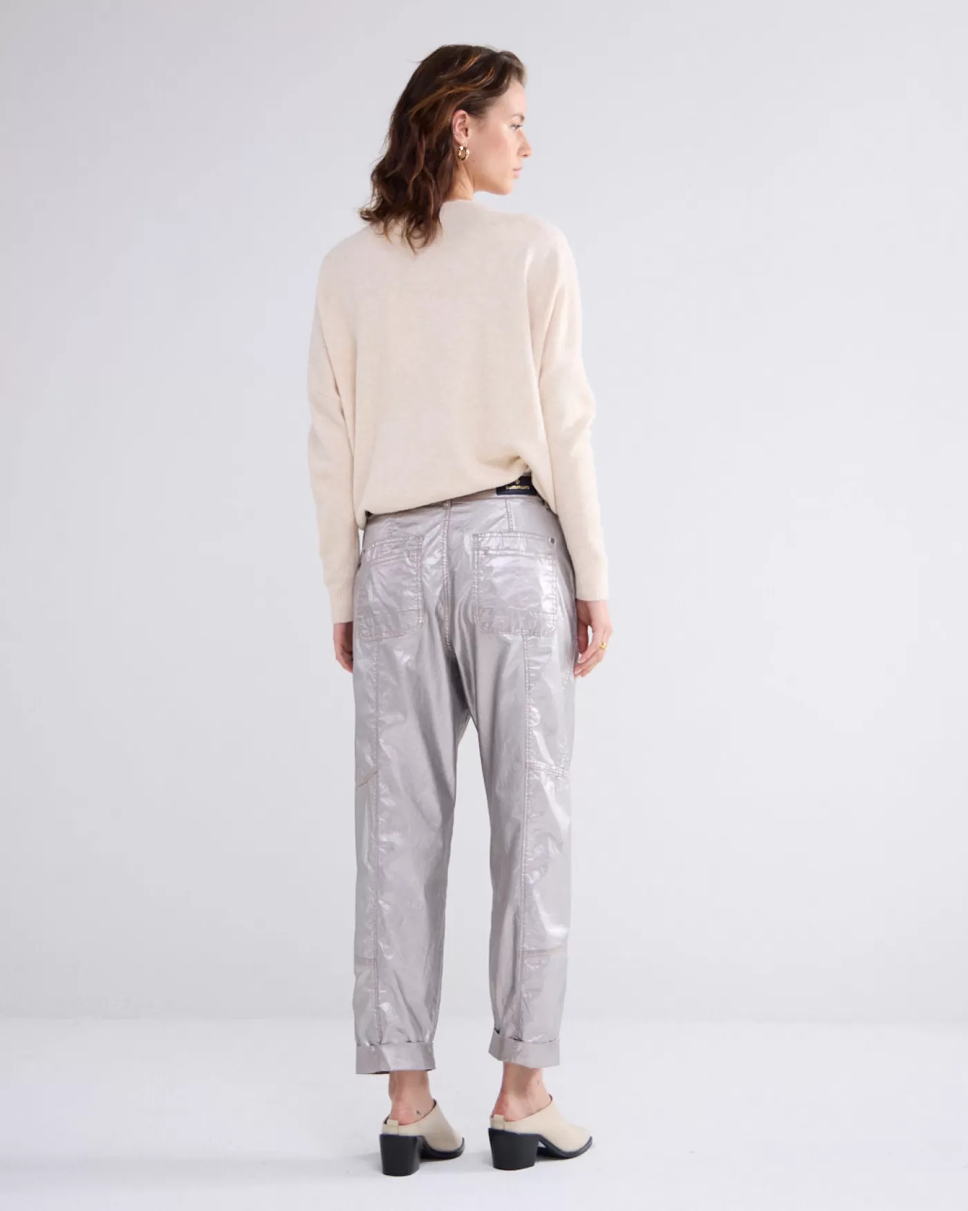 Loose fit pants met glimmende foil coating. De broek is voorzien van strookzakken, siernaden en een gulp met rits.loose …