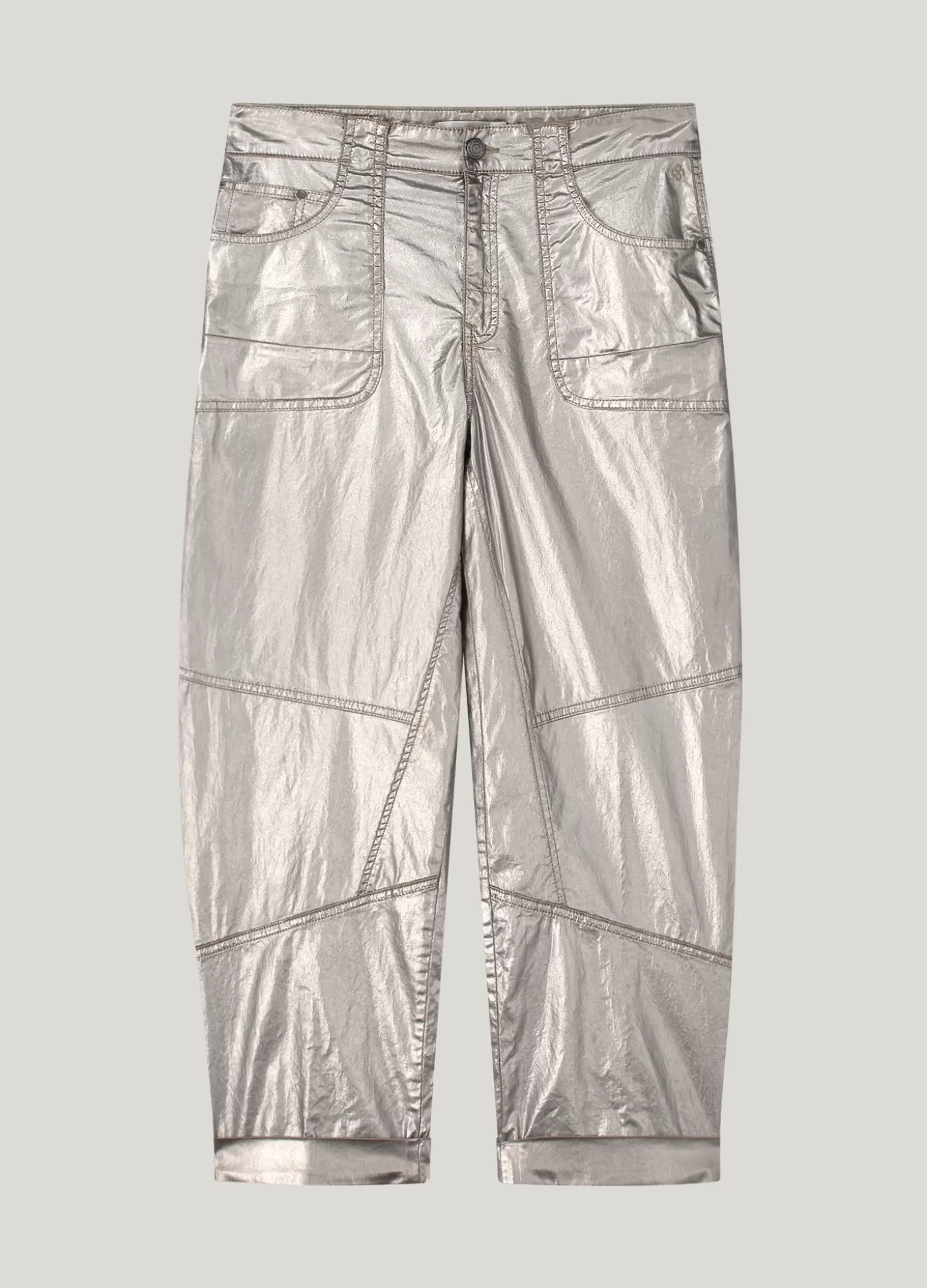 Loose fit pants met glimmende foil coating. De broek is voorzien van strookzakken, siernaden en een gulp met rits. loose fit strookzakken foil coating gulp met rits