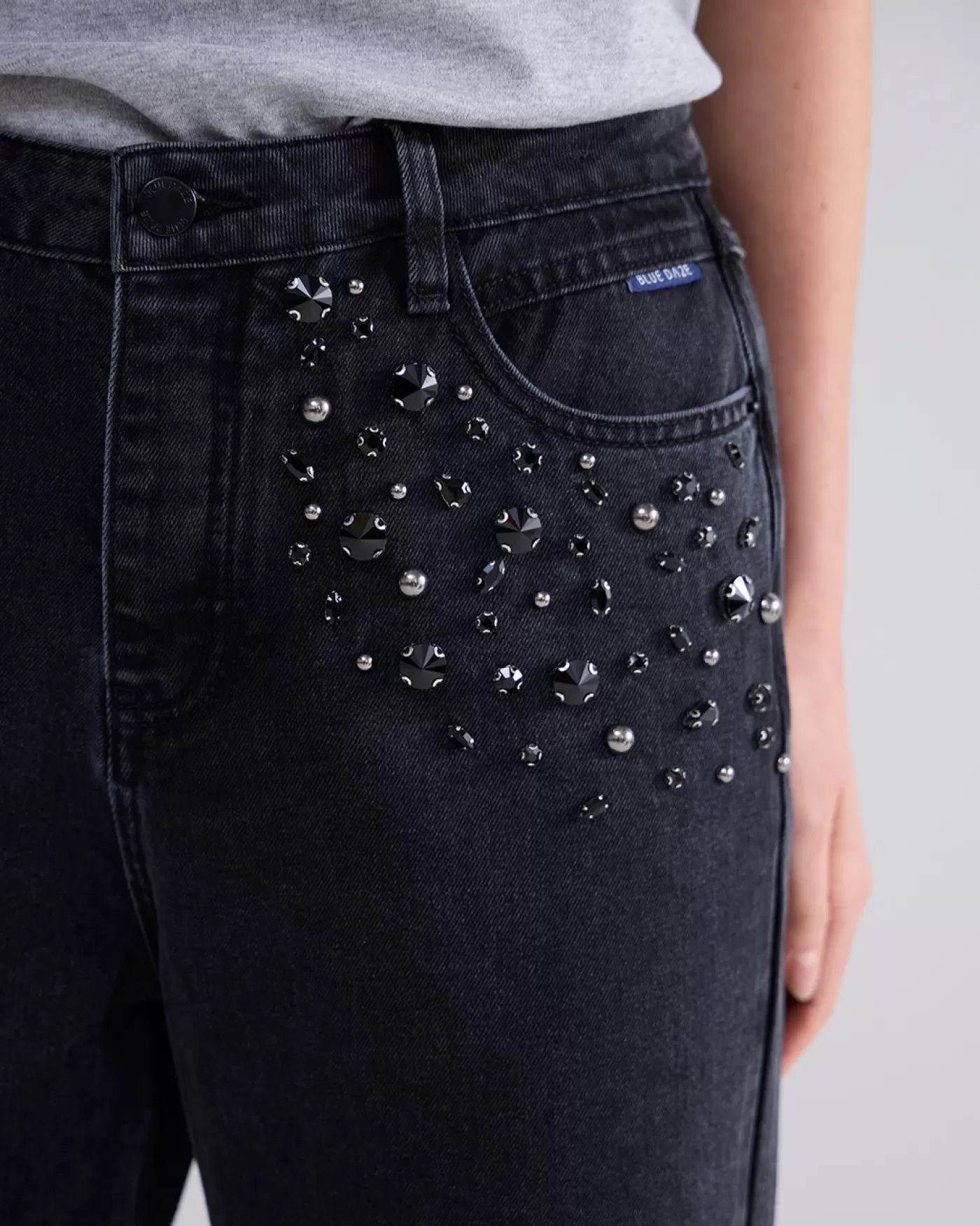 Zwarte mom-fit jeans met een hoge taille en aangesloten fit op de heupen. De broek heeft taps toelopende pijpen en versiering op de steekzakken. mom-fit tapered broekspijpen hoge taille lichte stretch