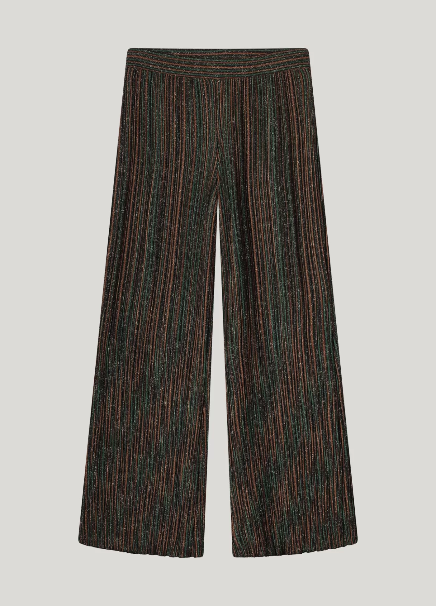Plissé jersey broek met wijde pijpen en een elastische tailleband. De broek heeft een meerkleurig streepdesign voorzien van goudkleurig, glinsterend garen. wijde pijpen elastische tailleband gestreepte plissé jersey goudkleurige garen