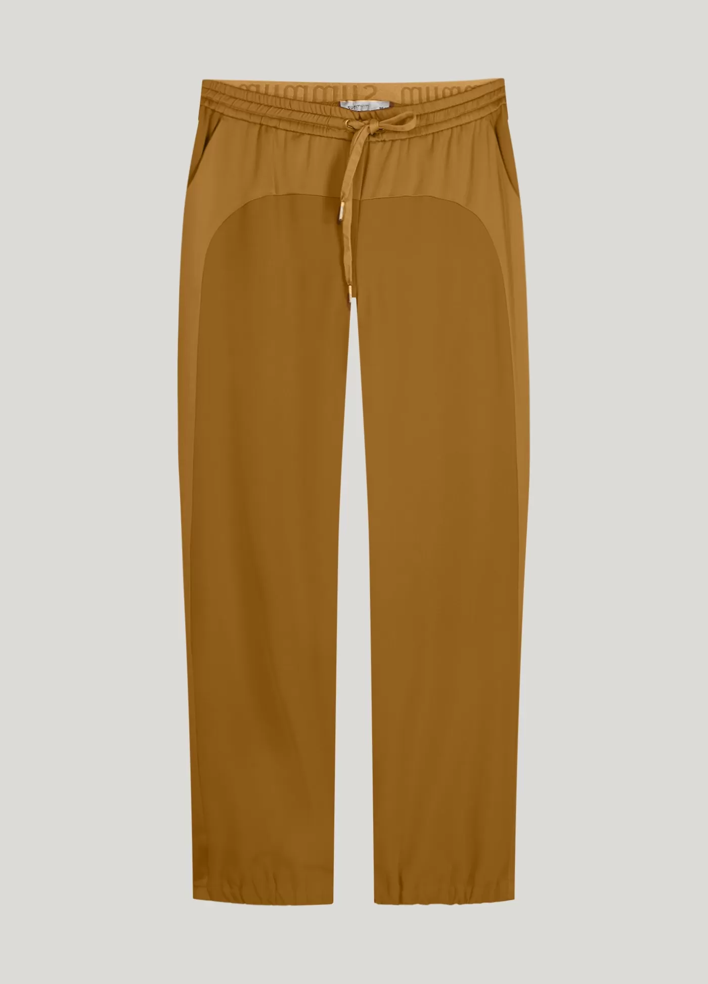 Pofbroek gemaakt van een unieke crêpe viscose blend, waardoor de broek bestaat uit zowel glanzende als matte stof. De broek heeft een elastische tailleband van Summum elastiek en een koordje. elastiek onderaan de pijpen en in taille koordje in de taille steekzakken voor, strookzakken achter glanzende en crêpe stofdetails