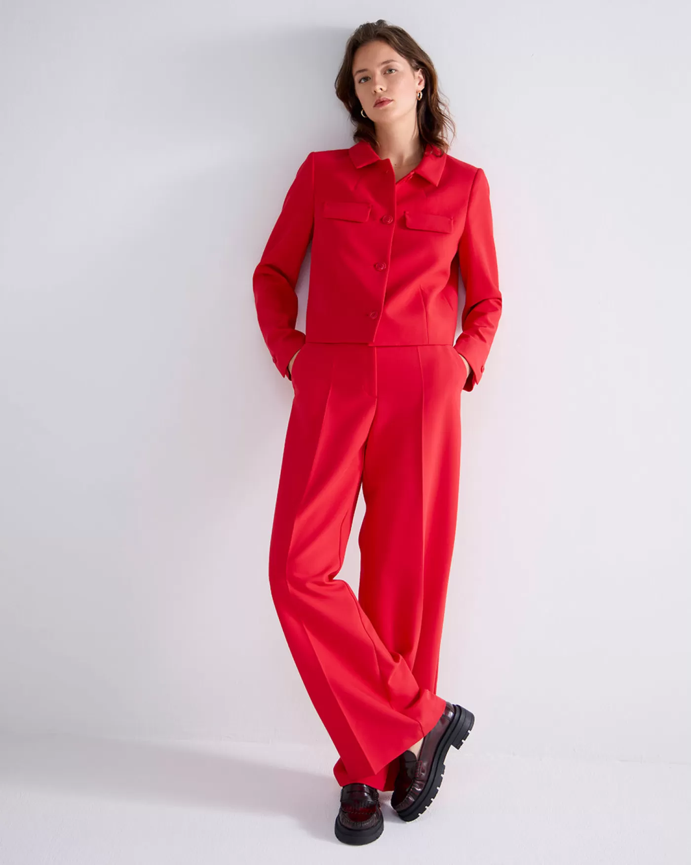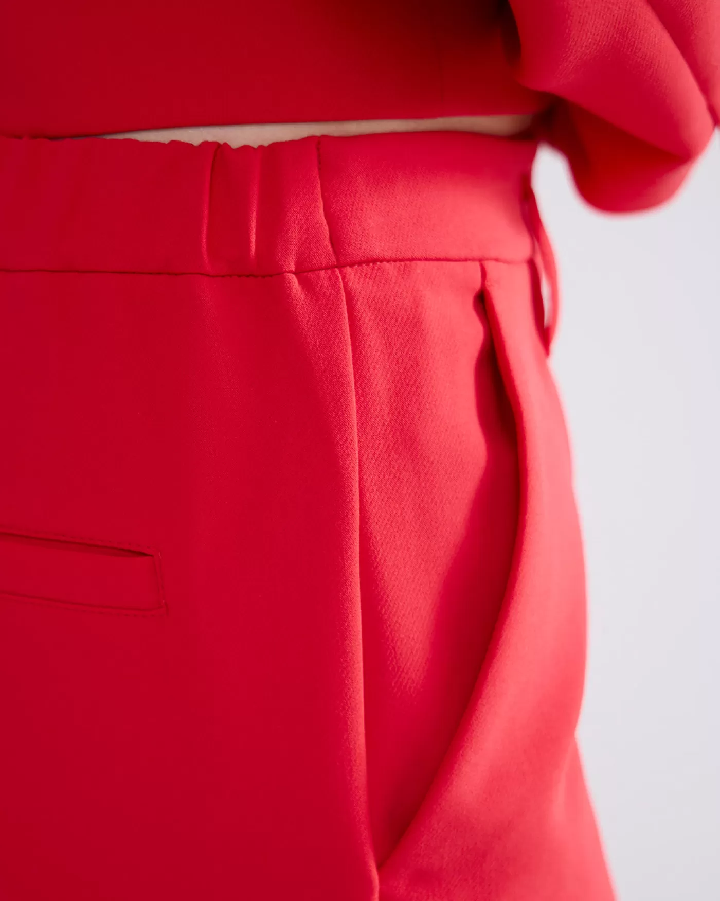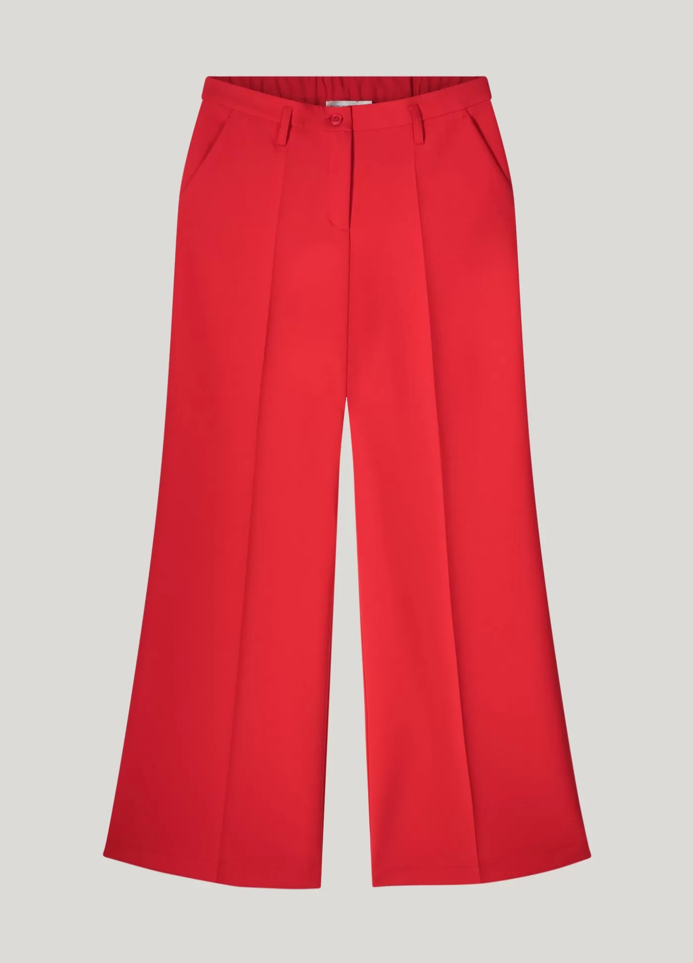 Broek met wijde pijpen, voorzien van steekzakken voor en strookzakken achter. Knoop- en ritssluiting met elastiek in de achterkant van de taille. wijde pijpen steekzakken voor strookzakken achter elastiek in taille