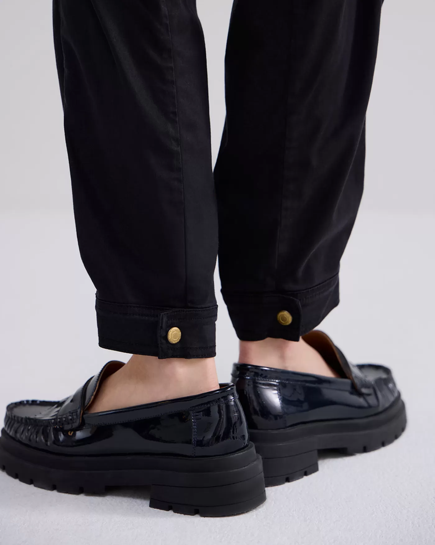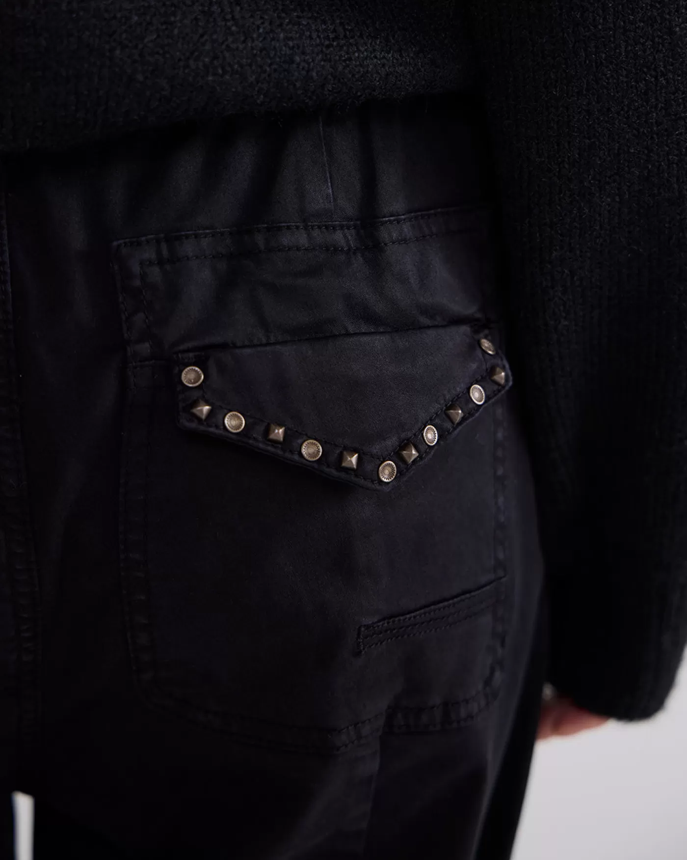 Zachte cargobroek in een stretch kwaliteit en voorzien van studs op de steekzakken. De broekspijpen hebben diagonale naden en de onderkant van de broek heeft een smal boordje met knoop. zachte stretchstof opgestikte cargozakken taps toelopende broekspijpen studs