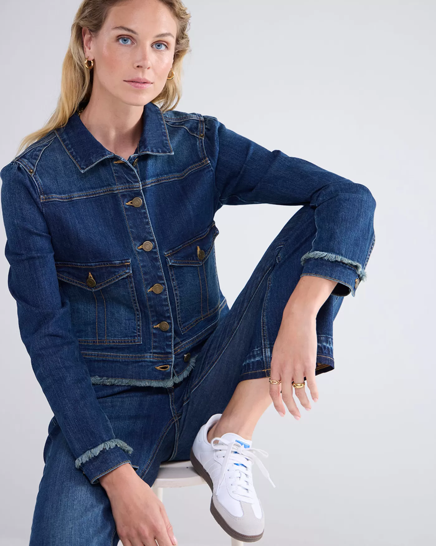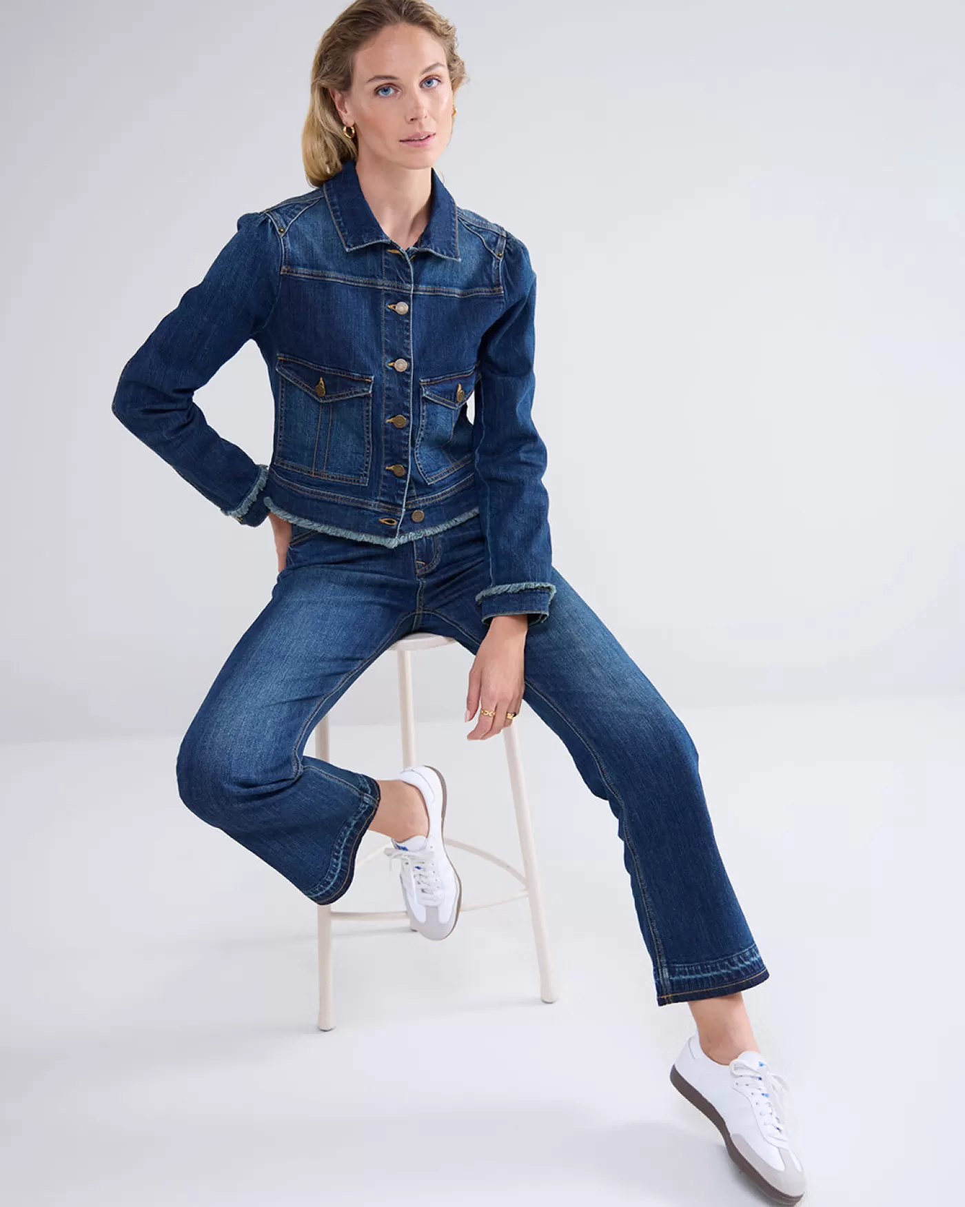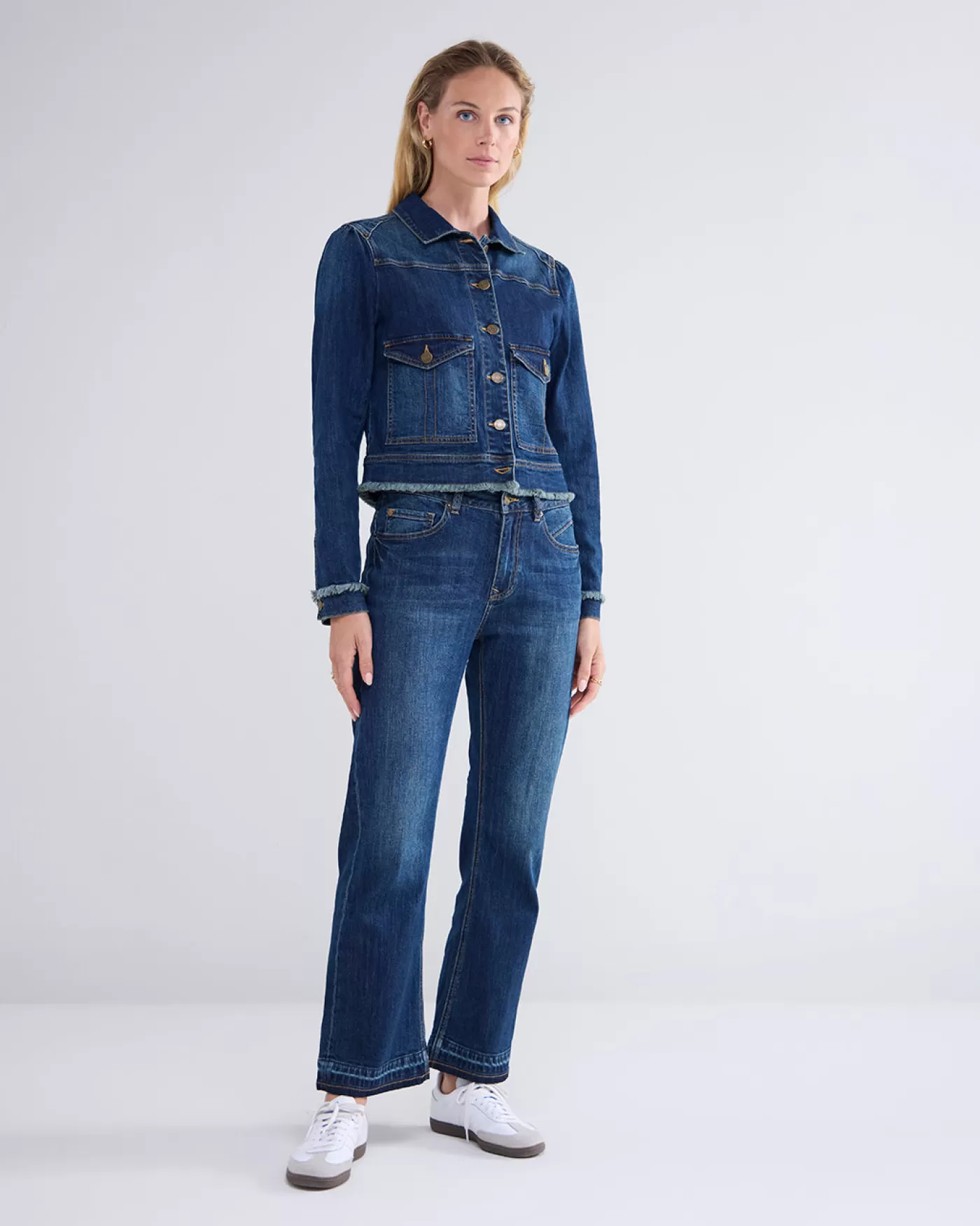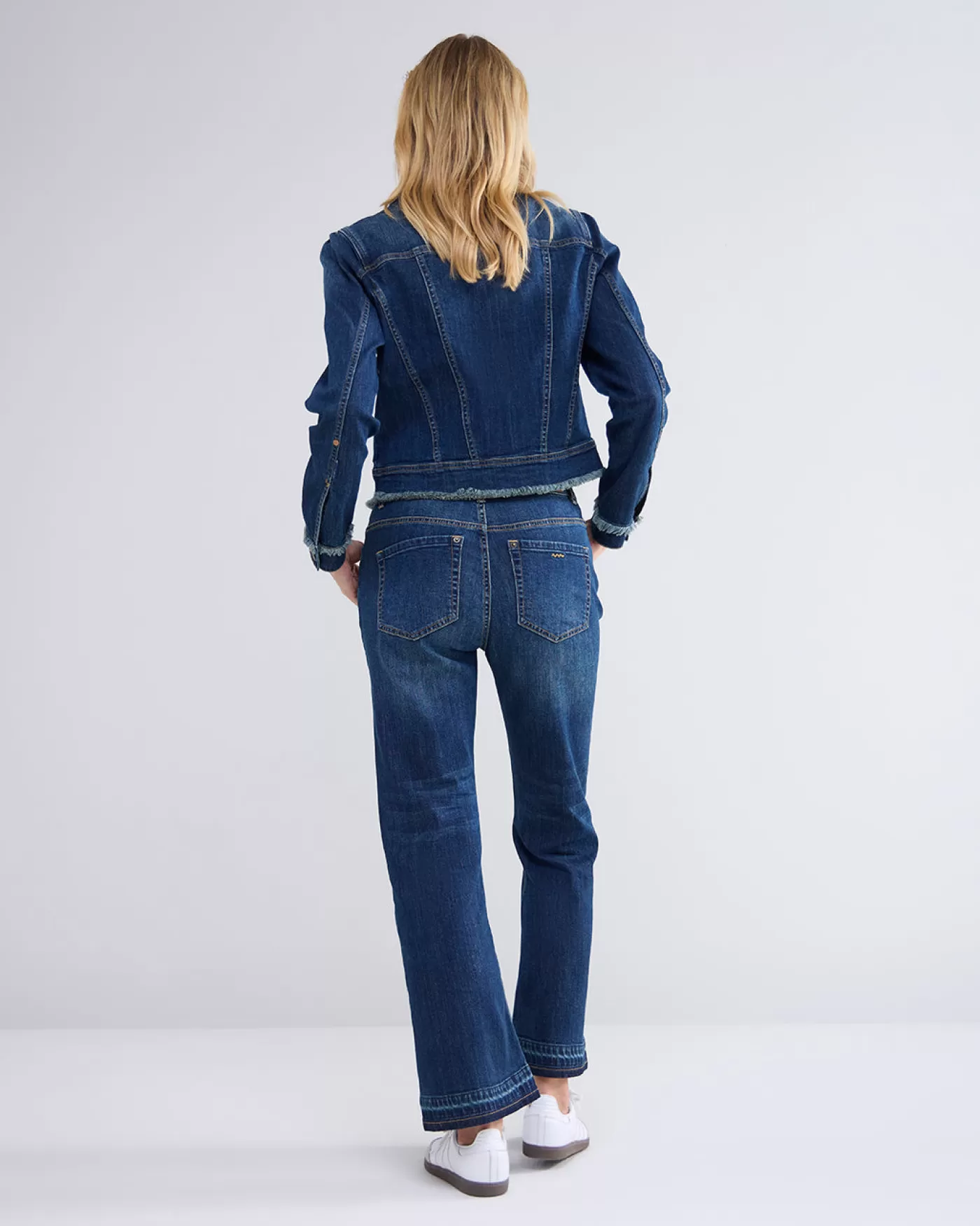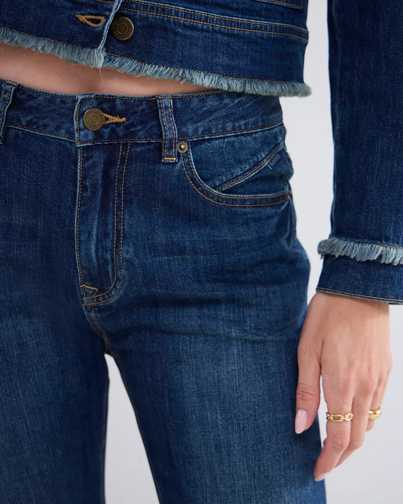 Bootcut cropped jeans met 5 zakken en gemaakt van lichte stretch denim. De jeans heeft een gewassen effect aan de onderkant van de onafgewerkte pijpen en een gulp met rits. bootcut fit lichte stretch denim onafgewerkte pijpen gulp met rits