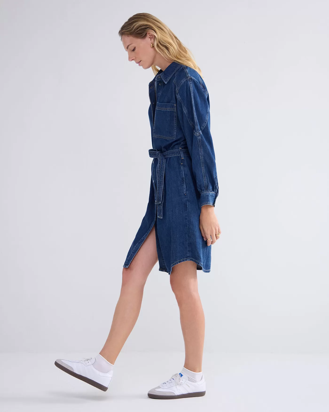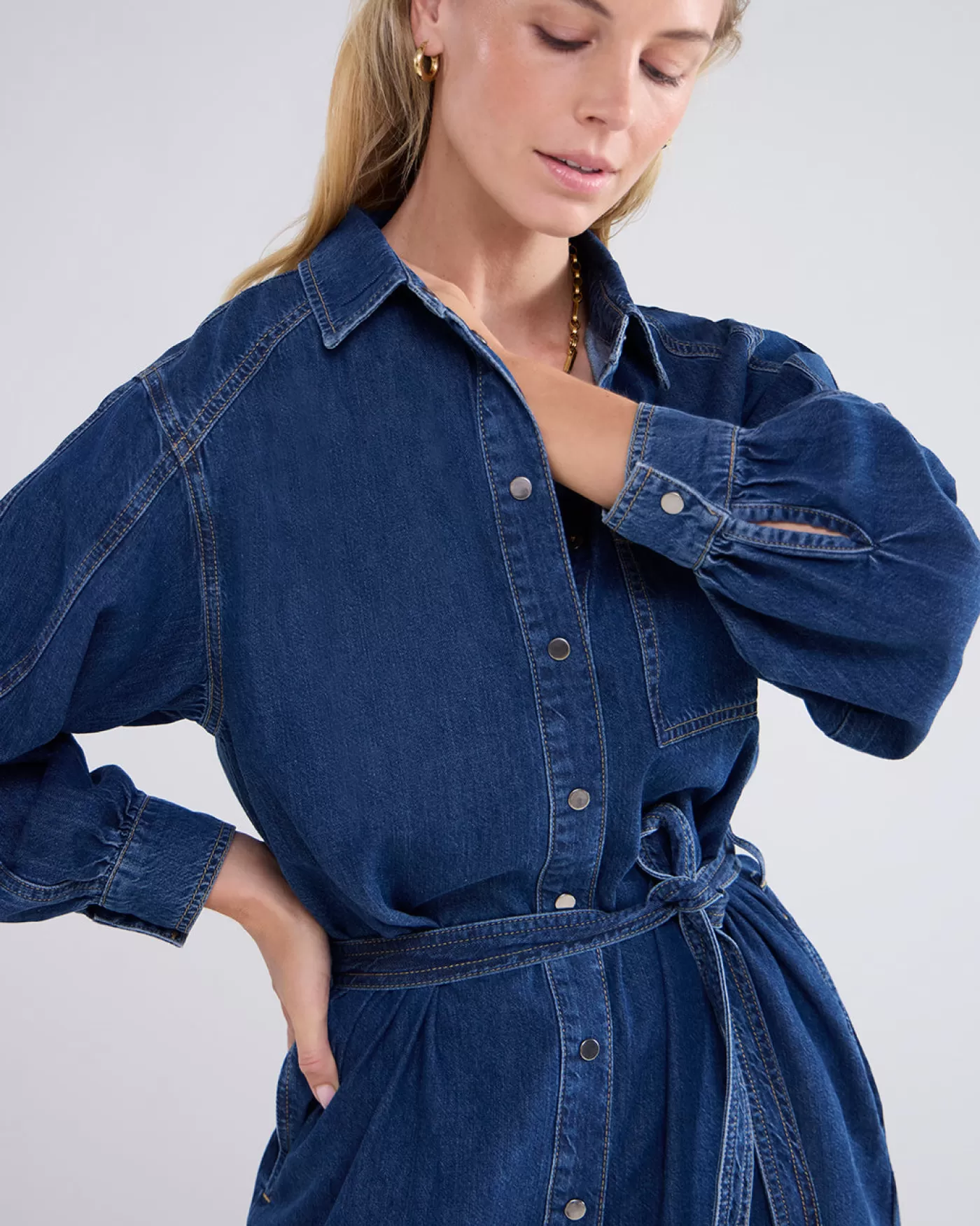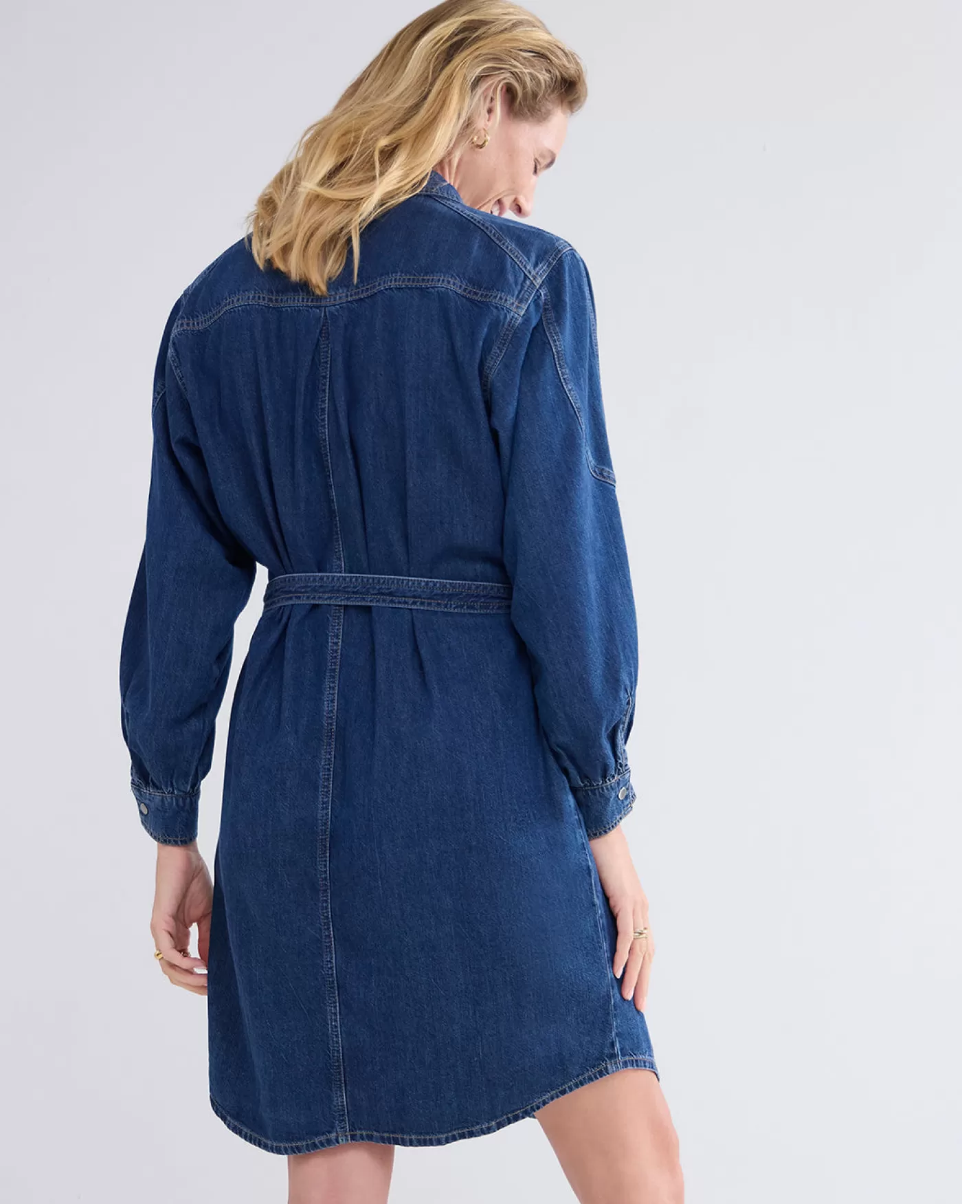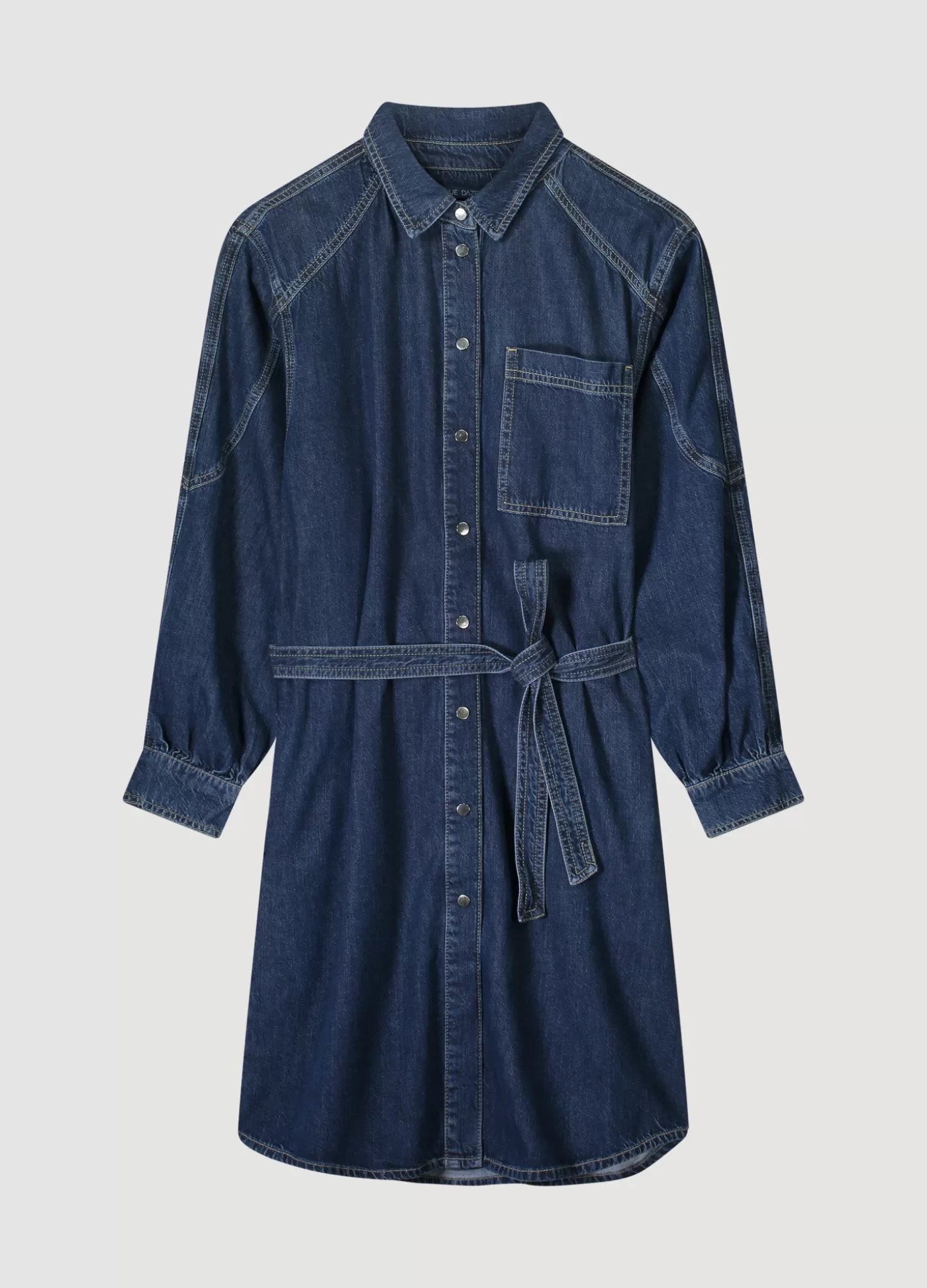 Denim overhemdjurk van soepele non-stretch denim. De jurk heeft drukknopen aan de voorkant en een bijpassende ceintuur i…