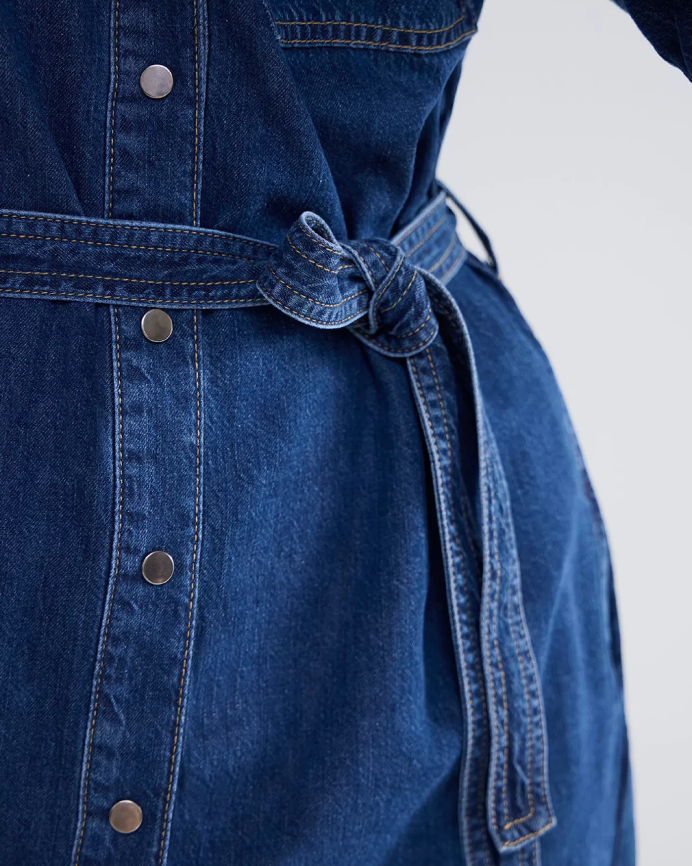 Denim overhemdjurk van soepele non-stretch denim. De jurk heeft drukknopen aan de voorkant en een bijpassende ceintuur in de taille. shirt dress non-stretch denim bijpassende ceintuur drukknopen