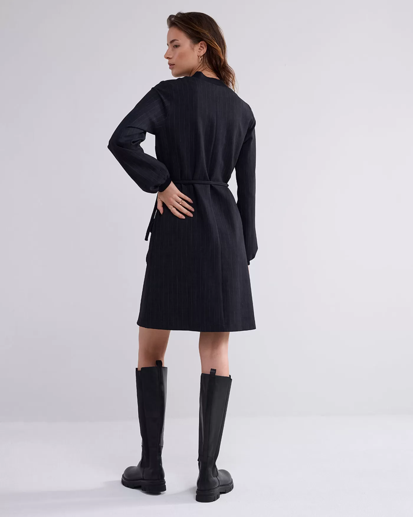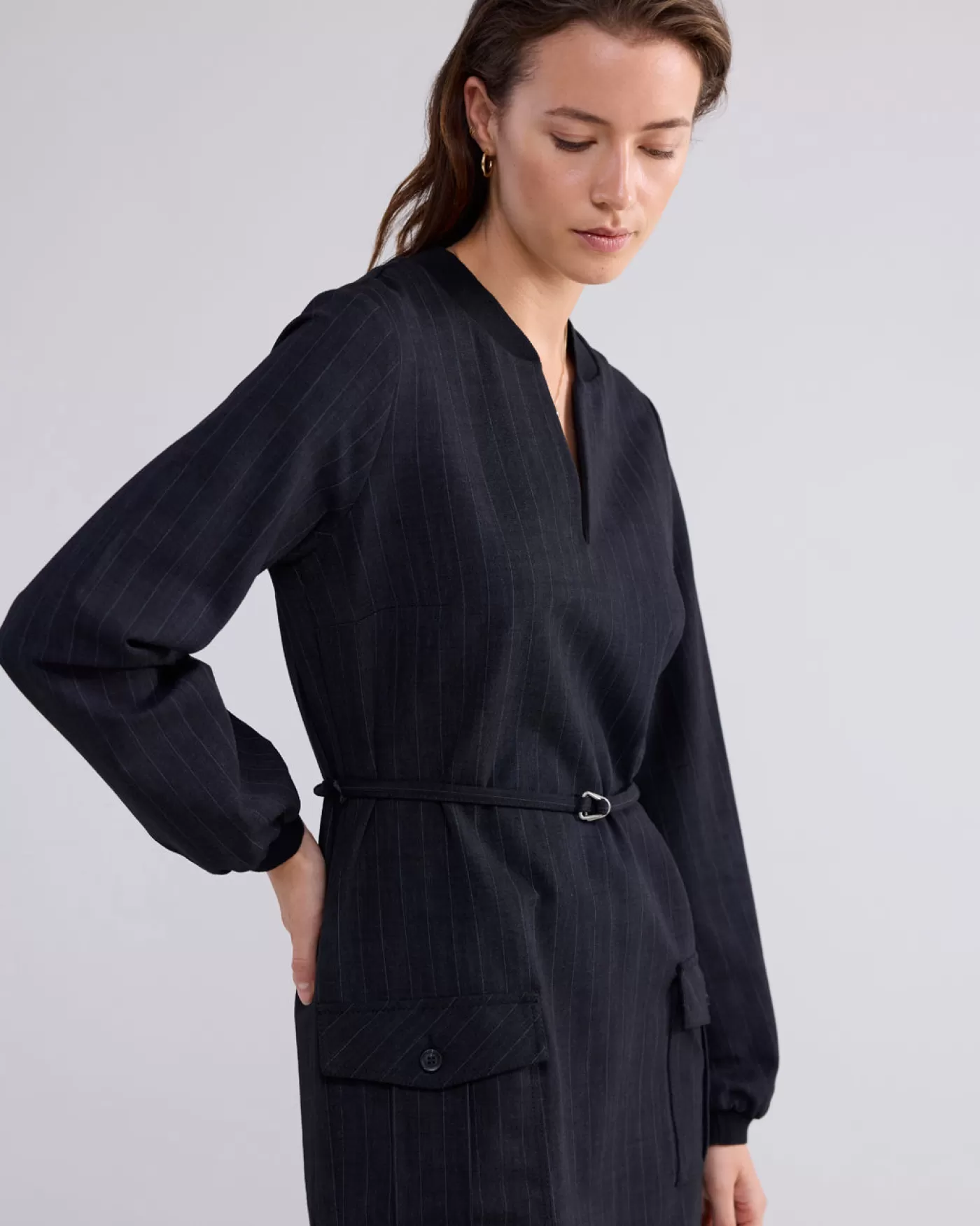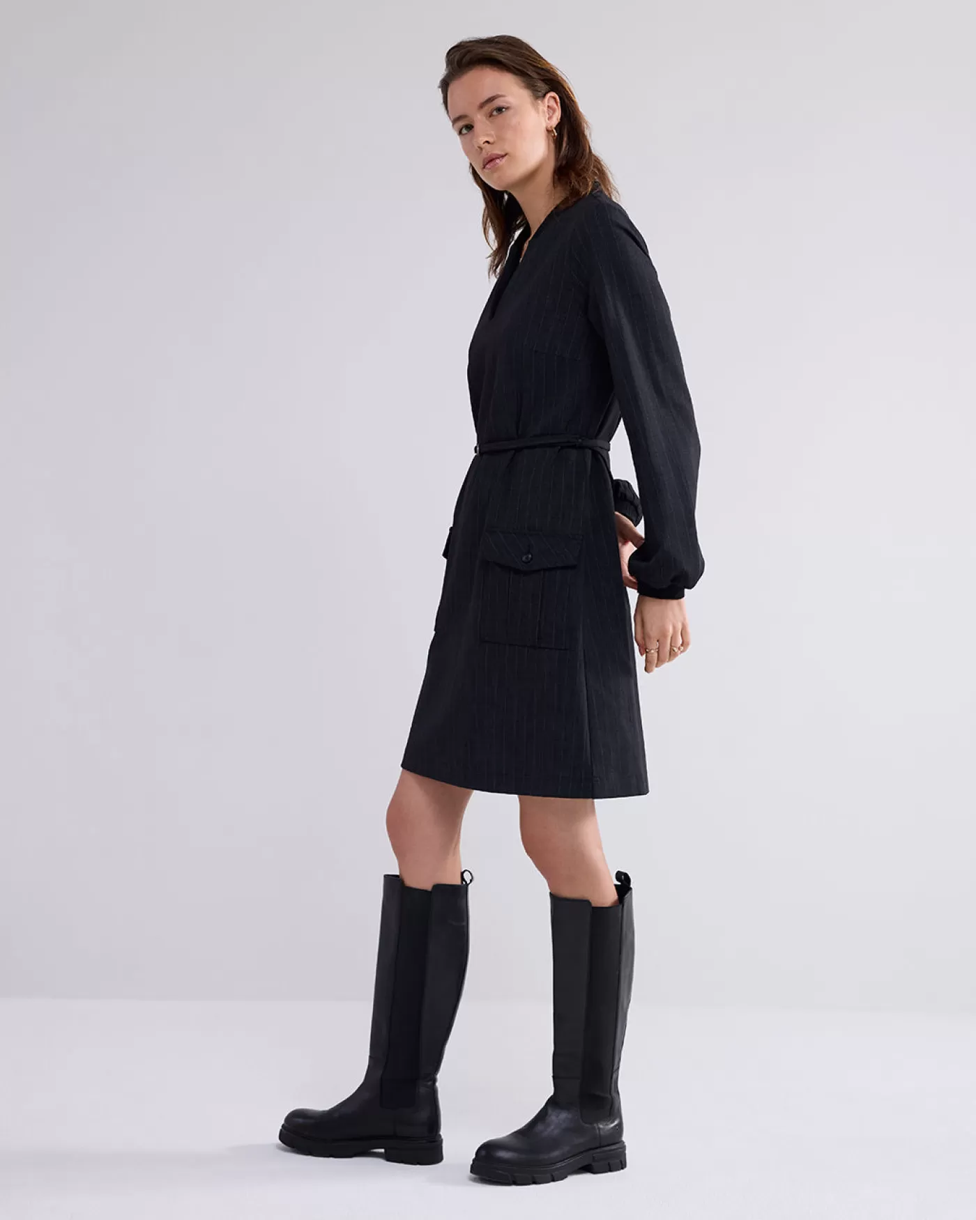 Krijtstreep jurk tot op de knie en kraag met split. De jurk is voorzien van een stoffen ceintuur in de taille en twee opgestikte zakken met klep aan de voorkant. knielang krijtstreep kraag met split stoffen ceintuur