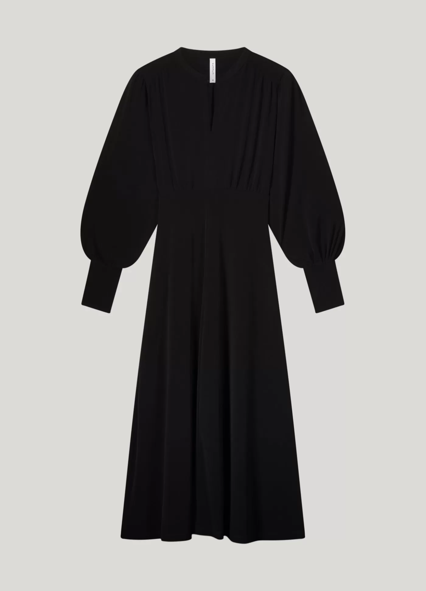 Lange jurk met ballonmouwen en brede manchetten. De jersey jurk heeft een ronde hals met split en ritssluiting en loopt wijd uit. lange ballonmouwen ronde hals met split wijduitlopend jersey crêpe kwaliteit