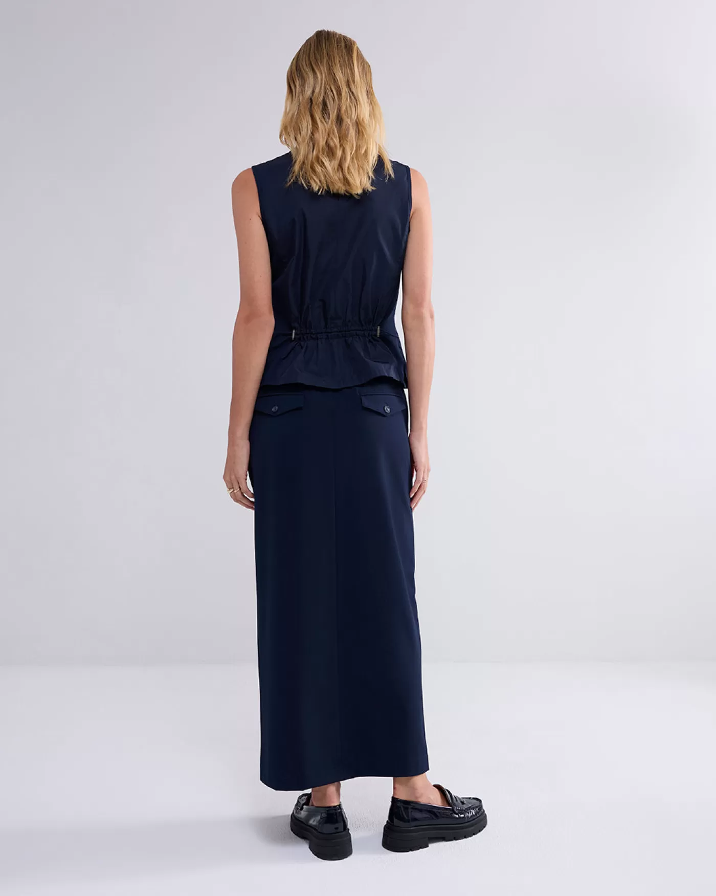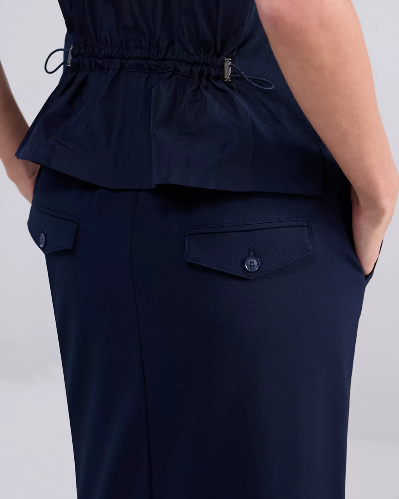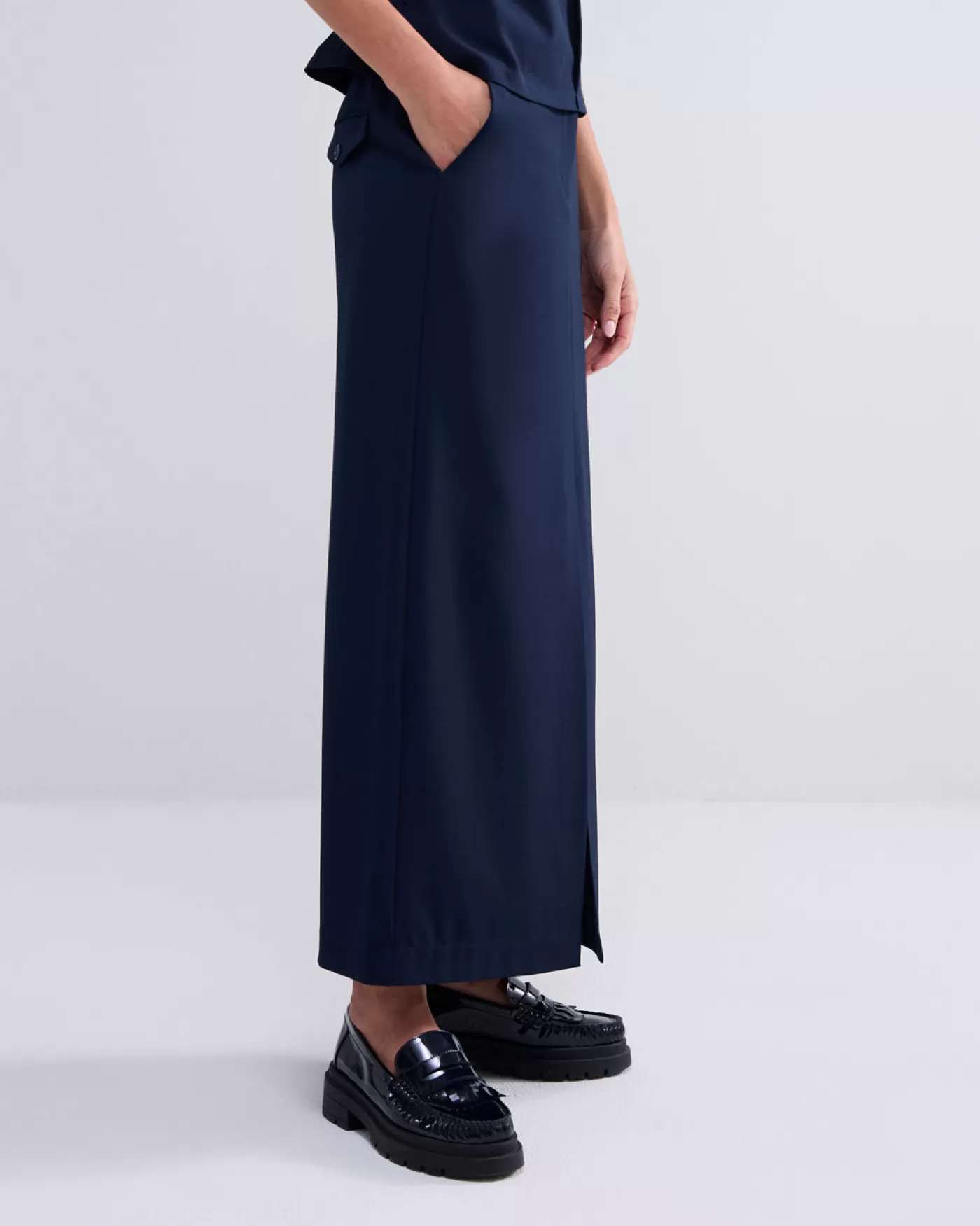 Lange pencil rok met hoge split middenvoor en elastische tailleband achter. De rok is voorzien van steekzakken voor en een paspelzak met klep achter. lange pencil rok hoge split elastische tailleband steekzakken voor