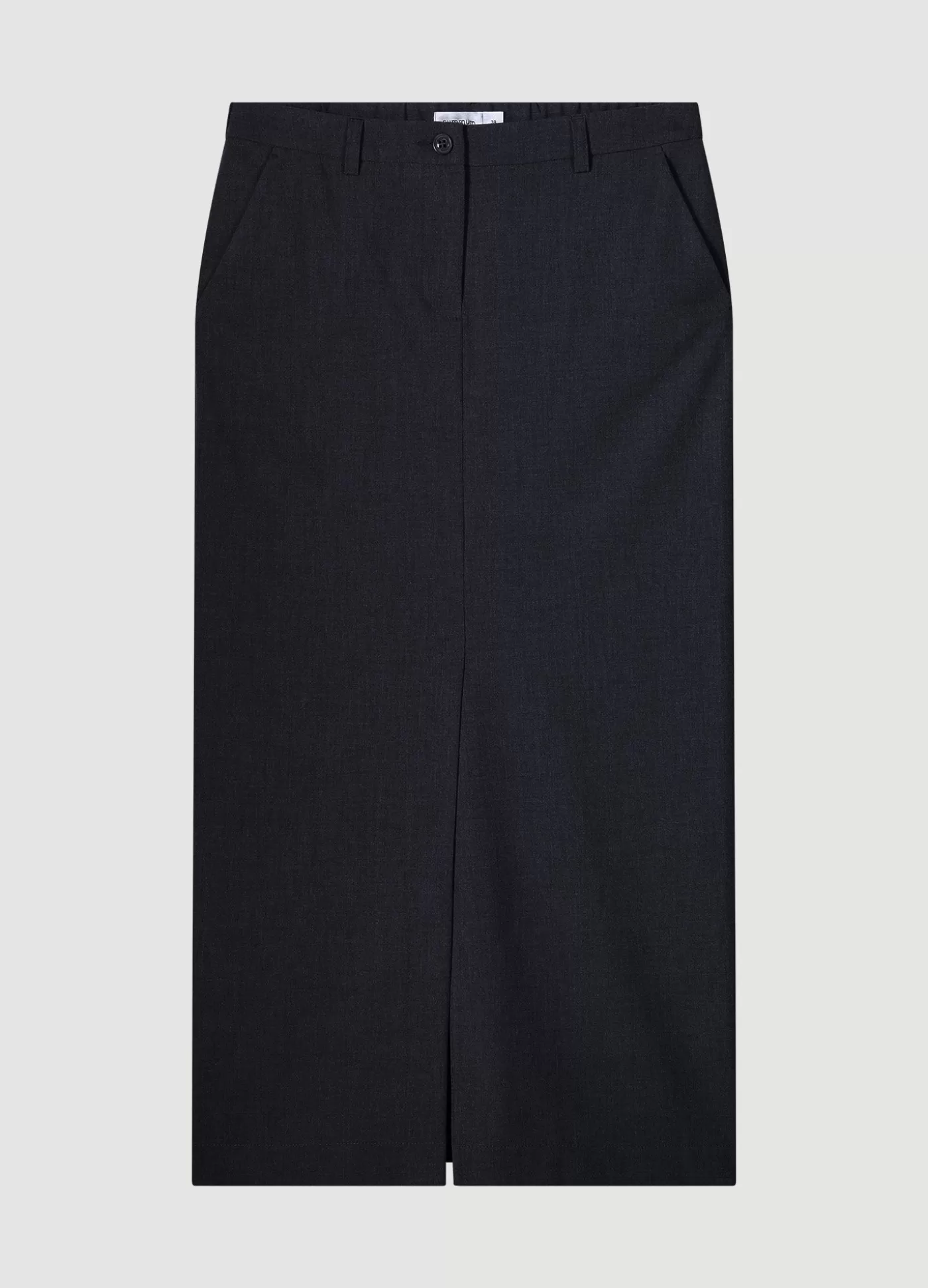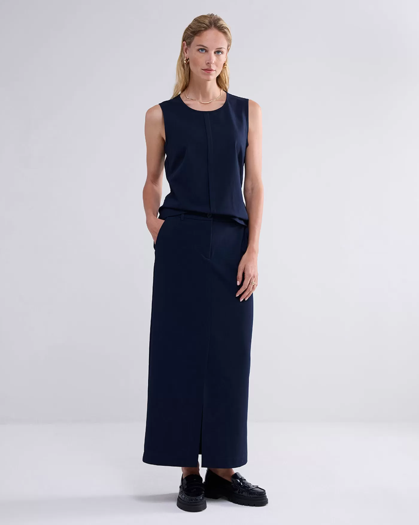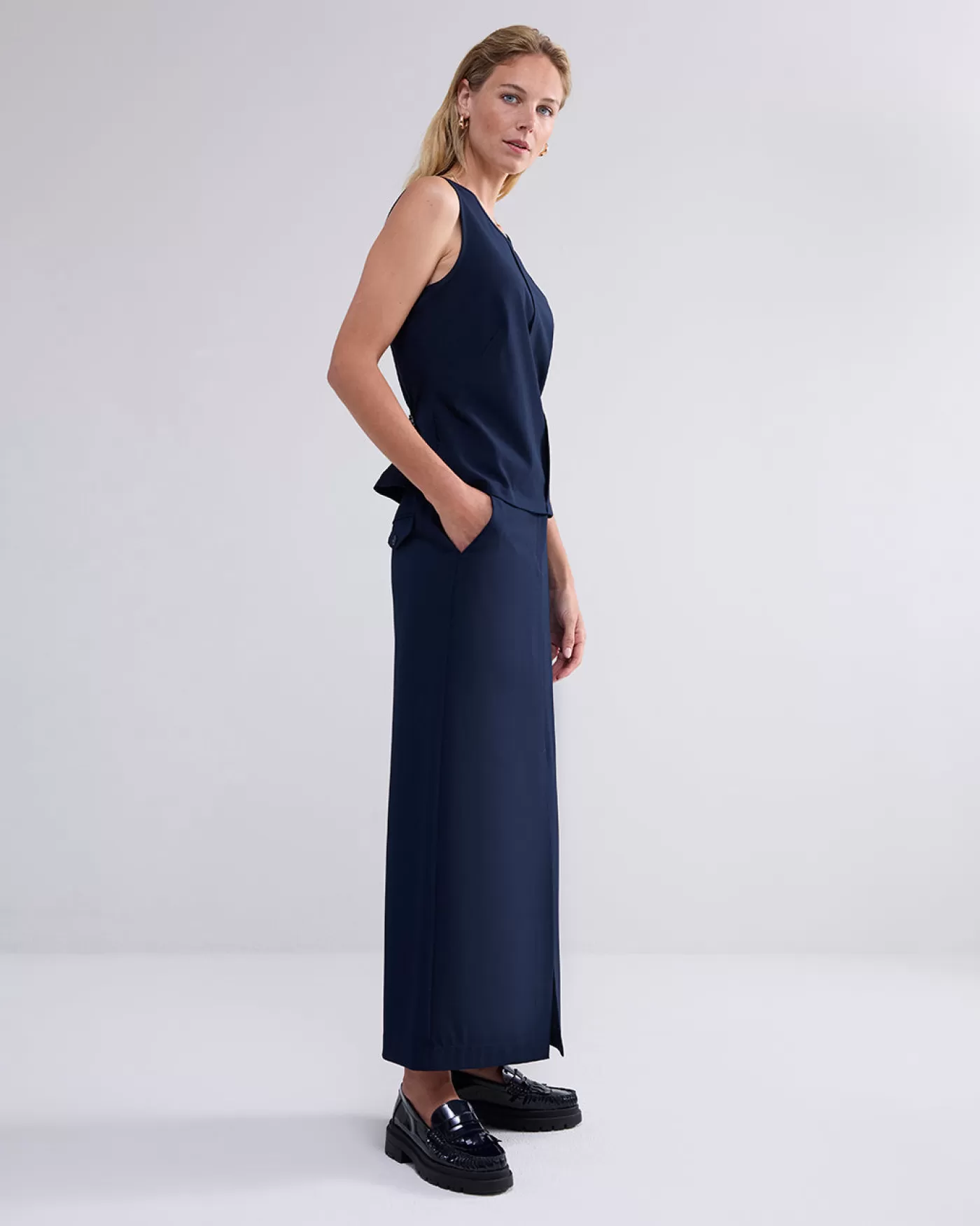 Lange pencil rok met hoge split middenvoor en elastische tailleband achter. De rok is voorzien van steekzakken voor en een paspelzak met klep achter. lange pencil rok hoge split elastische tailleband steekzakken voor
