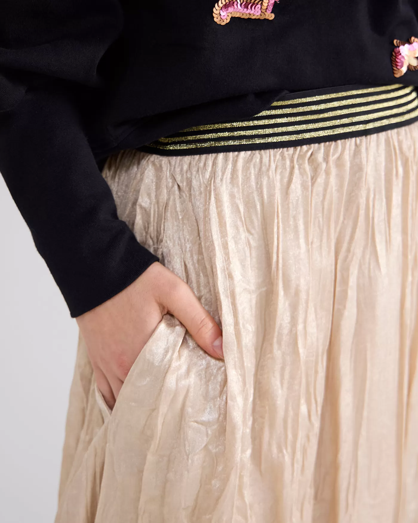Metallic rok tot onder de knie, uitgevoerd in een glanzend, gekreukelde stof met goudkleurige tint. De rok heeft een gestreepte elastische tailleband. valt onder de knie gestreepte elastische tailleband gekreukelde look glanzende afwerking