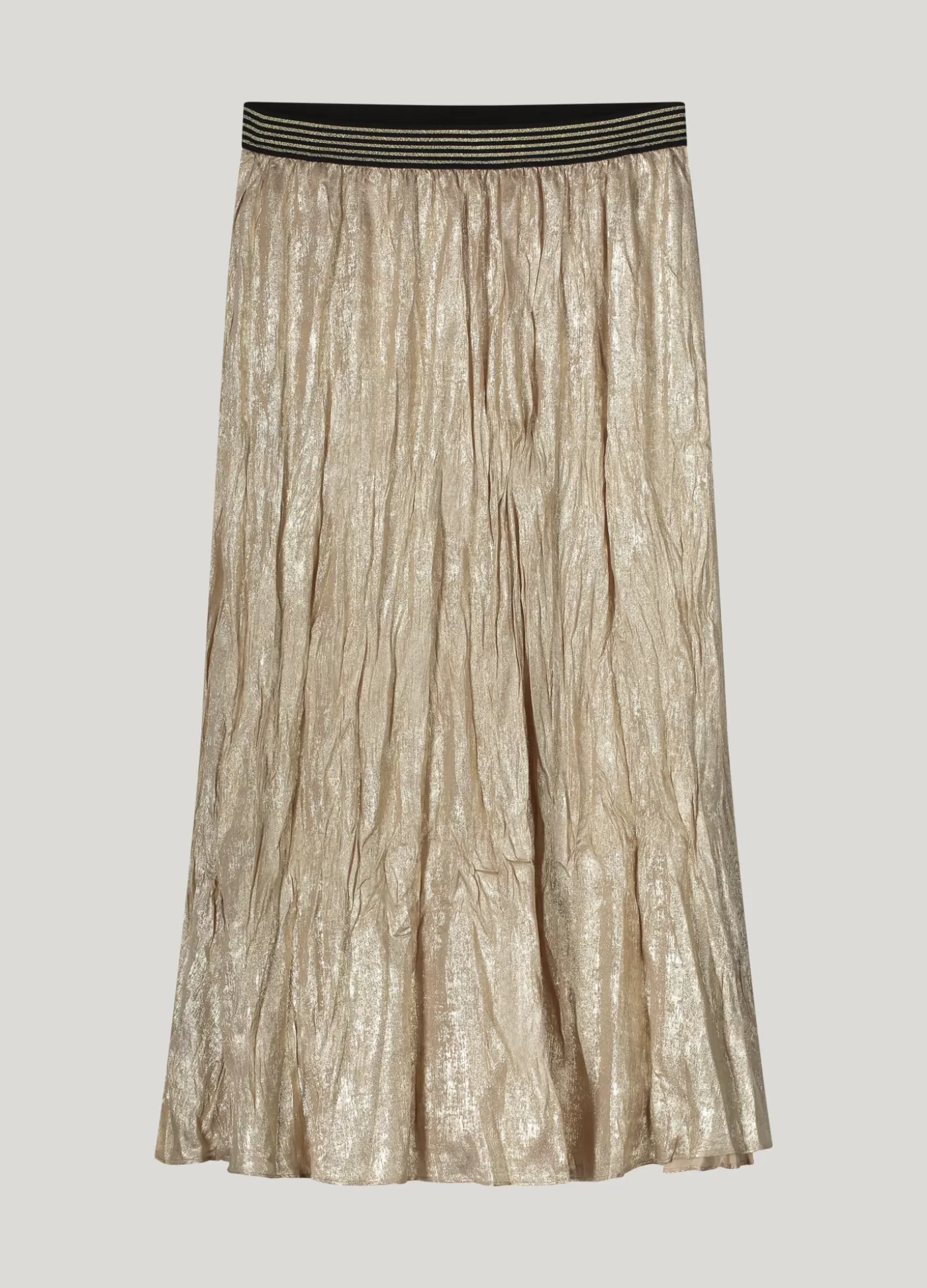 Metallic rok tot onder de knie, uitgevoerd in een glanzend, gekreukelde stof met goudkleurige tint. De rok heeft een ges…