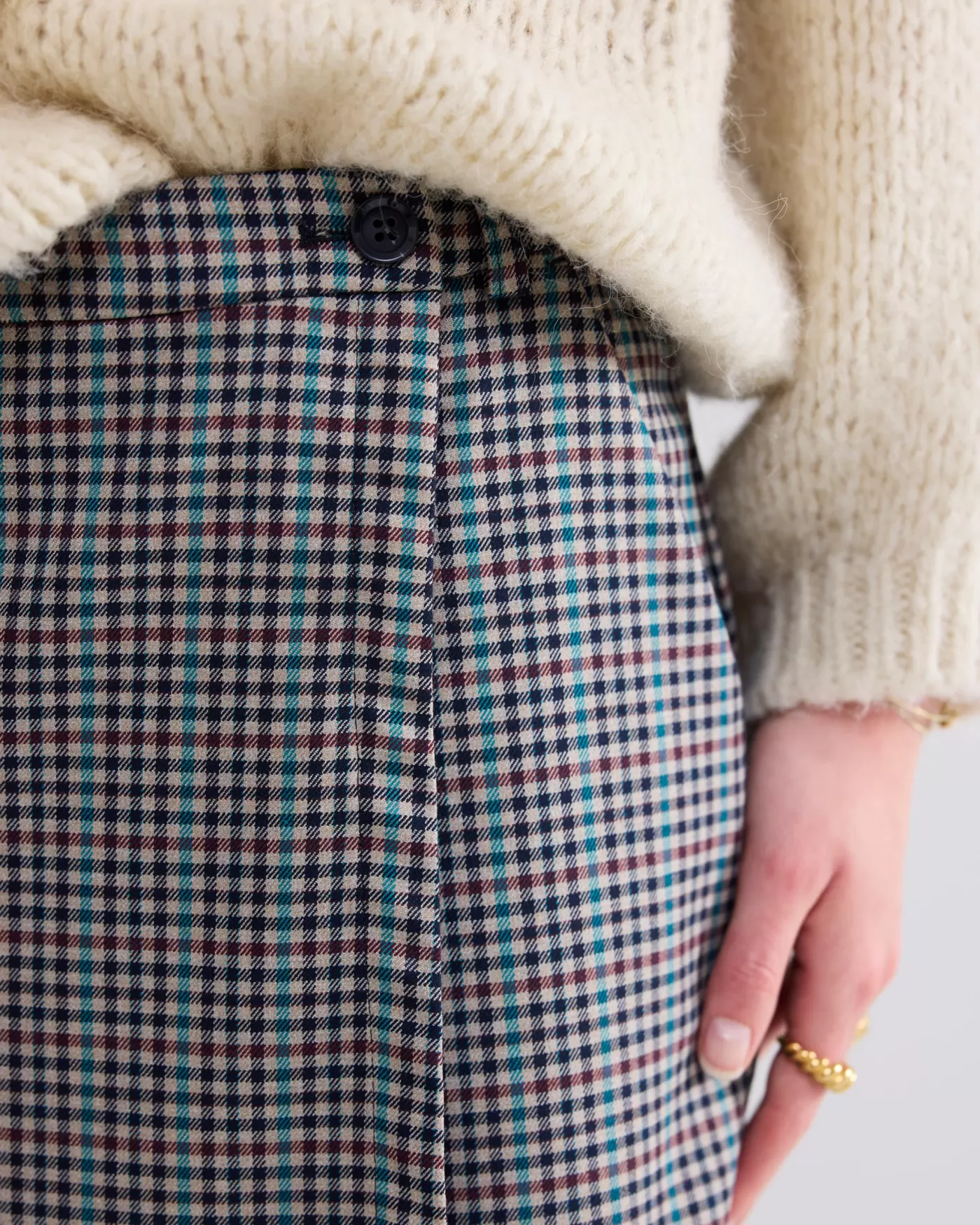 Korte omslagrok met een multicolour ruitjesprint. De rok heeft een knoopsluiting in de taille en steekzakken. Ruitjesprint elastiek in de tailleband achter knoopsluiting in de taille Steekzakken